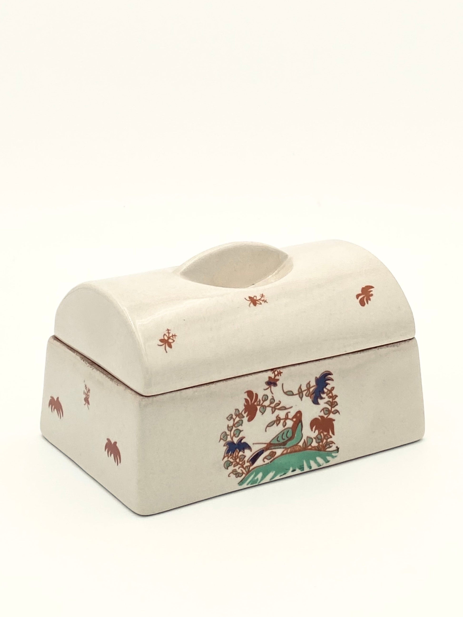Oud, keramiek doosje met vogels en blaadjes. Een schatkistje om bijvoorbeeld je sieraden in te bewaren, op je bureau als paperclipverzamelaar of je gebruik het doosje als super knappe botervloot.