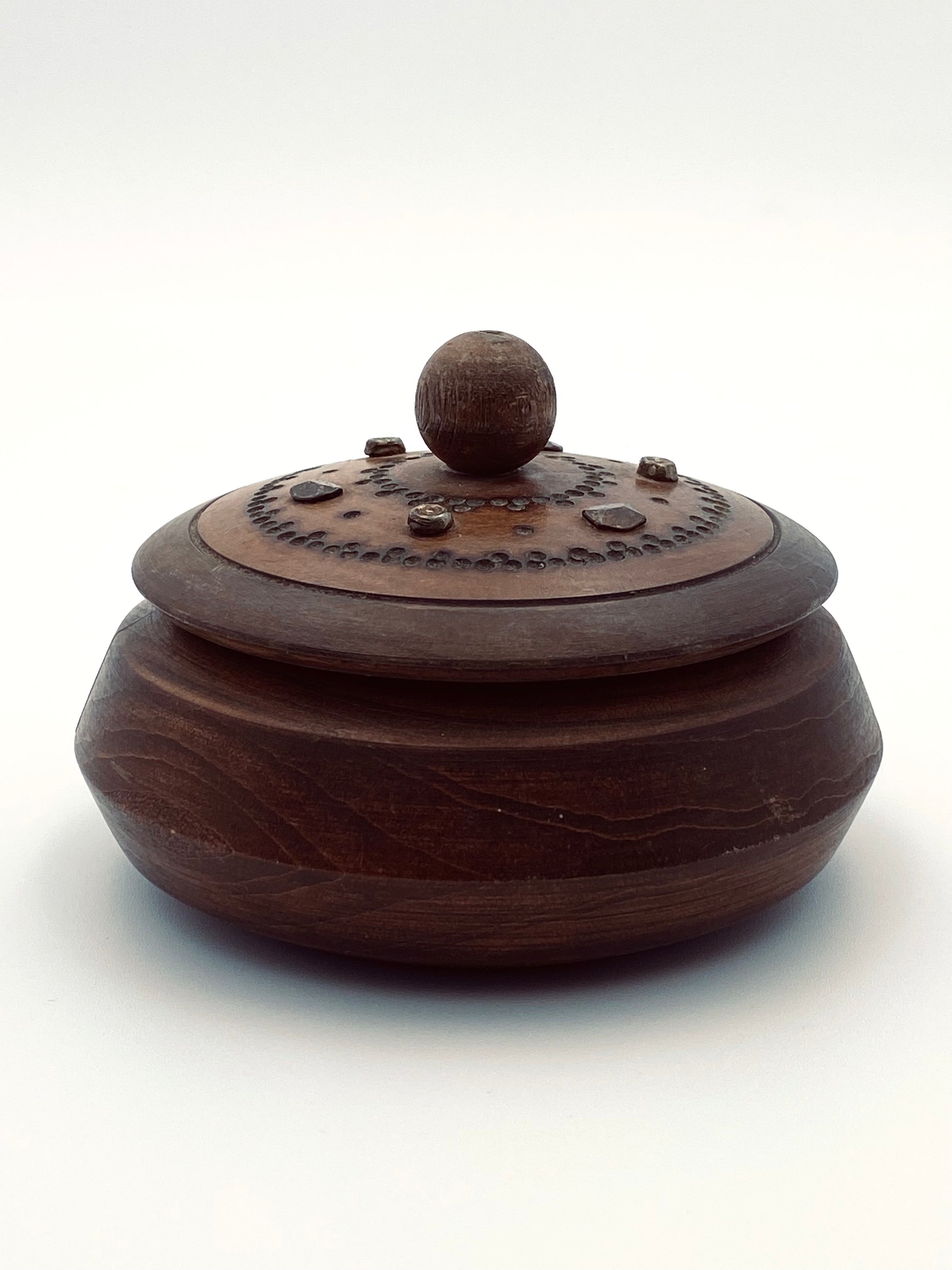 Mooi, oud bewerkt en met metalen studs gedecoreerd houten doosje met deksel. Handig om je schatten in te bewaren of als pronkstuk op tafel te zetten.