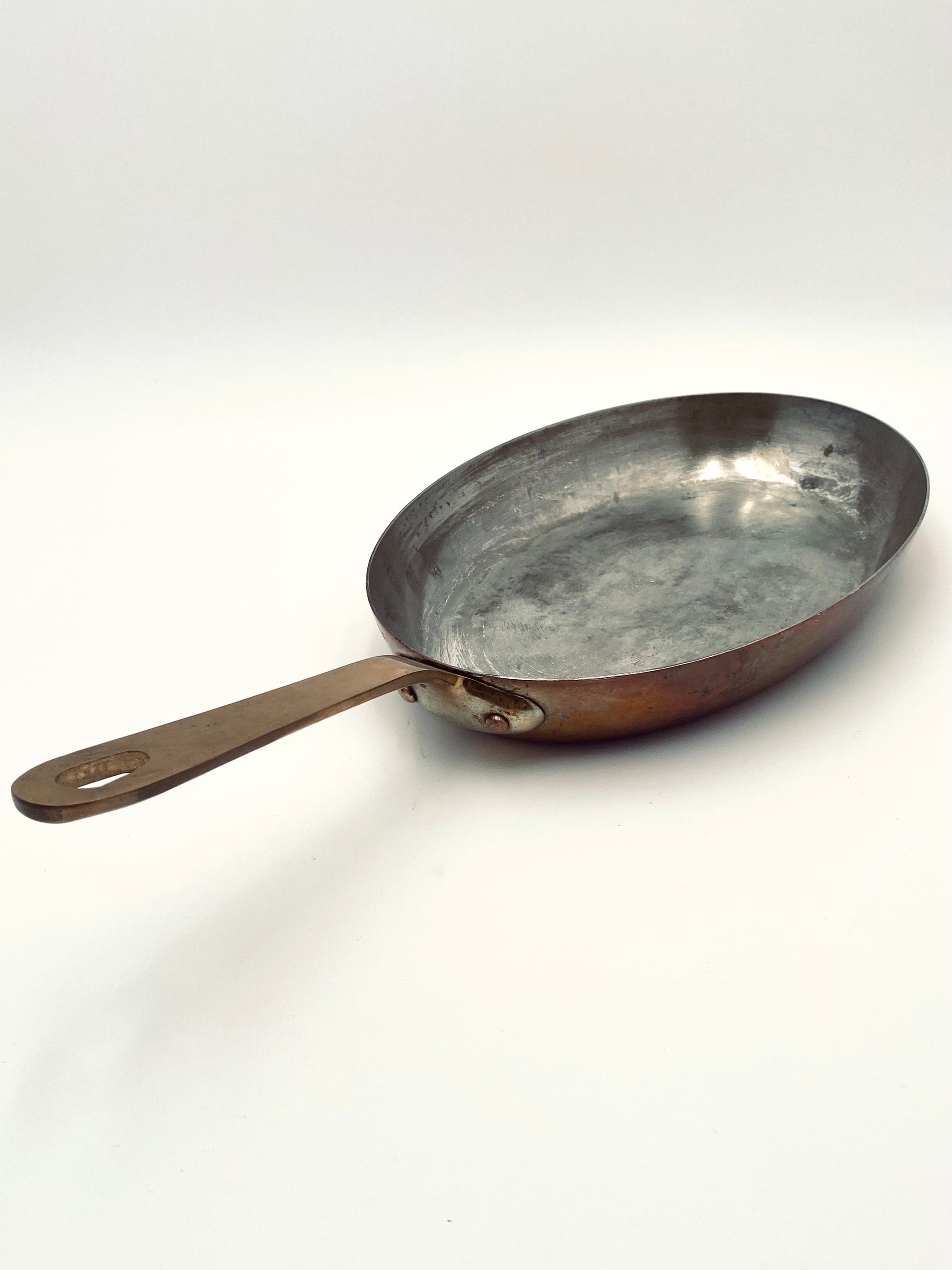 Weet je waarom koperen pannen zo geliefd zijn bij echte koks? Zowel de bodem als de zijkanten van de pan worden gelijkmatig warm. Dat snelle opwarmen én afkoelen is ideaal om bijvoorbeeld sauzen, jam en risotto in te bereiden. En ja, het liefst wil je de keukenmuur vol met die pannen in alle maten, maar je kan altijd beginnen met één pan zoals dit, oude, verkoperde exemplaar met een lengte van 30cm (handvat niet meegerekend), een doorsnede van 20cm en een hoogte van 4cm. Wel de perfecte maat om o.a. visjes in te bakken.
