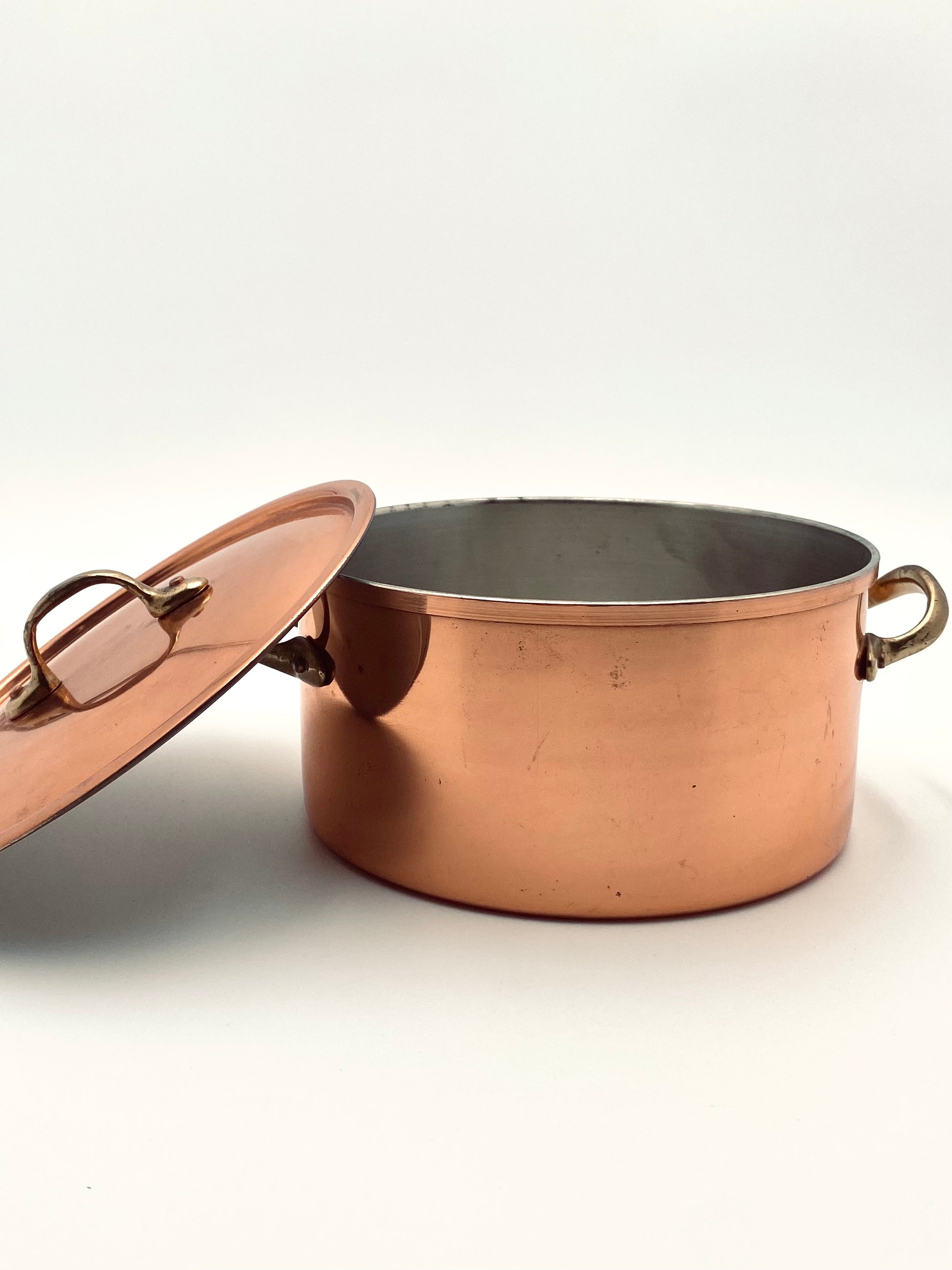 Weet je waarom koperen pannen zo geliefd zijn bij echte koks? Zowel de bodem als de zijkanten van de pan worden gelijkmatig warm. Dat snelle opwarmen én afkoelen is ideaal om bijvoorbeeld sauzen, jam en risotto in te bereiden. En ja, het liefst wil je de keukenmuur vol met die pannen in alle maten, maar je kan altijd beginnen met één klein pannetje zoals deze. Dit verkoperde exemplaar heeft een doorsnede van 17 cm en een hoogte van 8cm.