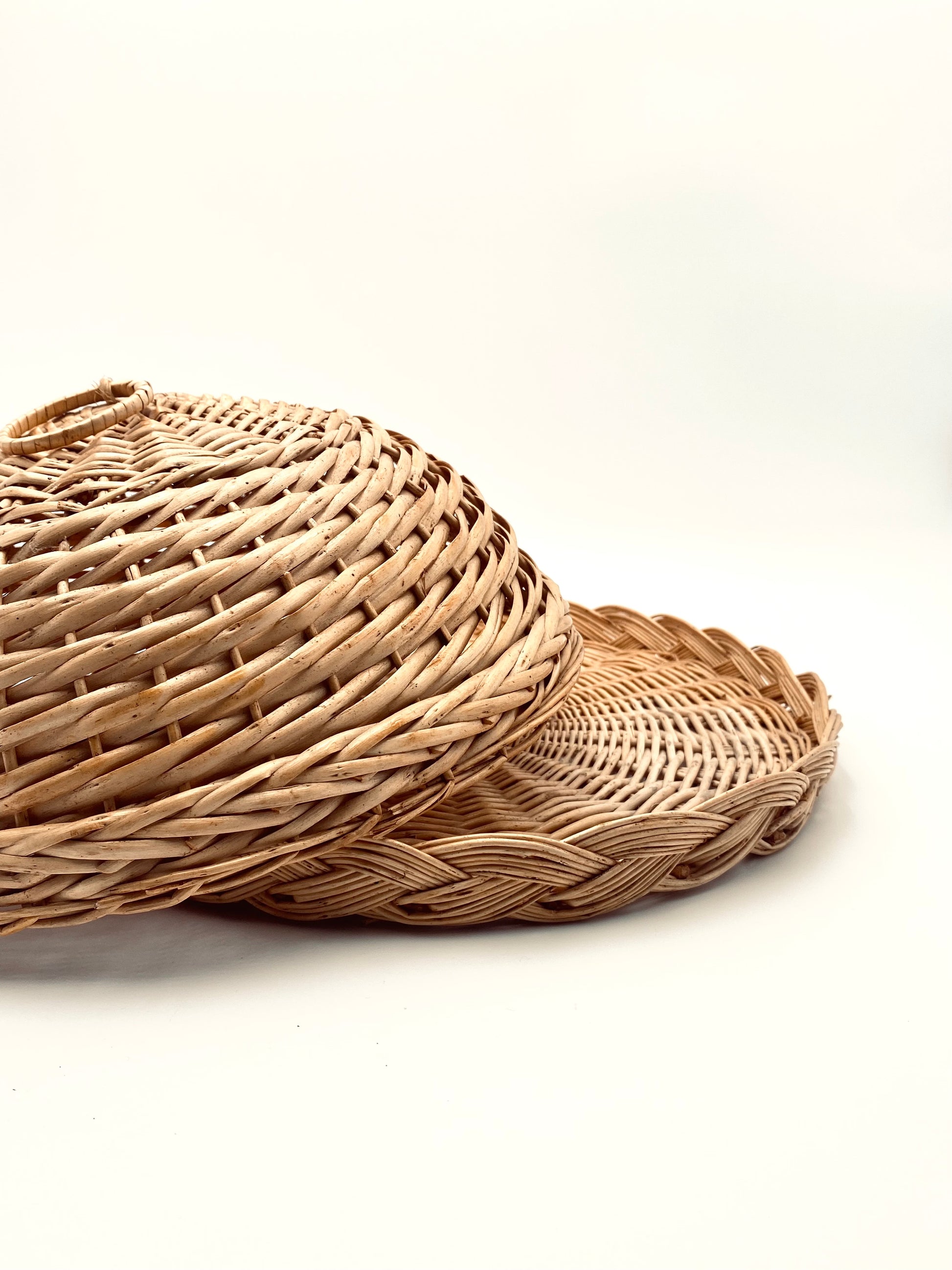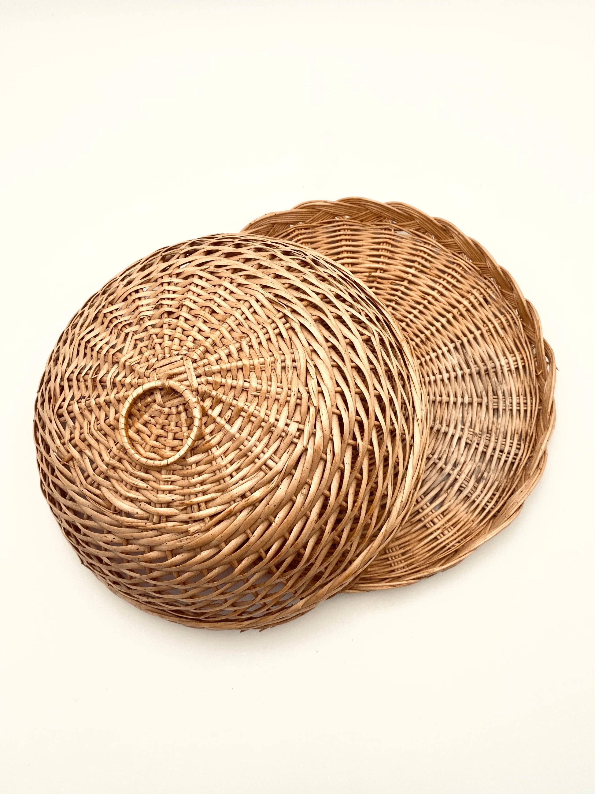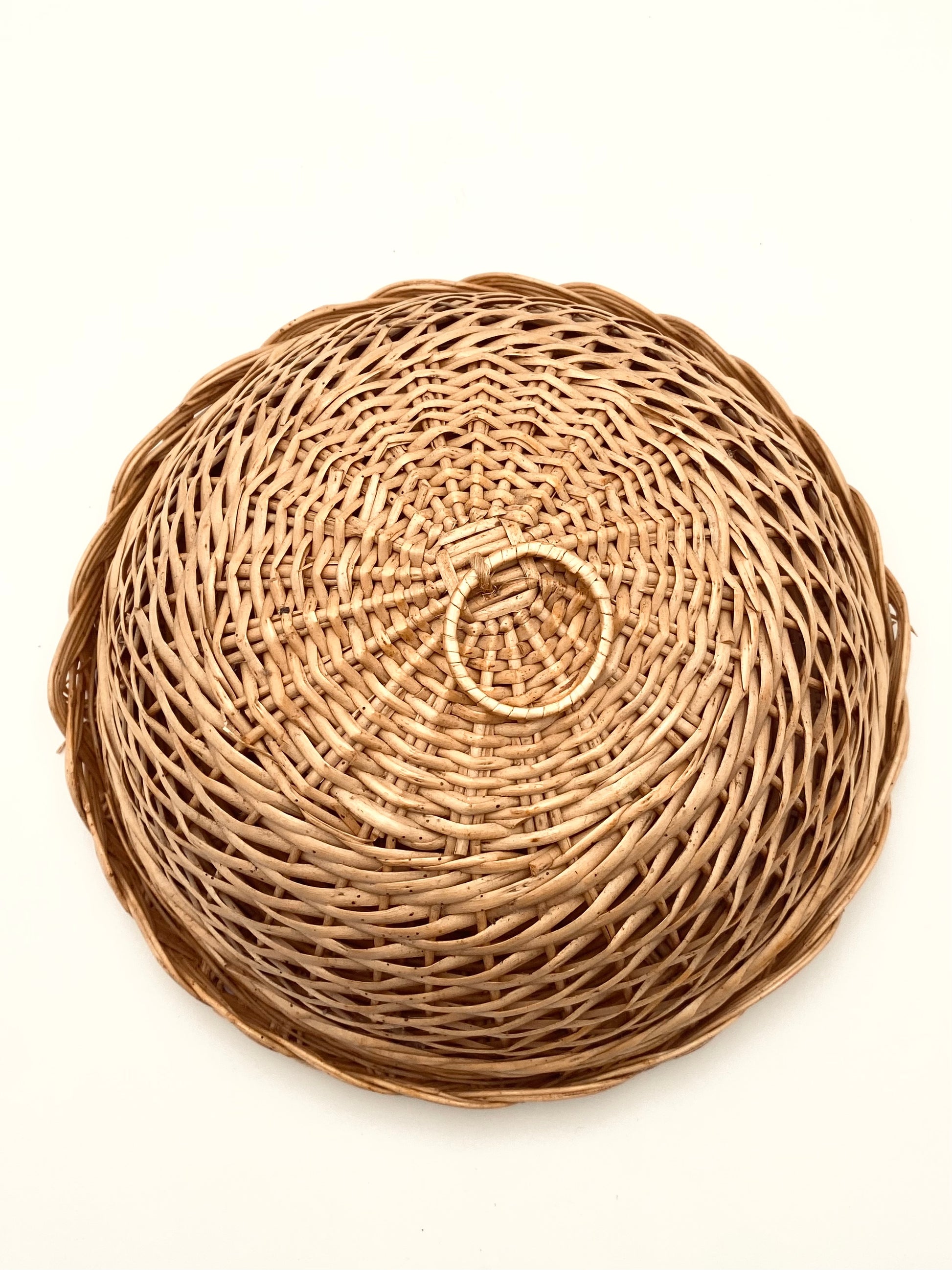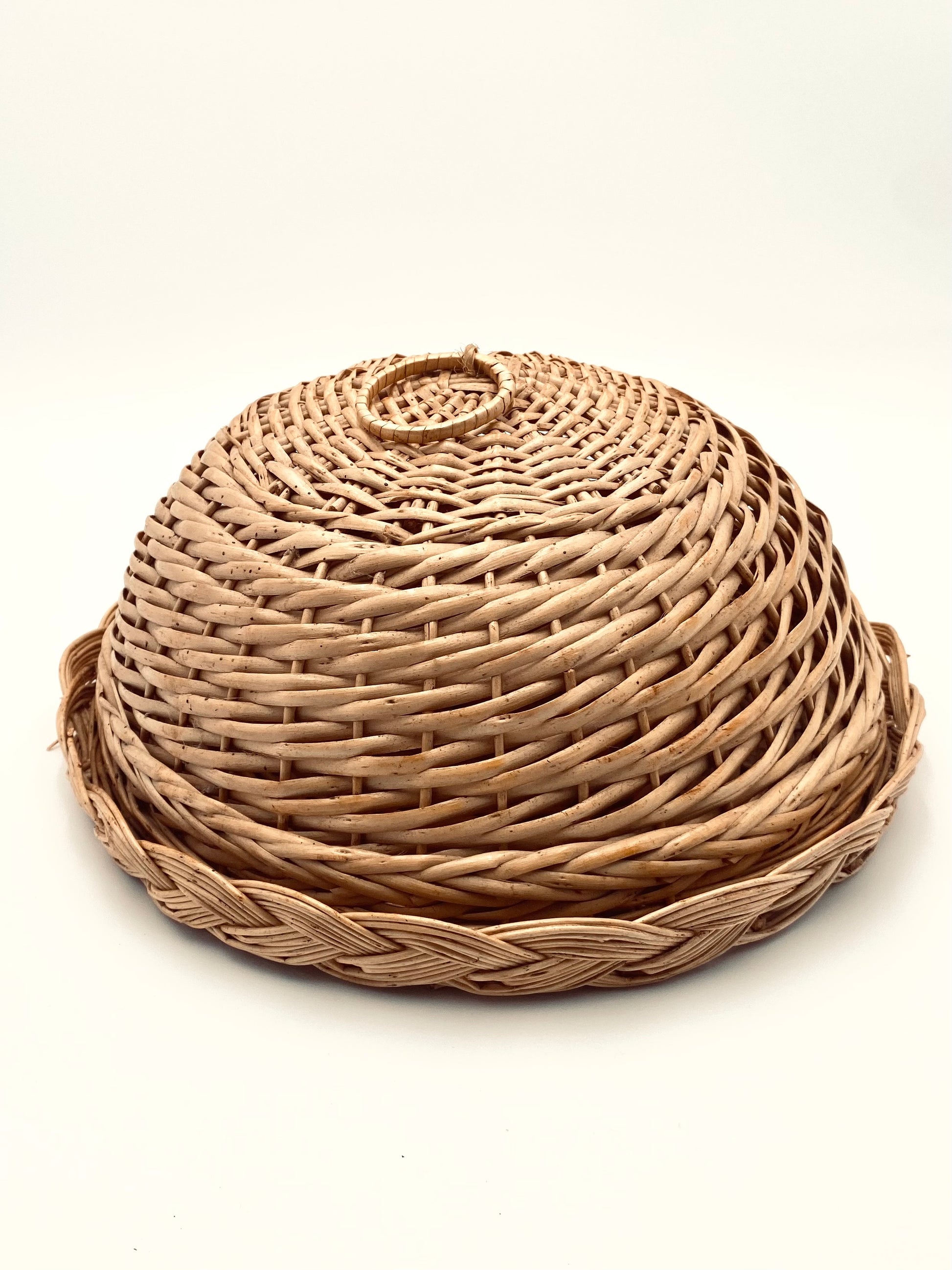 Handgevlochten rieten cloche met een bijpassende schaal. Handig om bijvoorbeeld fruit, cake of brood in te bewaren, maar of om trés handig om een kaasplankje mee te serveren.
