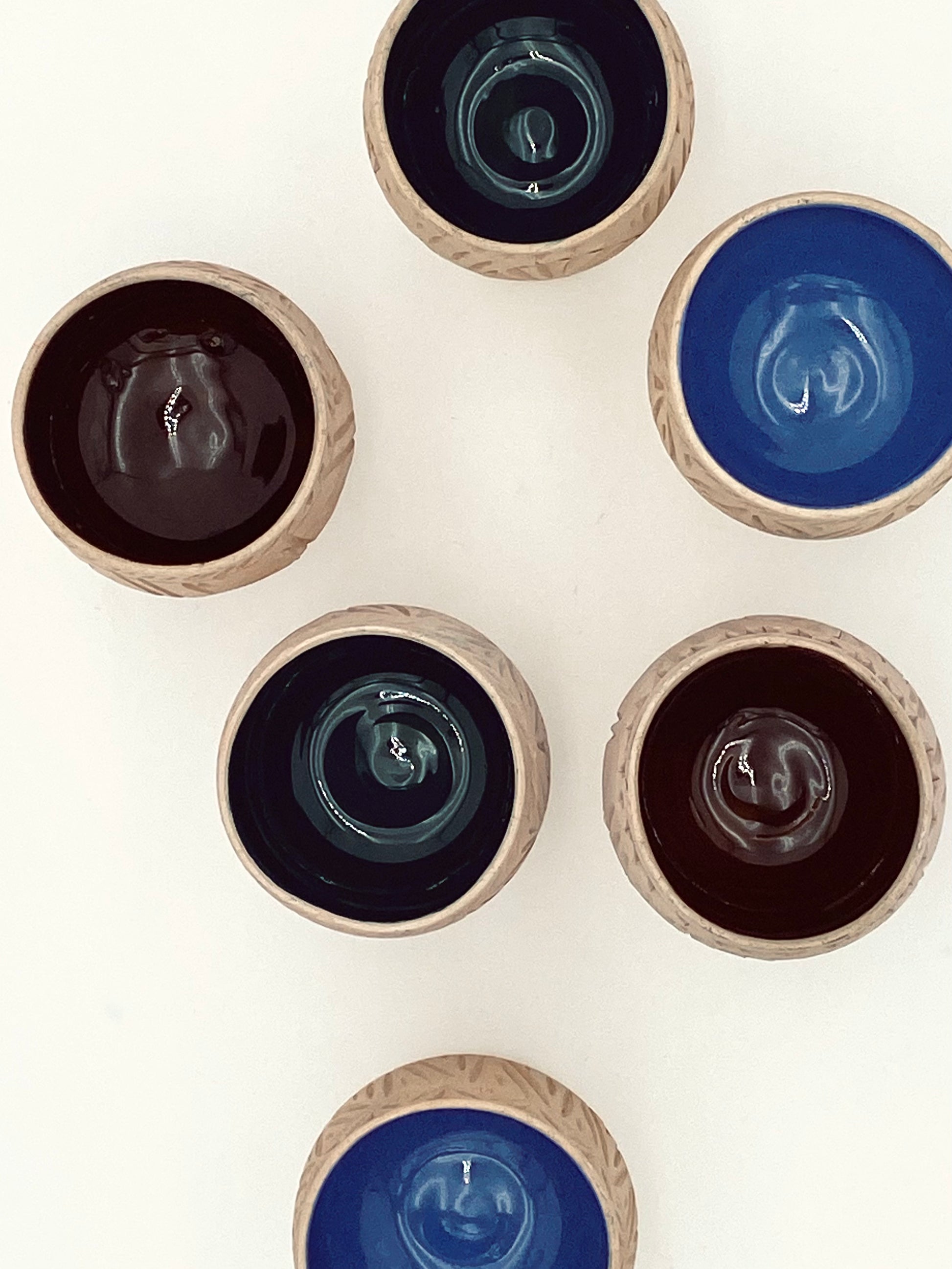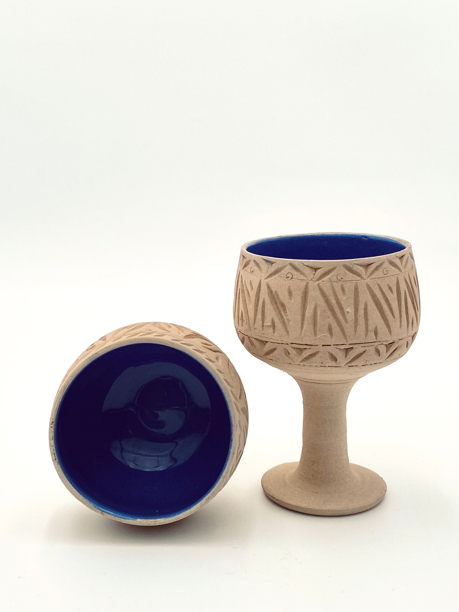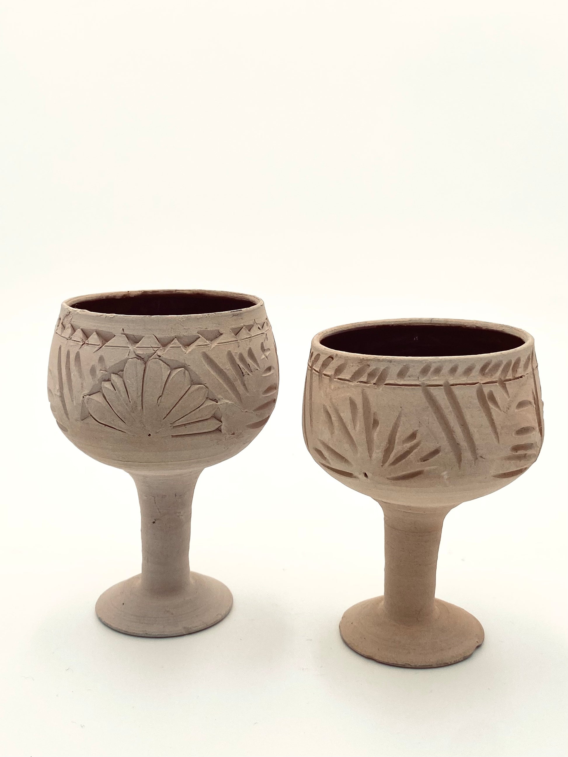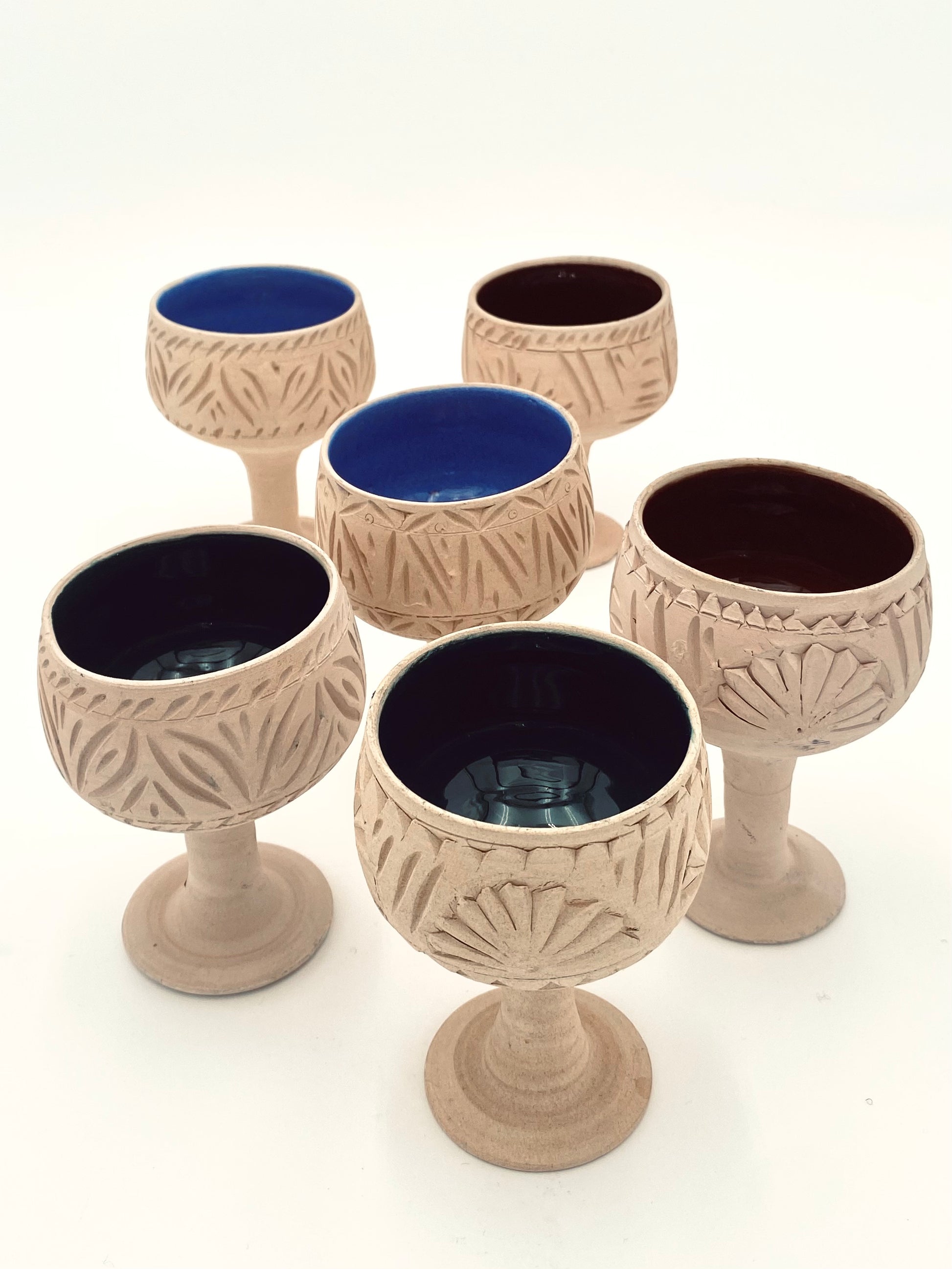 Soms val je gewoon als een blok voor iets knaps. Voor iets wat je nog nooit hebt gezien. Waar je dan eindeloos naar kan staren. Exact dat hadden we met deze handgemaakte, aardewerken bekers op een voetje met een dikke laag gekleurd glazuur aan de binnenkant. Waar ze vandaan komen, wie ze heeft gemaakt. We hebben werkelijk waar geen idee. Wel dat ze oud zijn, goed bewaard zijn gebleven en dusdanig handgemaakt zijn dat ze onderling ook een beetje verschillen van grote, qua ingesneden motieven en dat de een net wat rechter is dan de andere.
