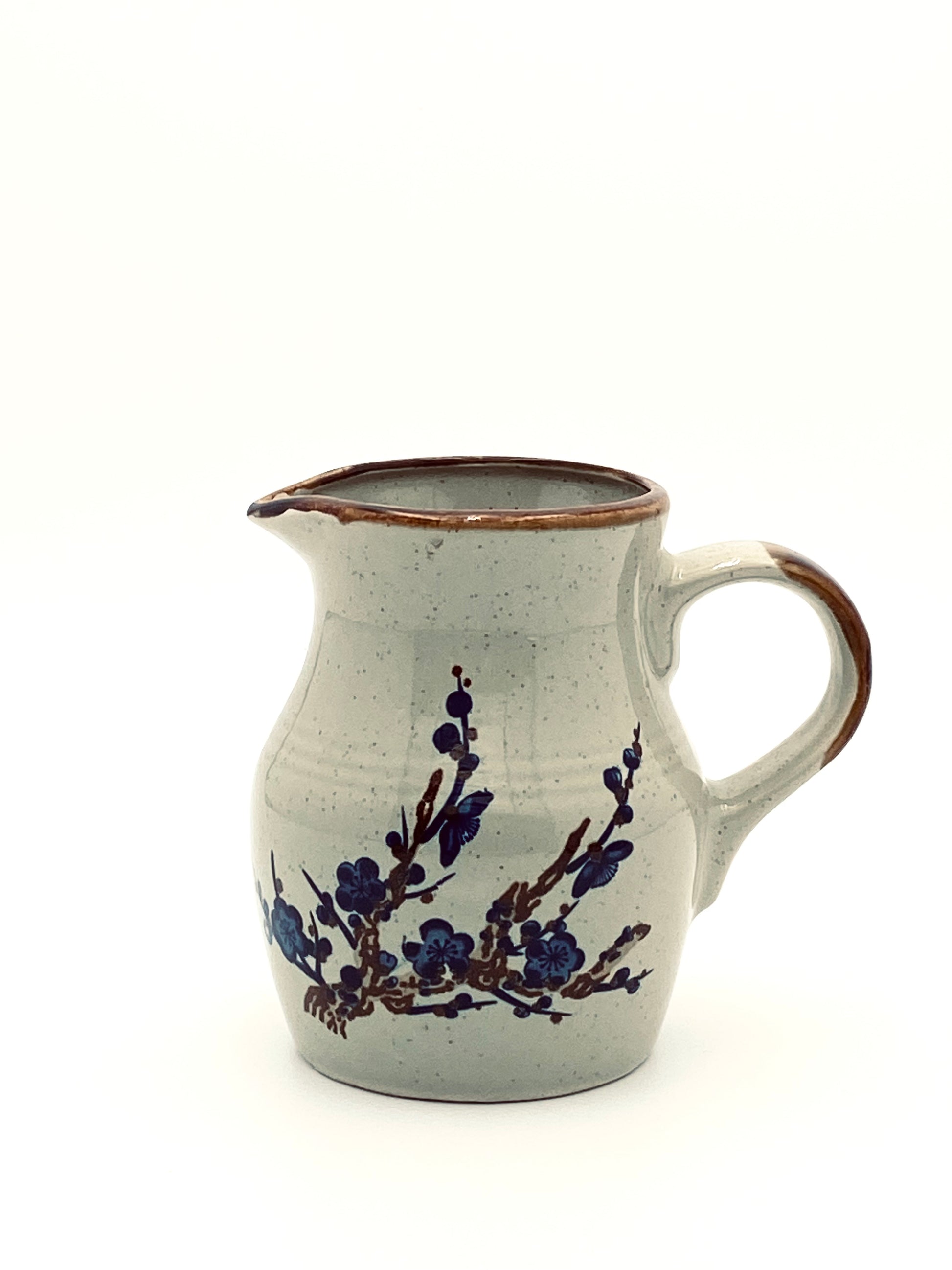Kleine, aardewerken schenkkan met blauwe bloemen.