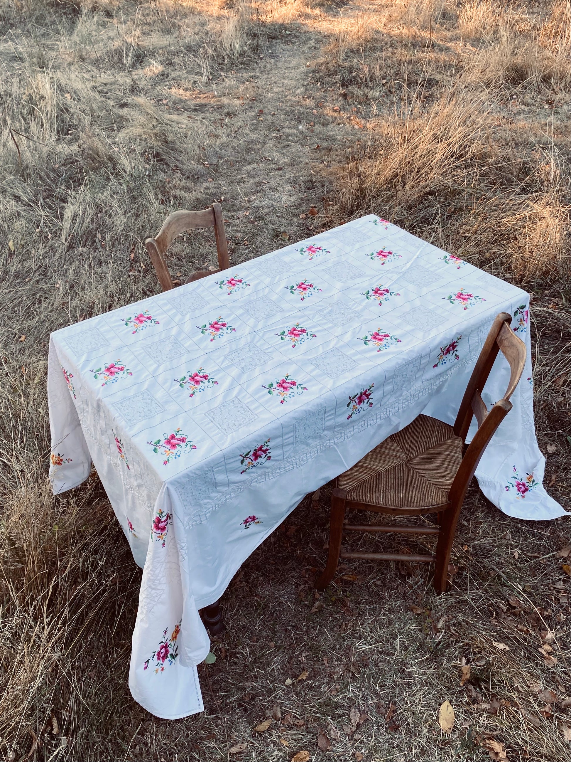 Het idee dat iemand hier uren, dagen aan heeft zitten werken. Dit grote, handgemaakte, katoenen tafelkleed met kanten inzetjes en ajour details zit boordevol handgeborduurde rozen en is een kunstwerk op zich.