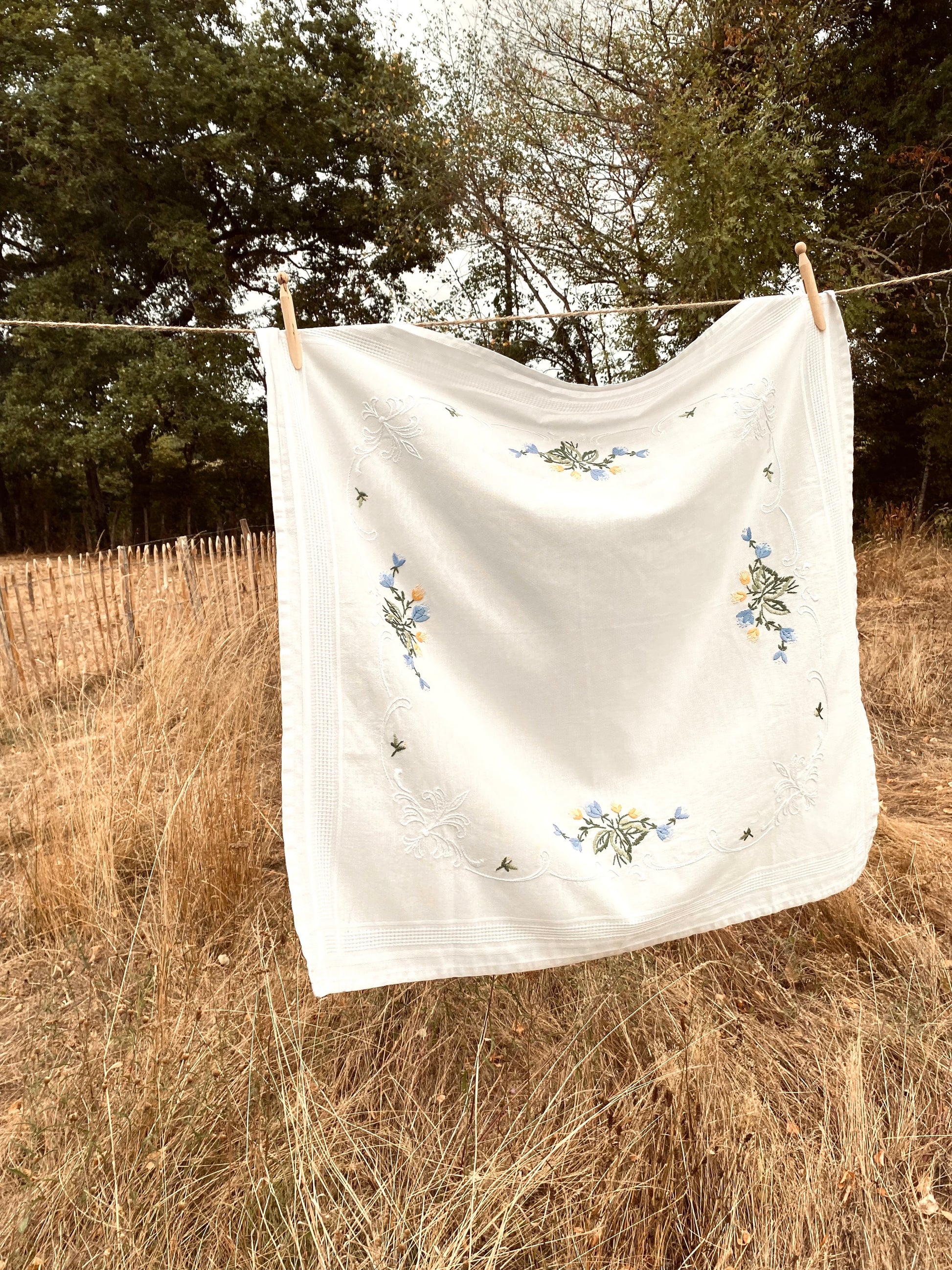 Mooi en simpel: vierkant katoenen tafelkleed met handgeborduurde bloemen.