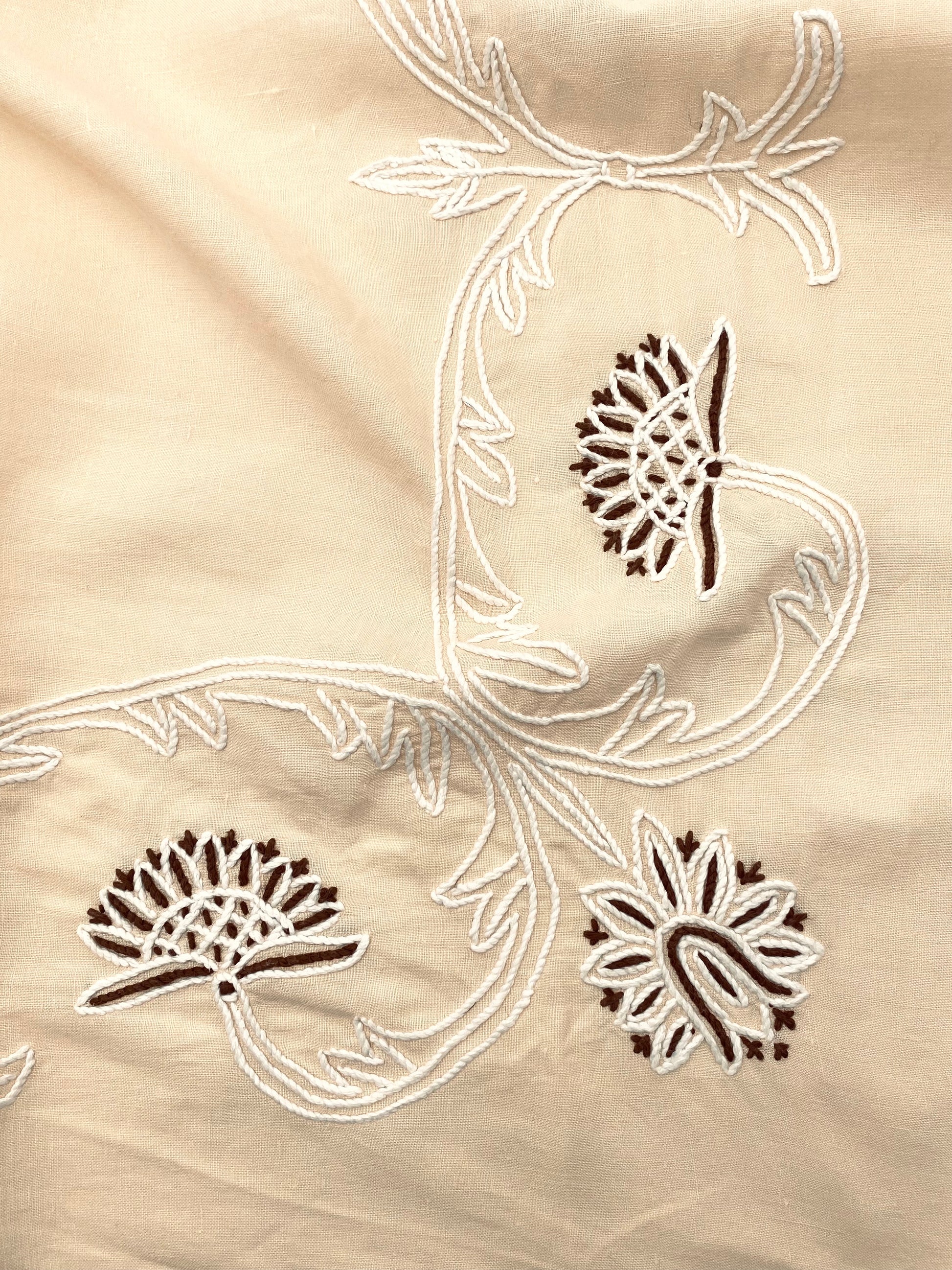 Niet groot van formaat, maar wel van karakter: dit oude, handgemaakte linnen tafelkleed met geborduurde bloemen is niet alleen heel erg knap, maar o.a. ook ideaal voor een ontbijtje voor twee.