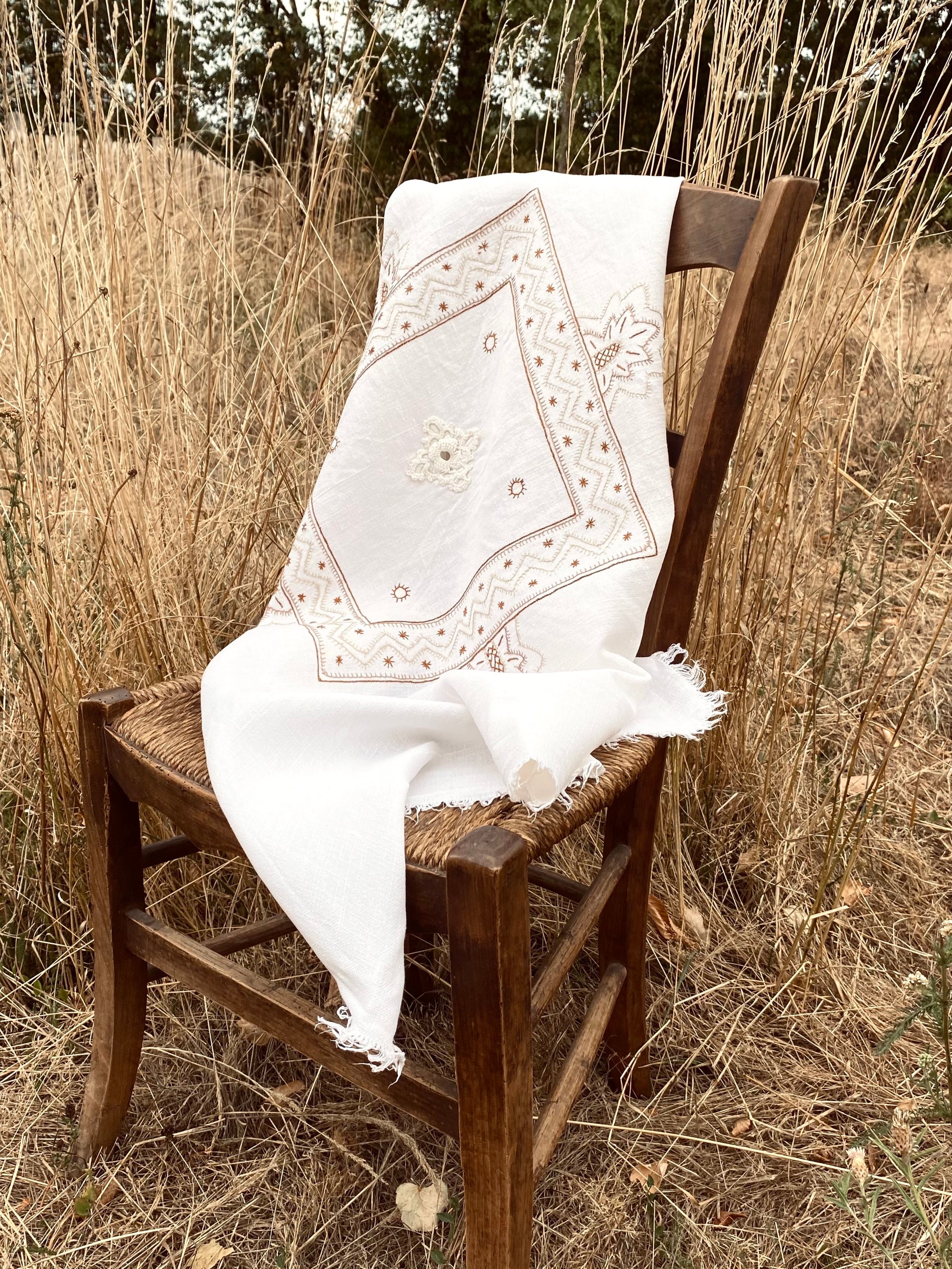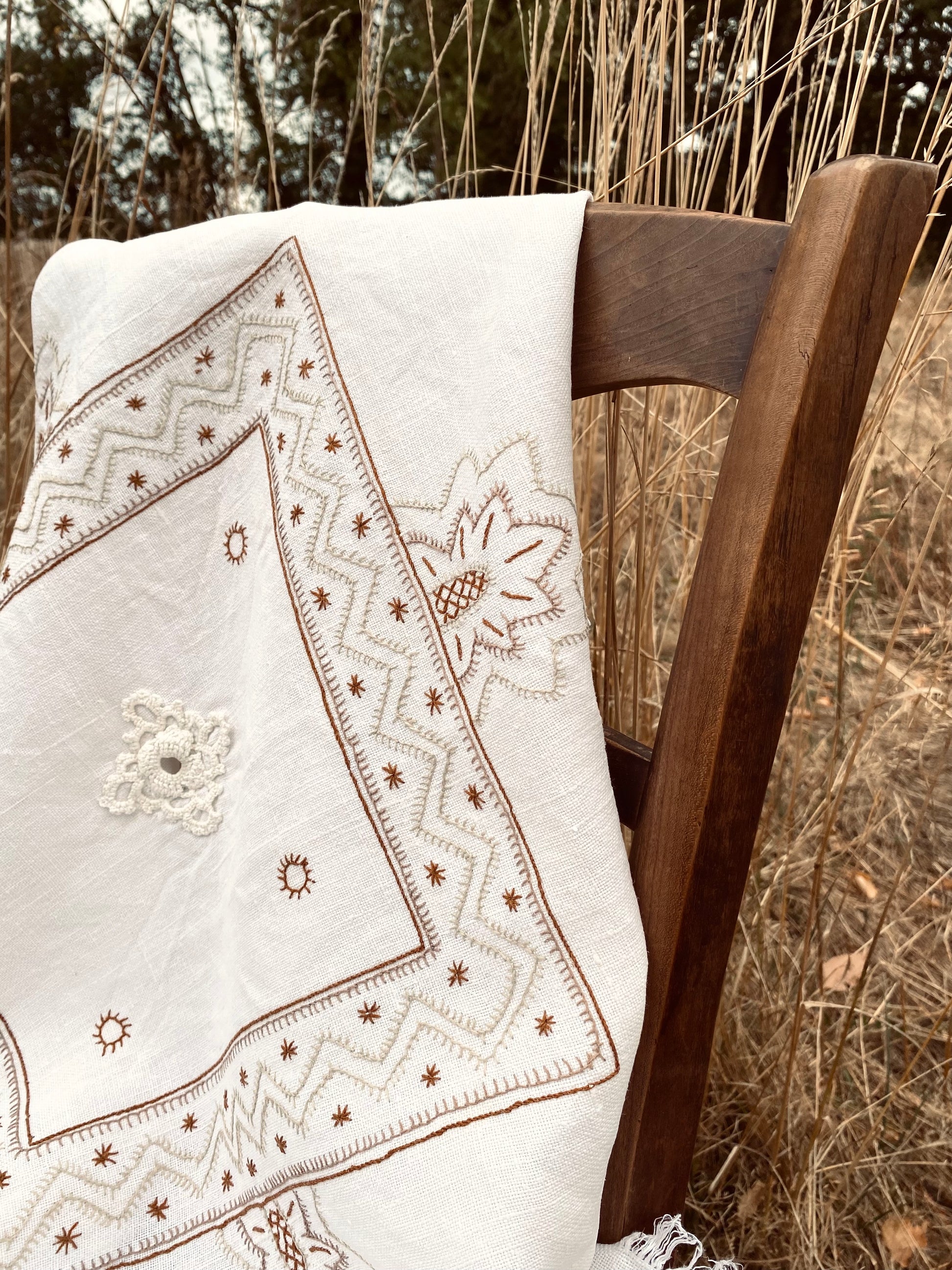 Oud geborduurd linnen tafelkleed met franje rand en in het midden een gehaakte rozet. Het idee dat iemand hier heel wat uren op heeft zitten zwoegen en dat het na al die jaren nog zo goed bewaard is gebleven, maakt dit kleed al zo bijzonder.