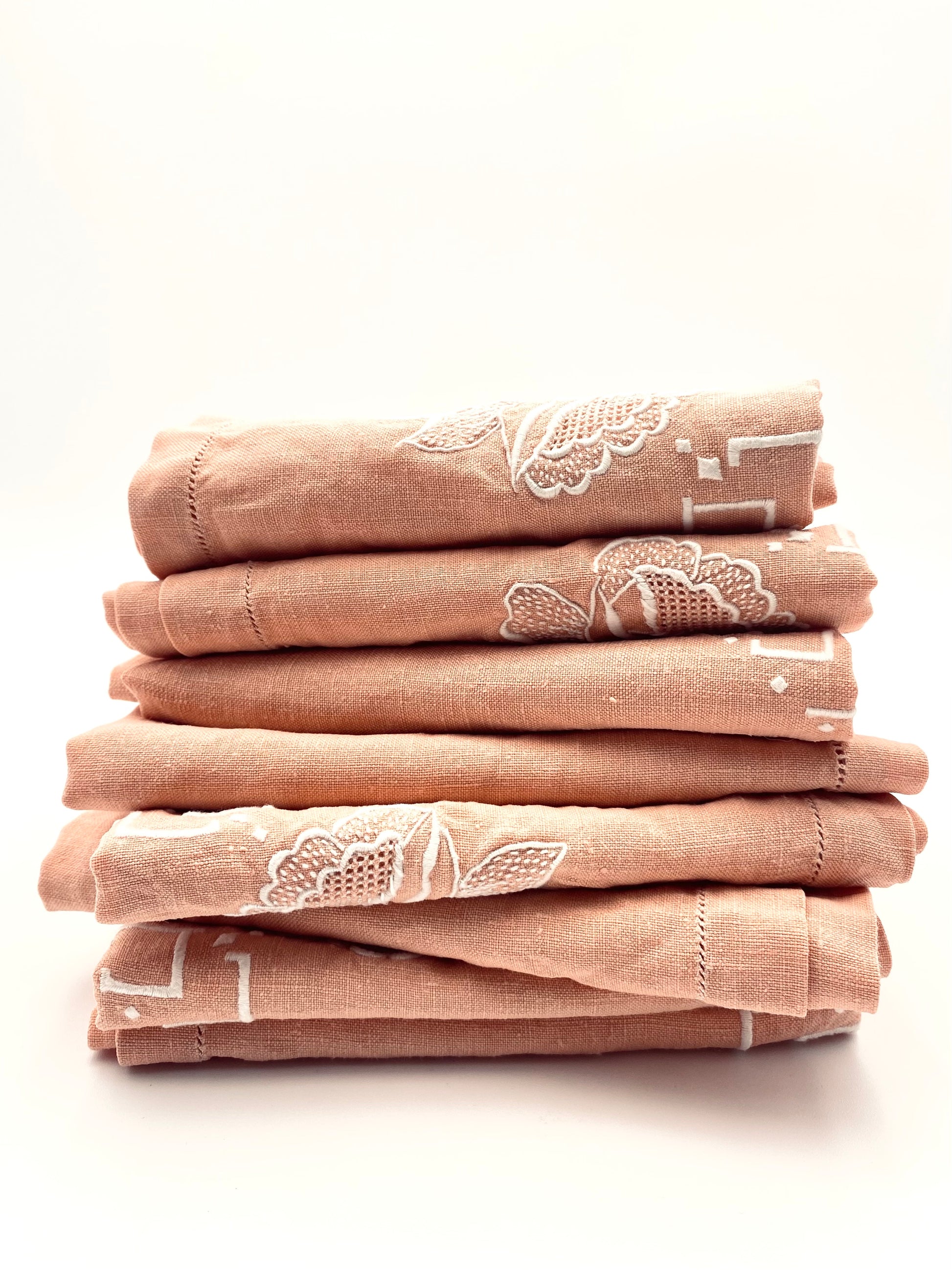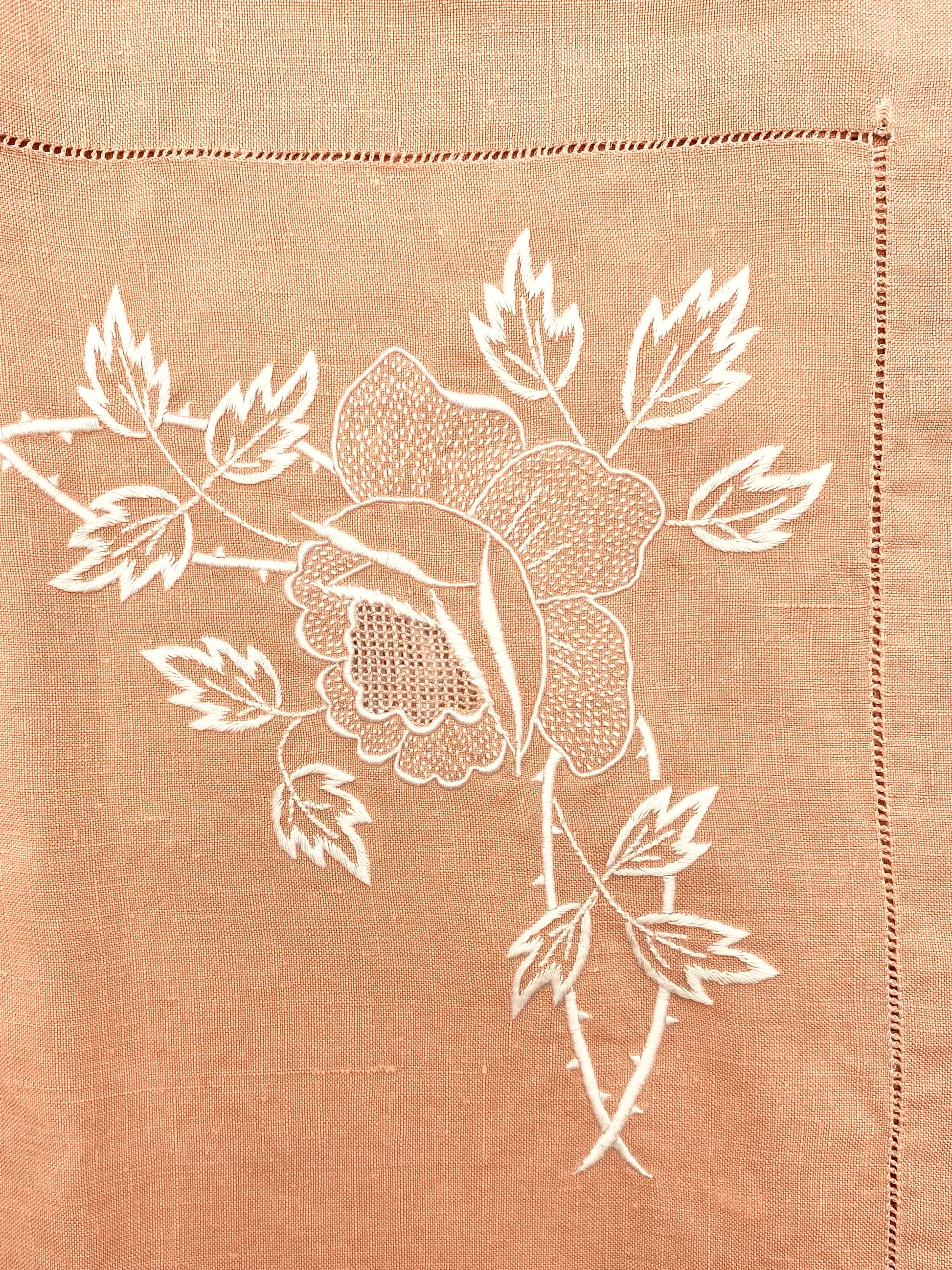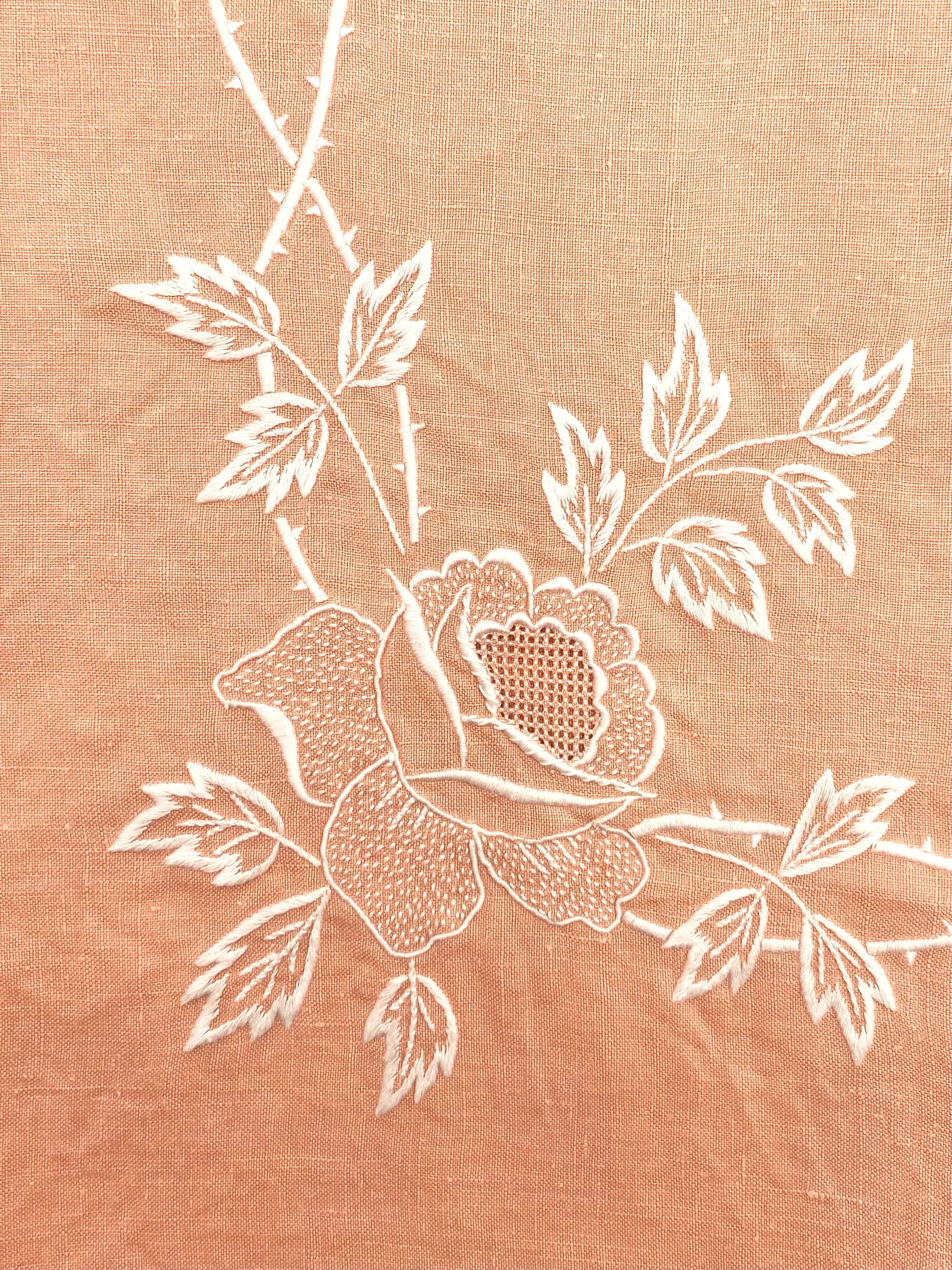 Een oud, handgemaakt linnen tafelkleed, zoals deze komen we echt maar heel zelden tegen. Sterker nog, dit is de eerste keer ooit. Zalmroze, openwerkt linnen, vlekkeloos, met de handgeborduurde rozen. En dan als klap op de vuurpijl 8 royale bijpassende servetten. Net zo mooi en net zo knap als het kleed zelf. Het idee dat iemand hier uren - en het kan niet anders, met heel veel liefde aan heeft gewerkt, dat maakt dit kleed één van de mooiste vondsten ever.