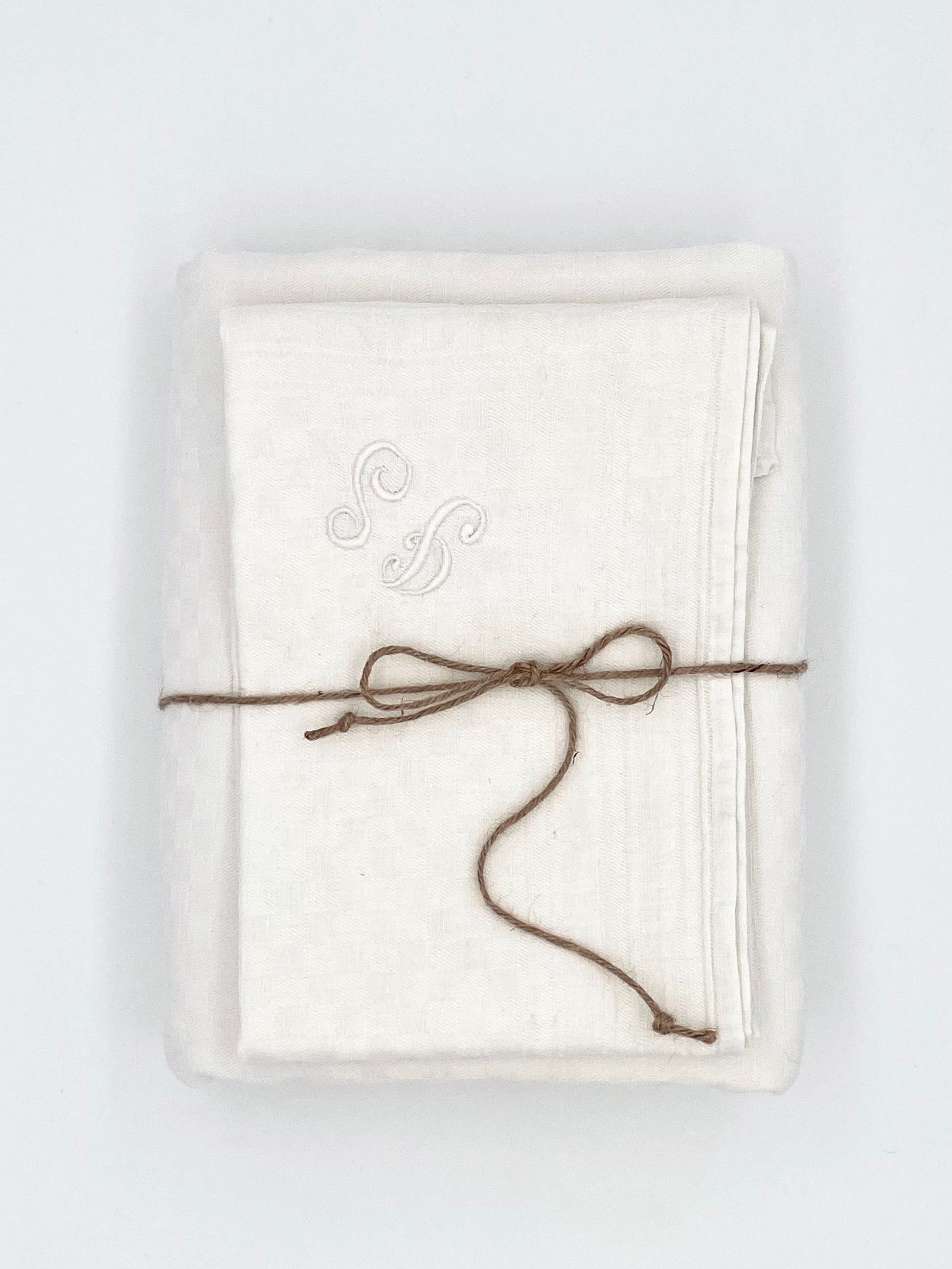 Feestje? Met dit oude damast tafelkleed lukt dat wel. Het tafelkleed is een zeldzaamheid, want is extra lang (3,8 meter!) en heeft 12 royale servetten met monogram.
