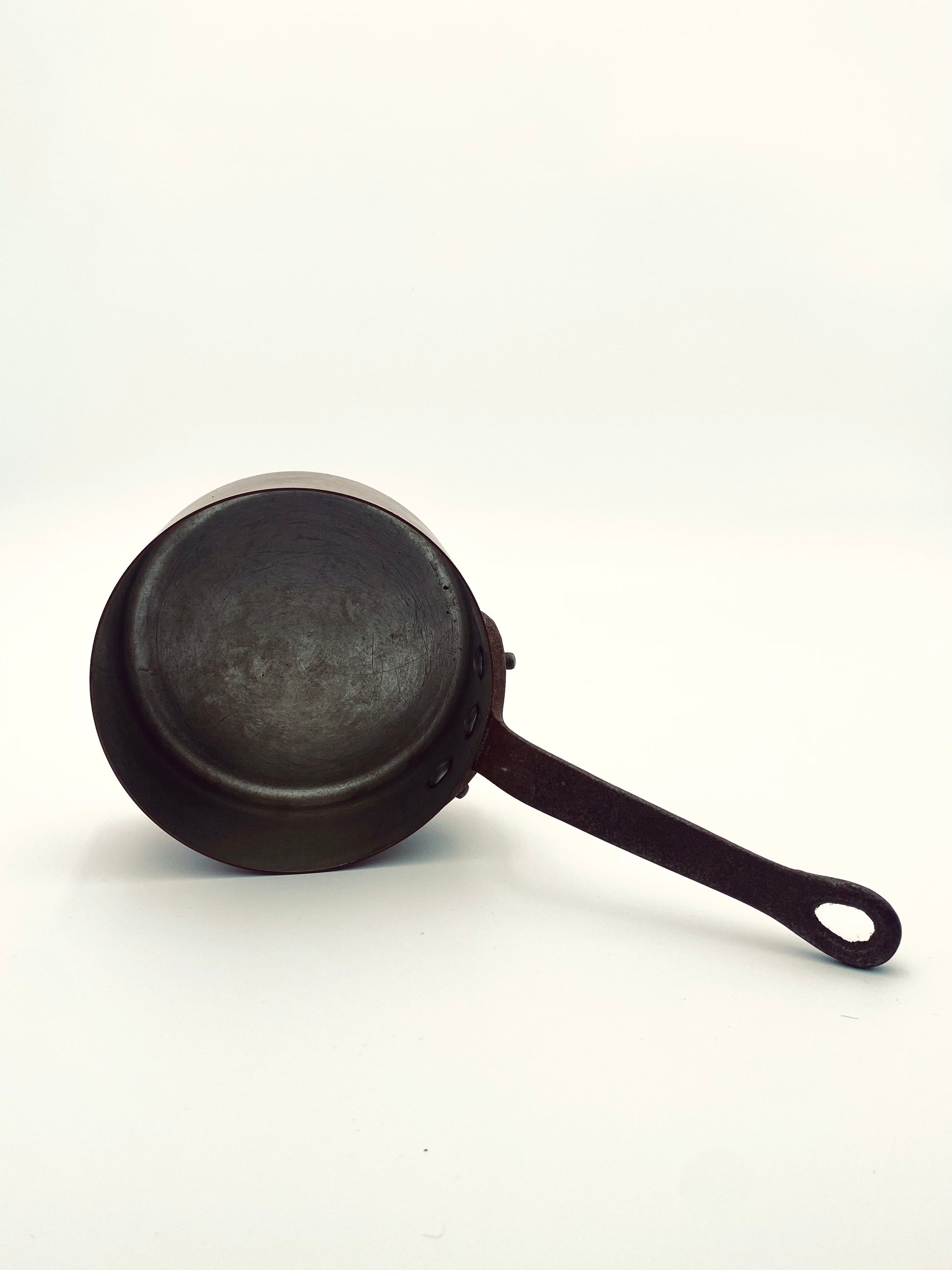 Weet je waarom koperen pannen zo geliefd zijn bij echte koks? Zowel de bodem als de zijkanten van de pan worden gelijkmatig warm. Dat snelle opwarmen én afkoelen is ideaal om bijvoorbeeld sauzen, jam en risotto in te bereiden. En ja, het liefst wil je de keukenmuur vol met die pannen in alle maten, maar je kan altijd beginnen met één klein pannetje zoals deze. Dit oude, verkoperde exemplaar heeft een doorsnede van 12 cm en een hoogte van 6cm. De pannen worden los verkocht.