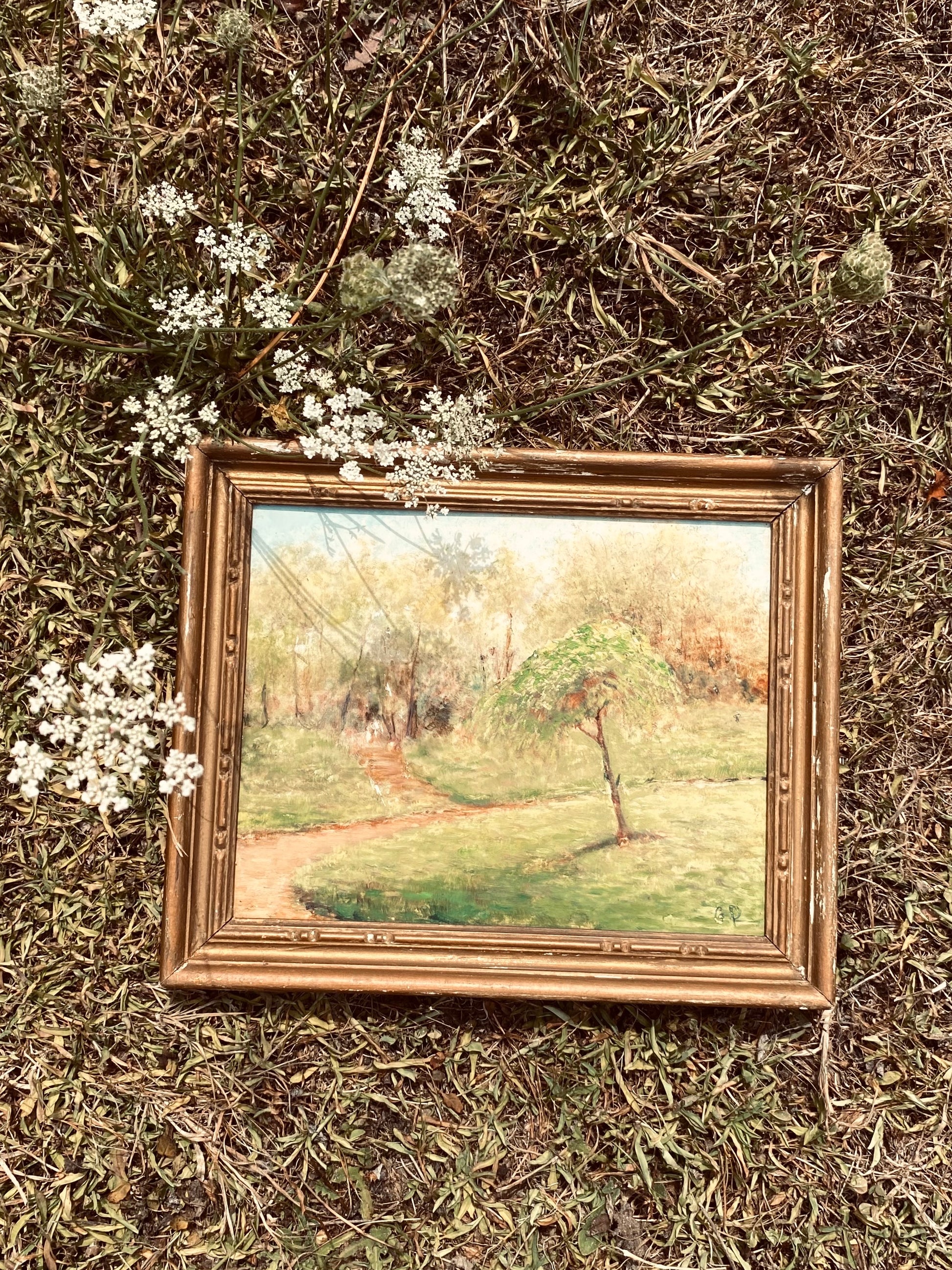 Klein, oud, olieverf op karton schilderijtje in een houten lijst.