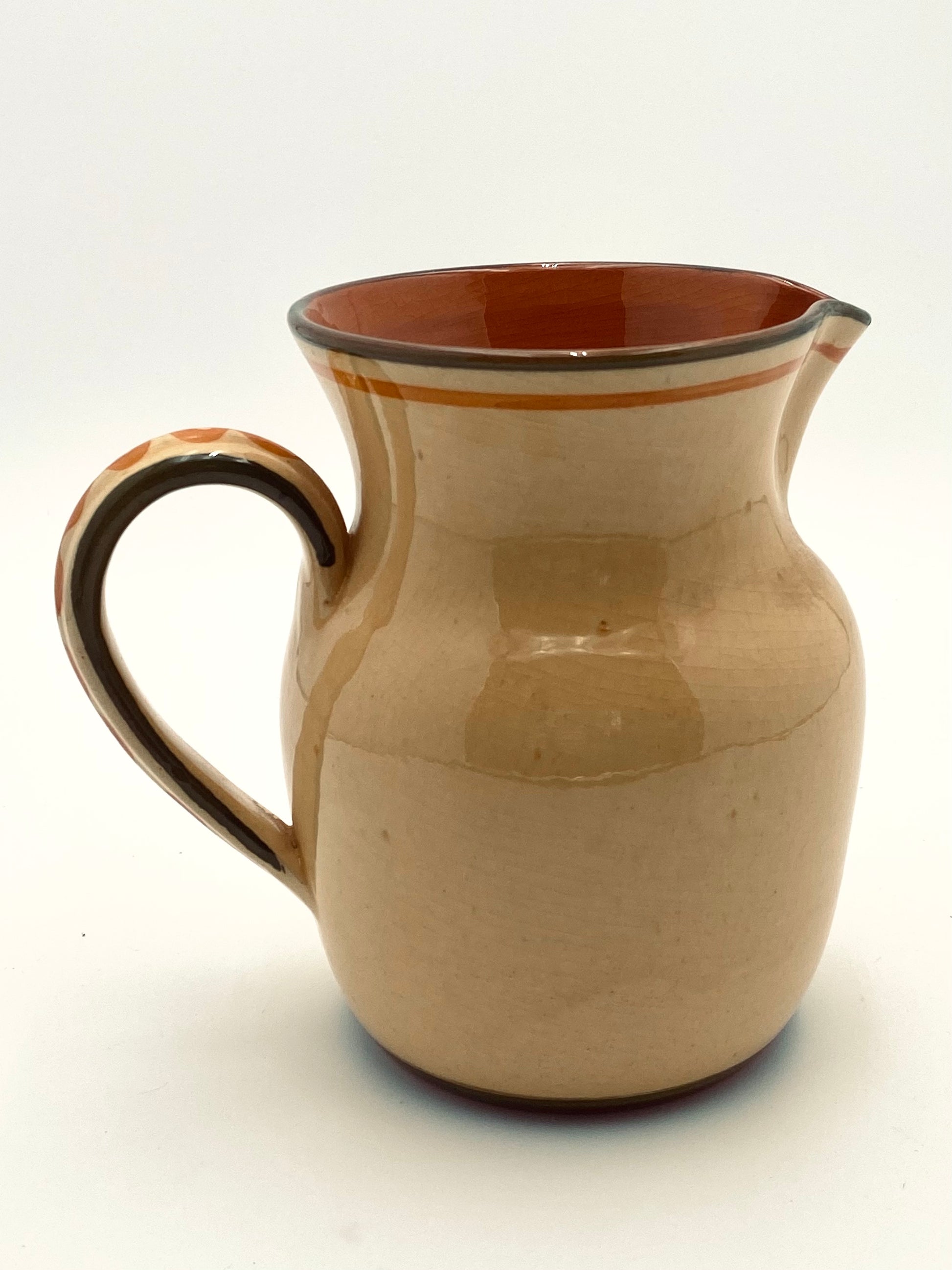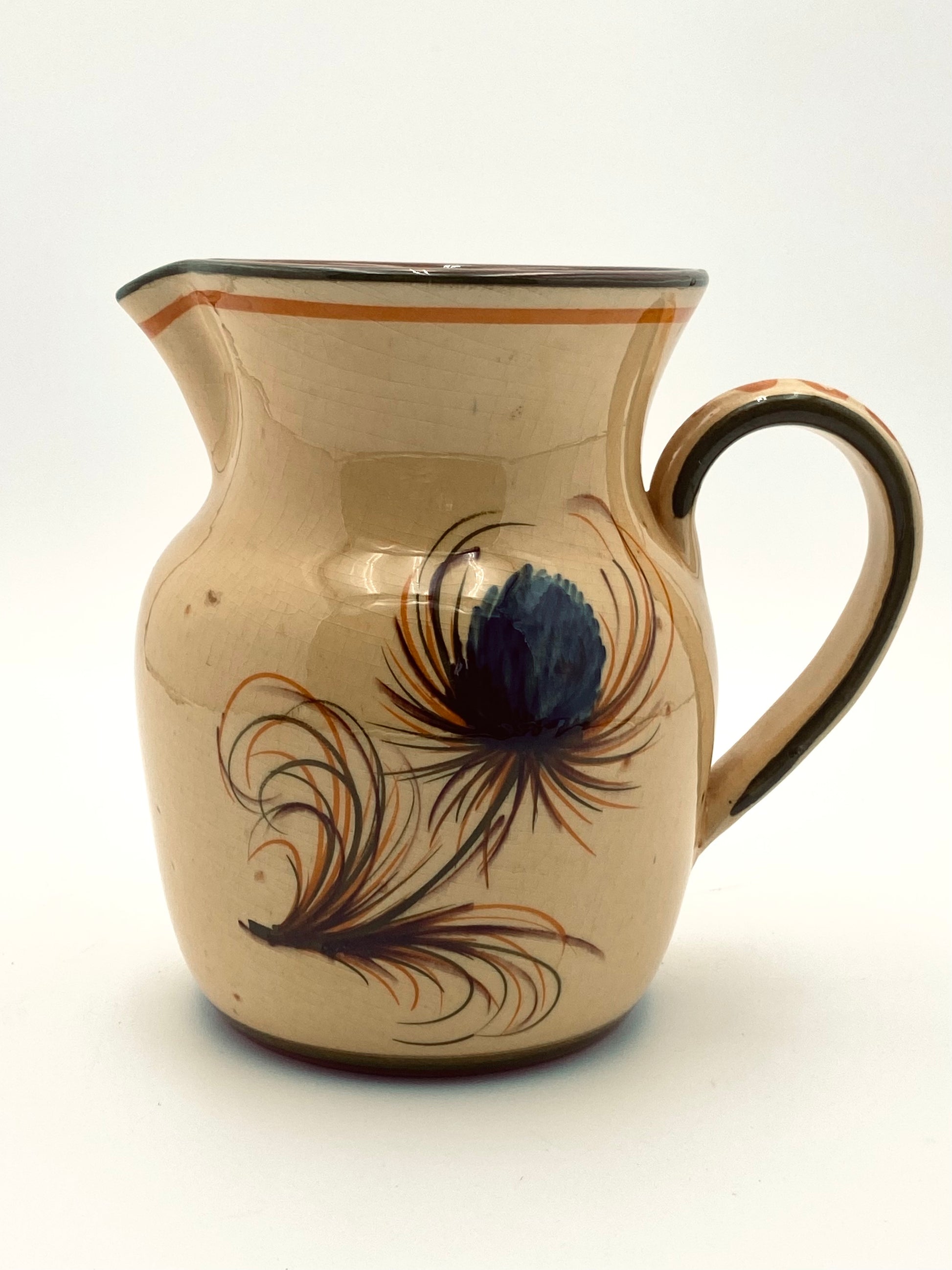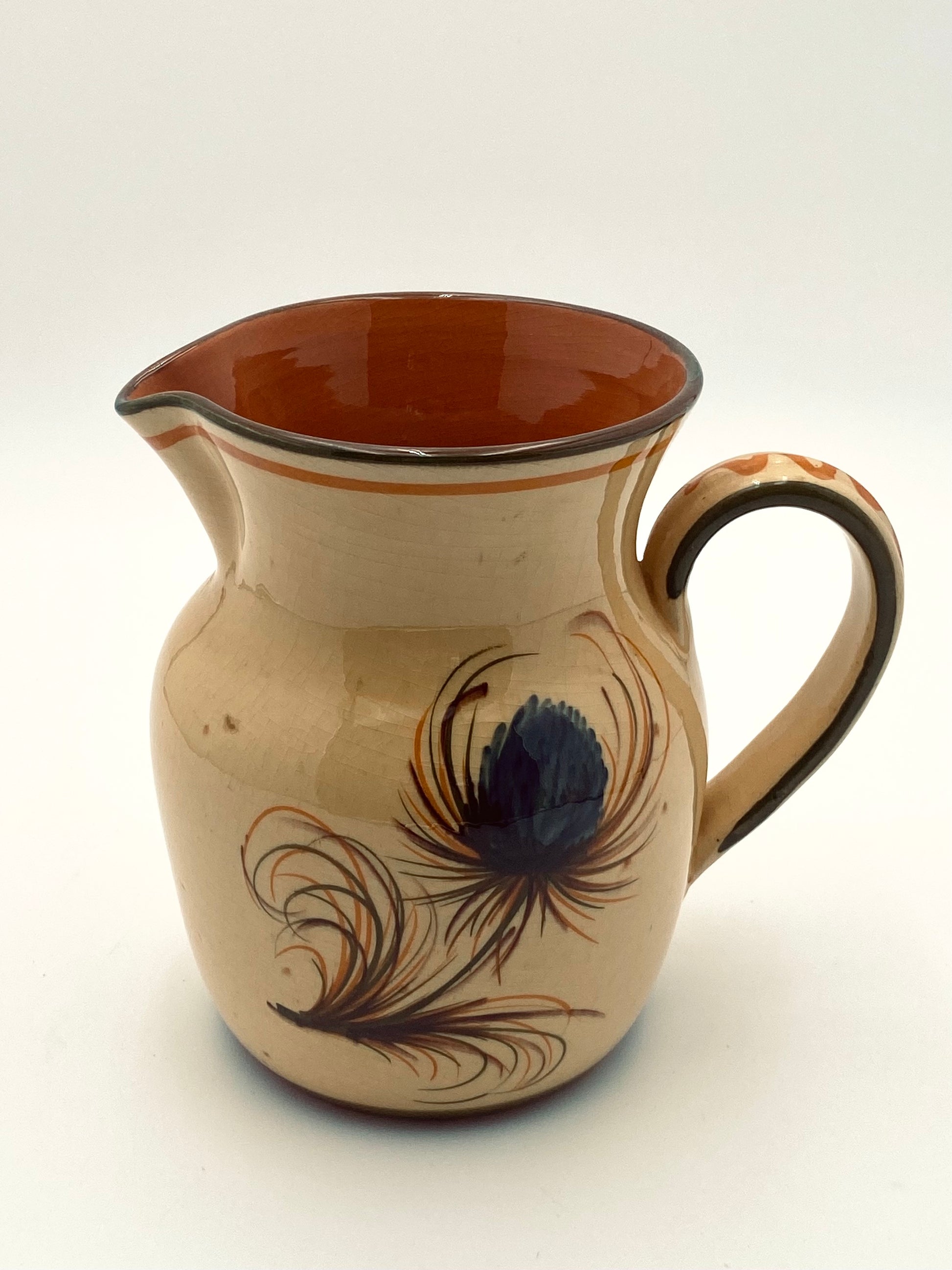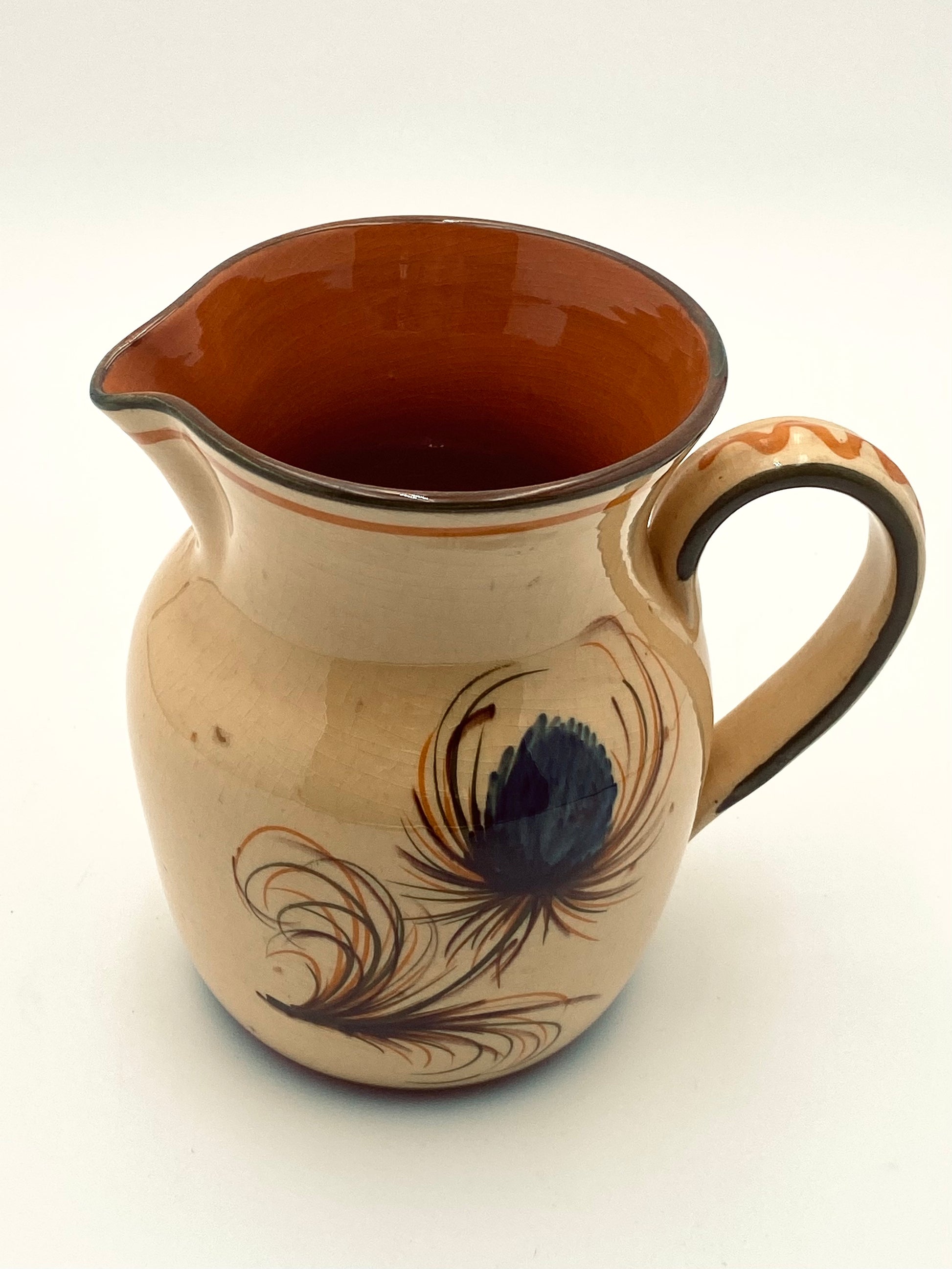 Handgemaakte oude kan met dikke laag craquelé glazuur en een met de handgeschilderde pauwenveer. Die kan is gewoon knap zoals 'ie is, maar doet het ook goed als waterkan op je mooi gedekte tafel, als vaas voor je (vers geplukte) bloemen of als kan voor je pollepels en spatels naast het gasfornuis. De kan heeft een hoogte van 17cm.