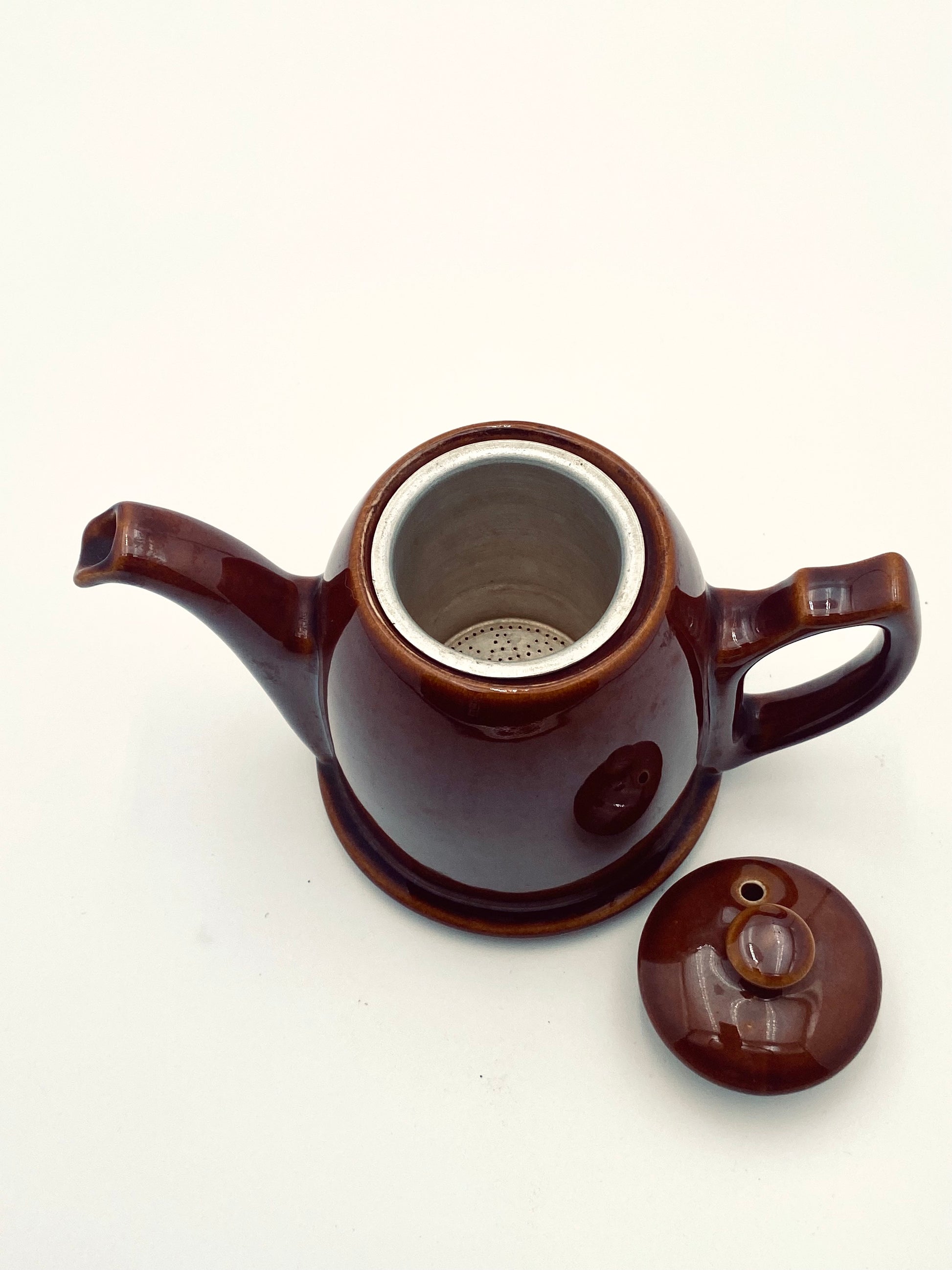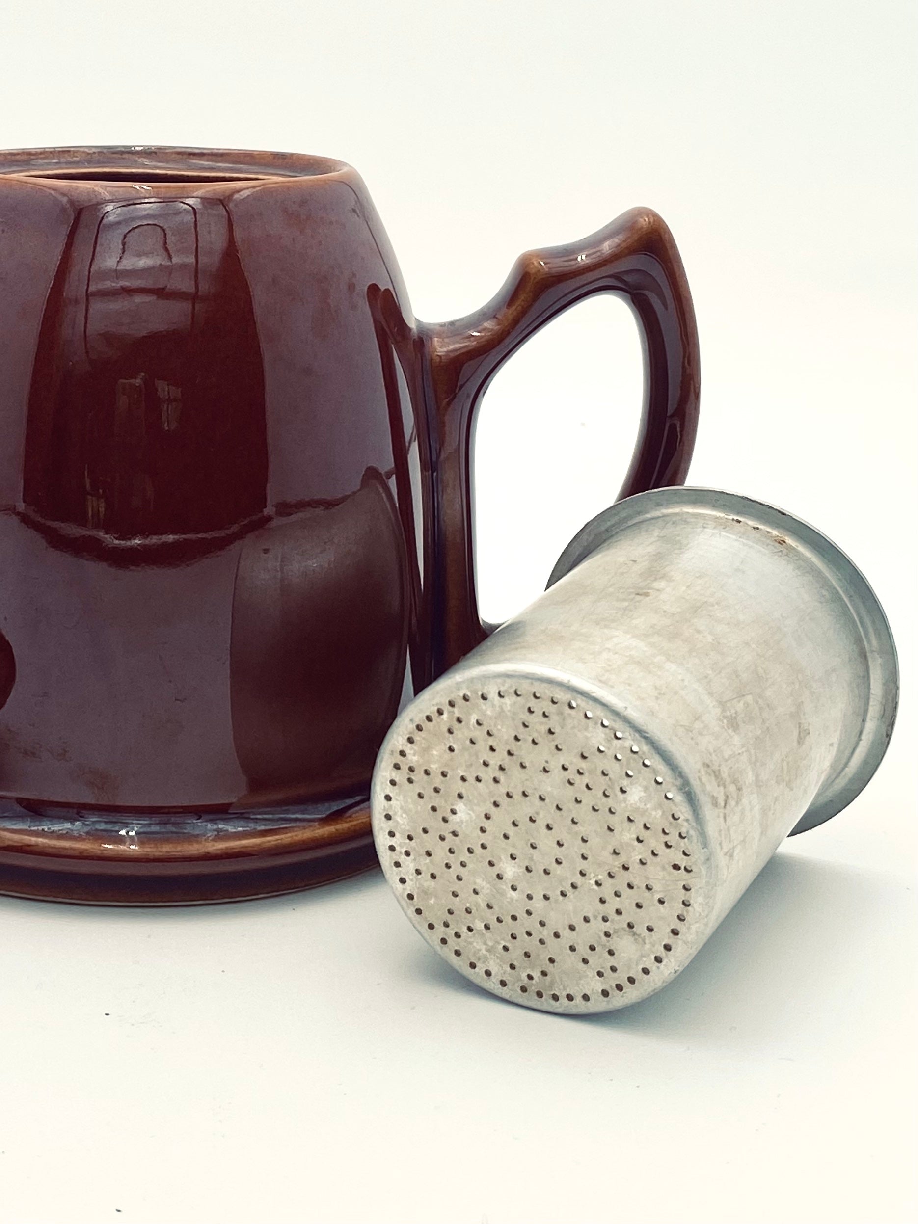 Deze oude, bruin geglazuurde theepot is niet alleen heel knap om te zien, maar heeft ook nog een verrassing in petto: een metalen zeefje. Heel handig voor je zelf geplukte verse verveine blaadjes. Of losse thee uit een kant en klaar zakje. Dat kan natuurlijk ook gewoon.