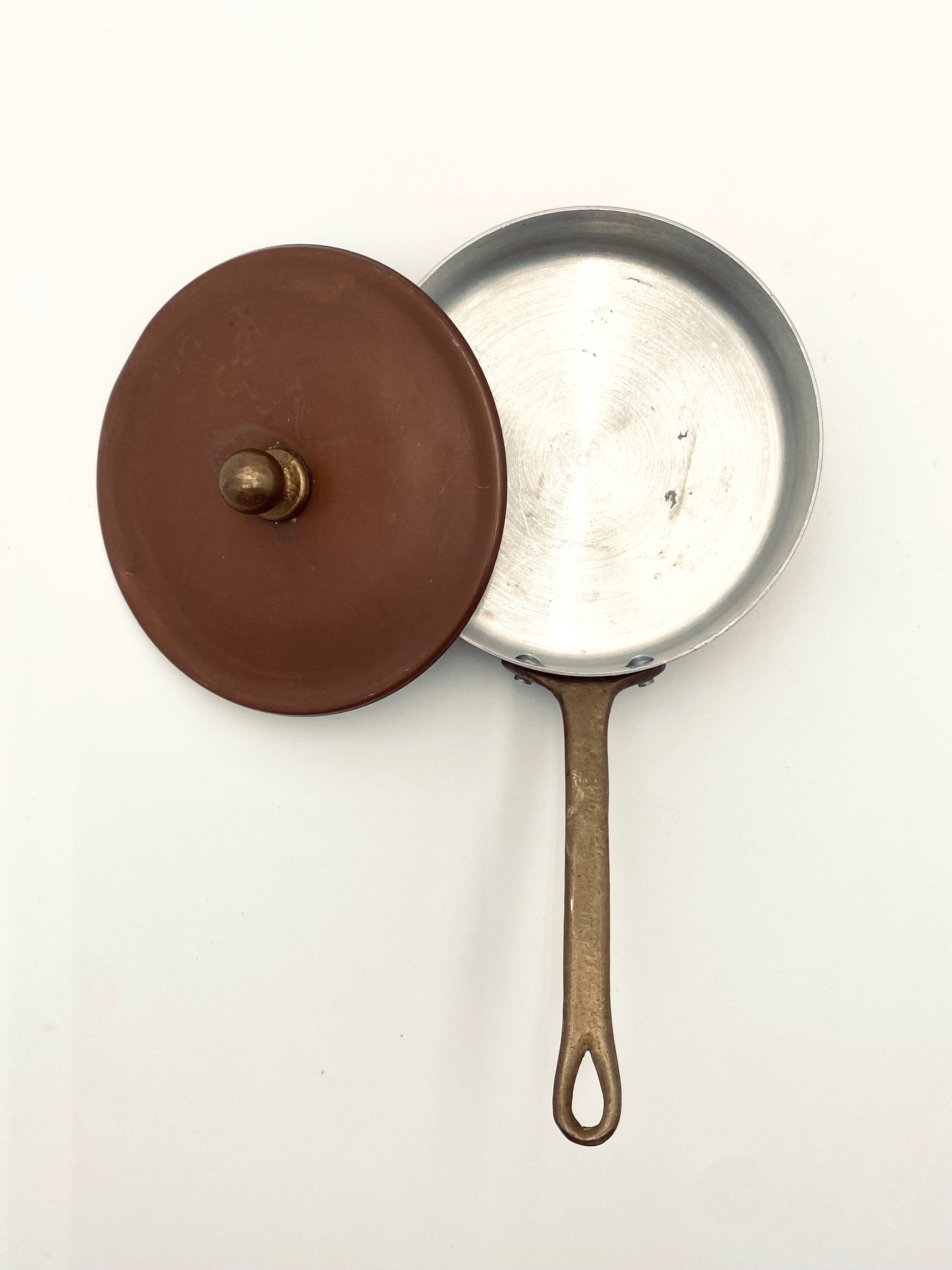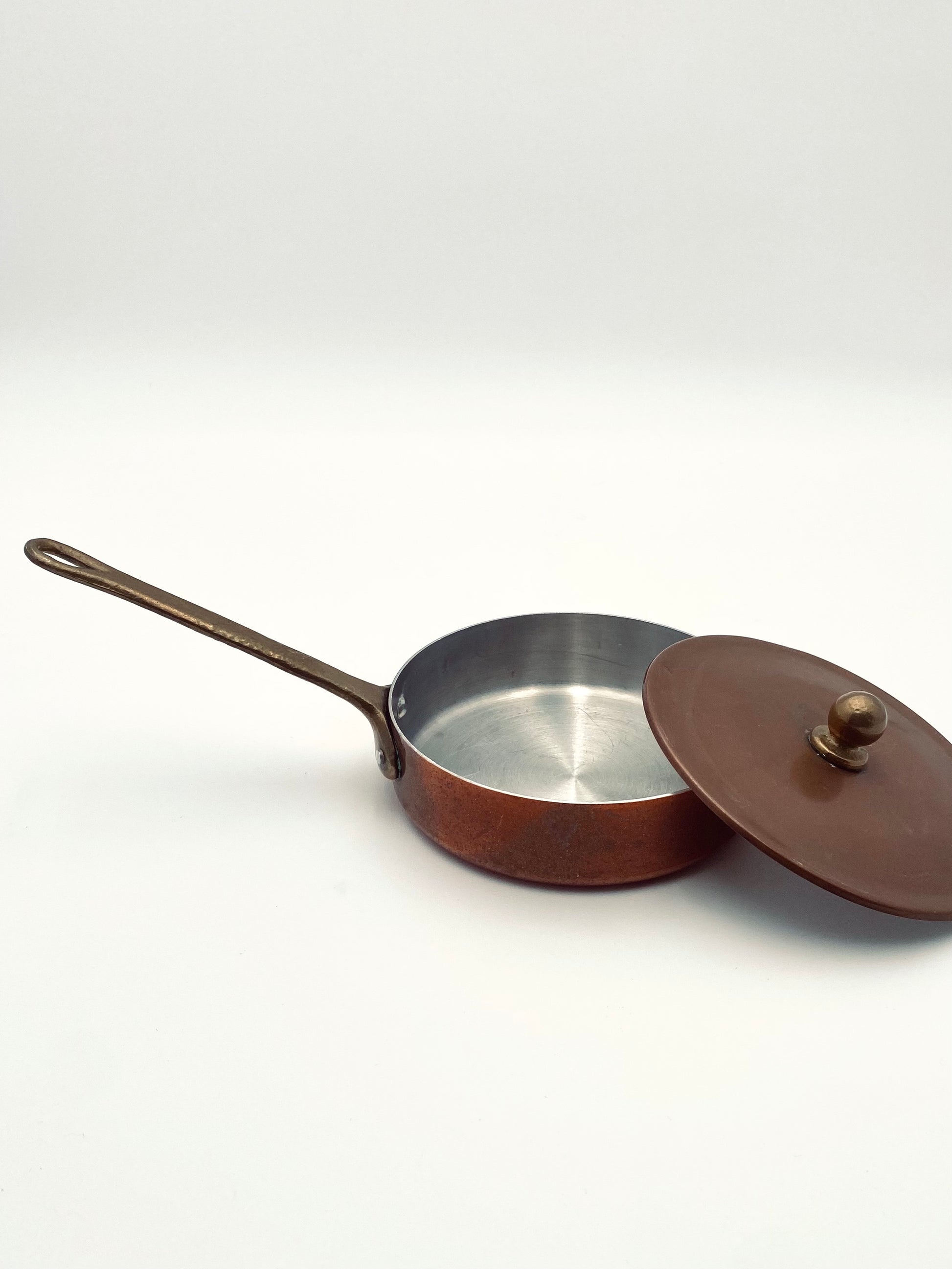 Weet je waarom koperen pannen zo geliefd zijn bij echte koks? Zowel de bodem als de zijkanten van de pan worden gelijkmatig warm. Dat snelle opwarmen én afkoelen is ideaal om bijvoorbeeld sauzen, jam en risotto in te bereiden. En ja, het liefst wil je de keukenmuur vol met die pannen in alle maten, maar je kan altijd beginnen met één klein pannetje zoals deze met bijpassende deksel. Dit kleine, oude, verkoperde exemplaar heeft een doorsnede van 12 cm en een hoogte van 3cm.