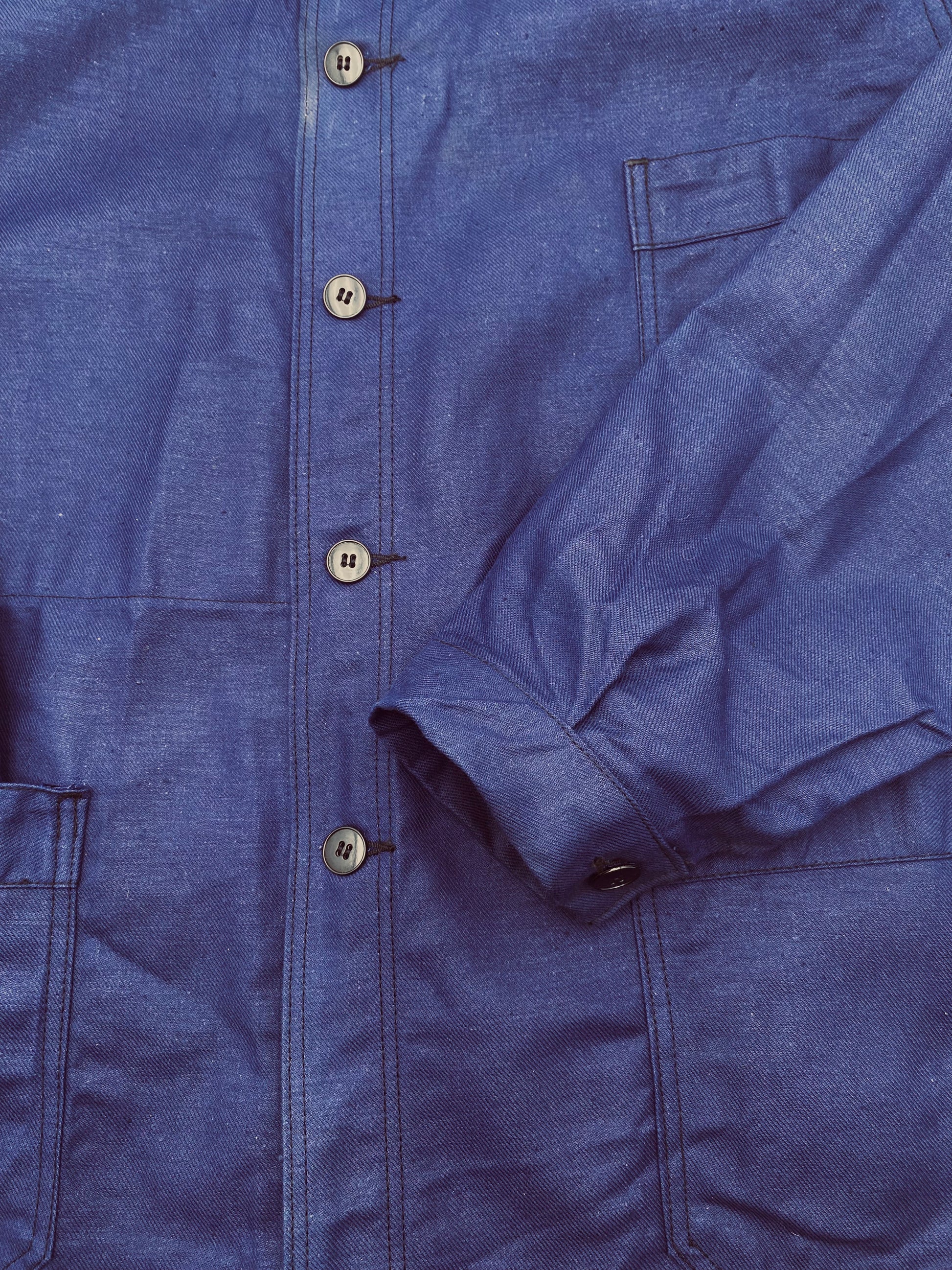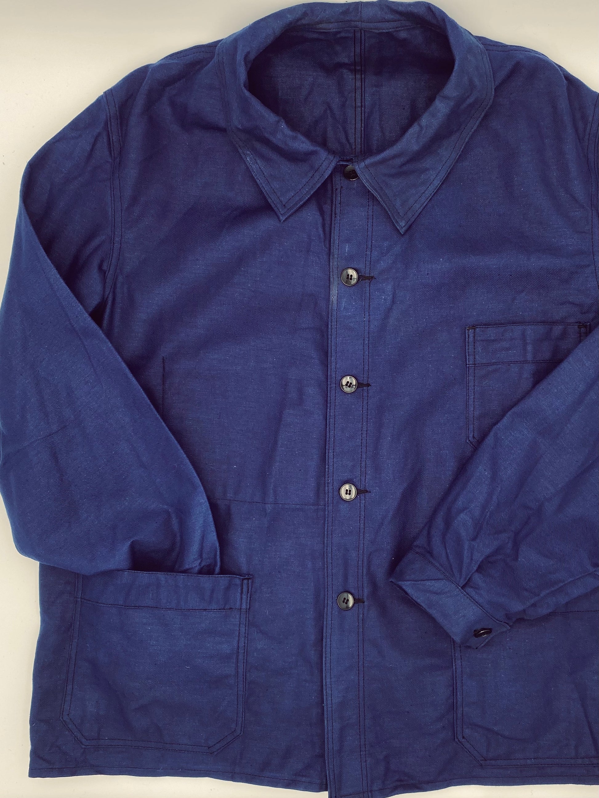 Dit indigo blauwe jasje is gemaakt van stevig, maar toch soepel katoen en is een (dames)maat 46/48 of XXL. Het jasje (waarschijnlijk uit eind jaren '60) is nog ongedragen.