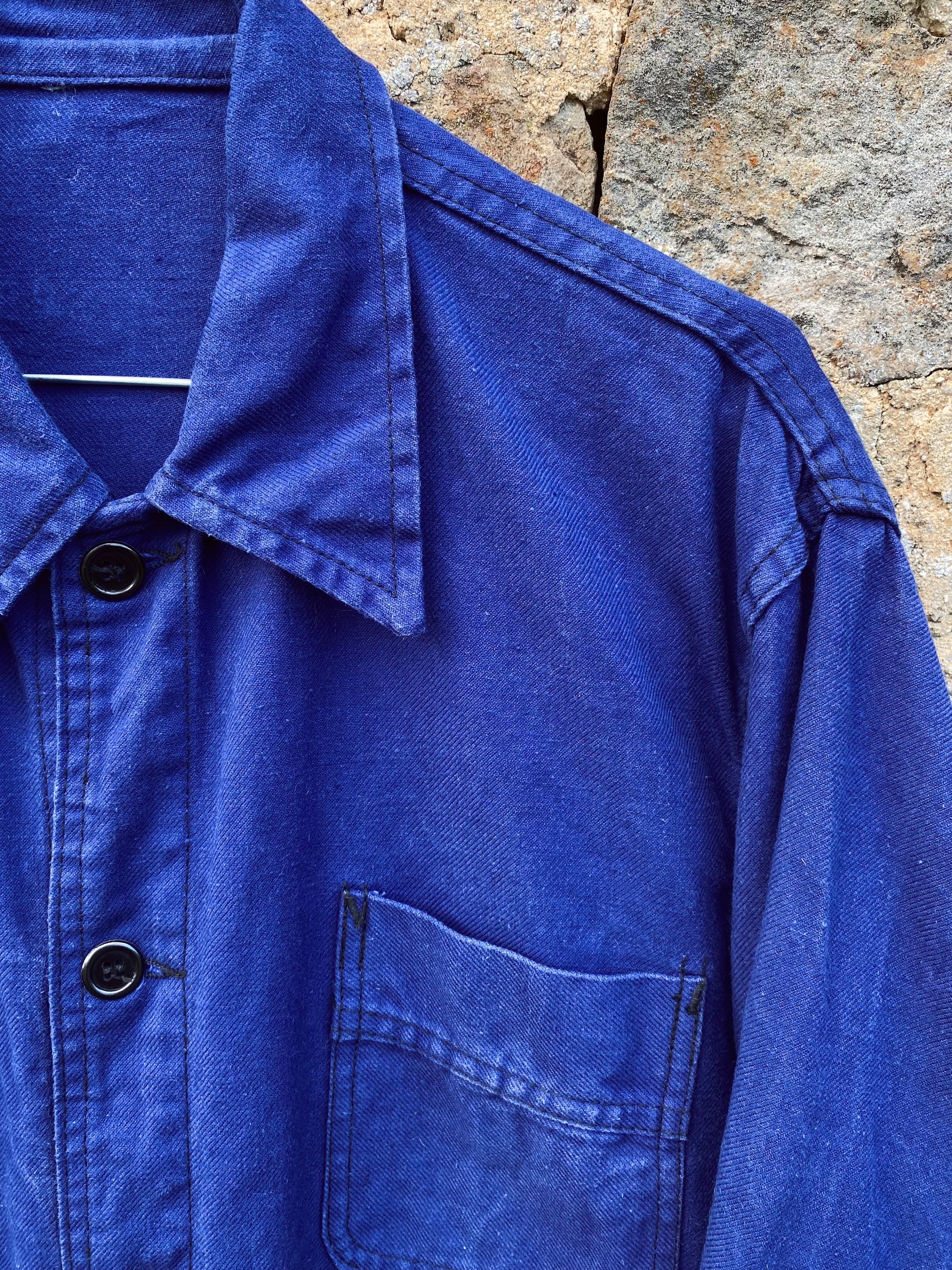 Dit indigo blauwe jasje is gemaakt van stevig, zacht katoen en is een royale (dames)maat 40/42 (M/L). Het jasje (waarschijnlijk begin jaren '70) is een pre-loved exemplaar, dus heeft al een leven achter de rug.