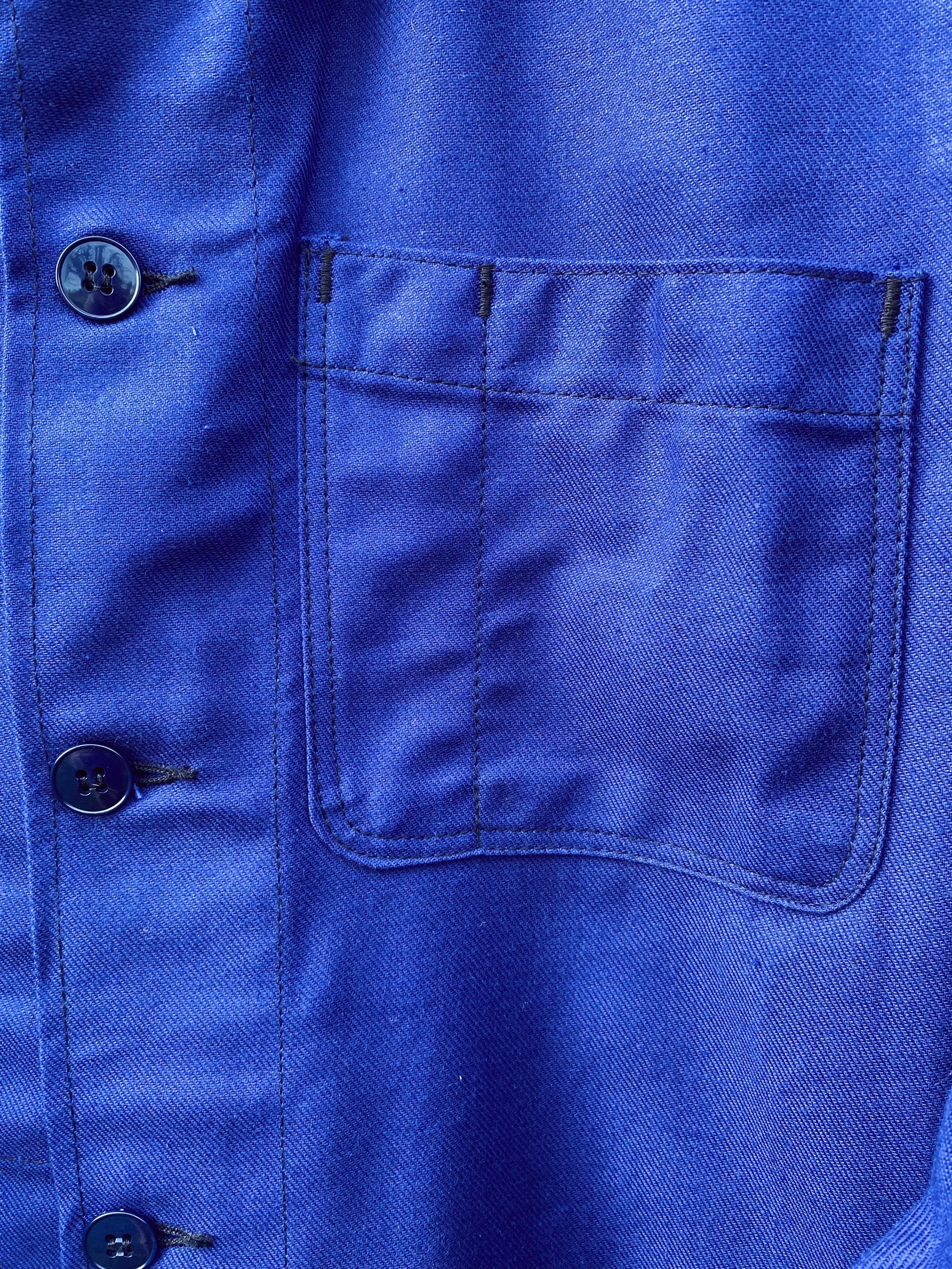 Dit indigo blauwe jasje is gemaakt van stevig katoen en is een (dames)maat 40/42 of L. Het jasje (waarschijnlijk uit begin jaren '70) is ongedragen.