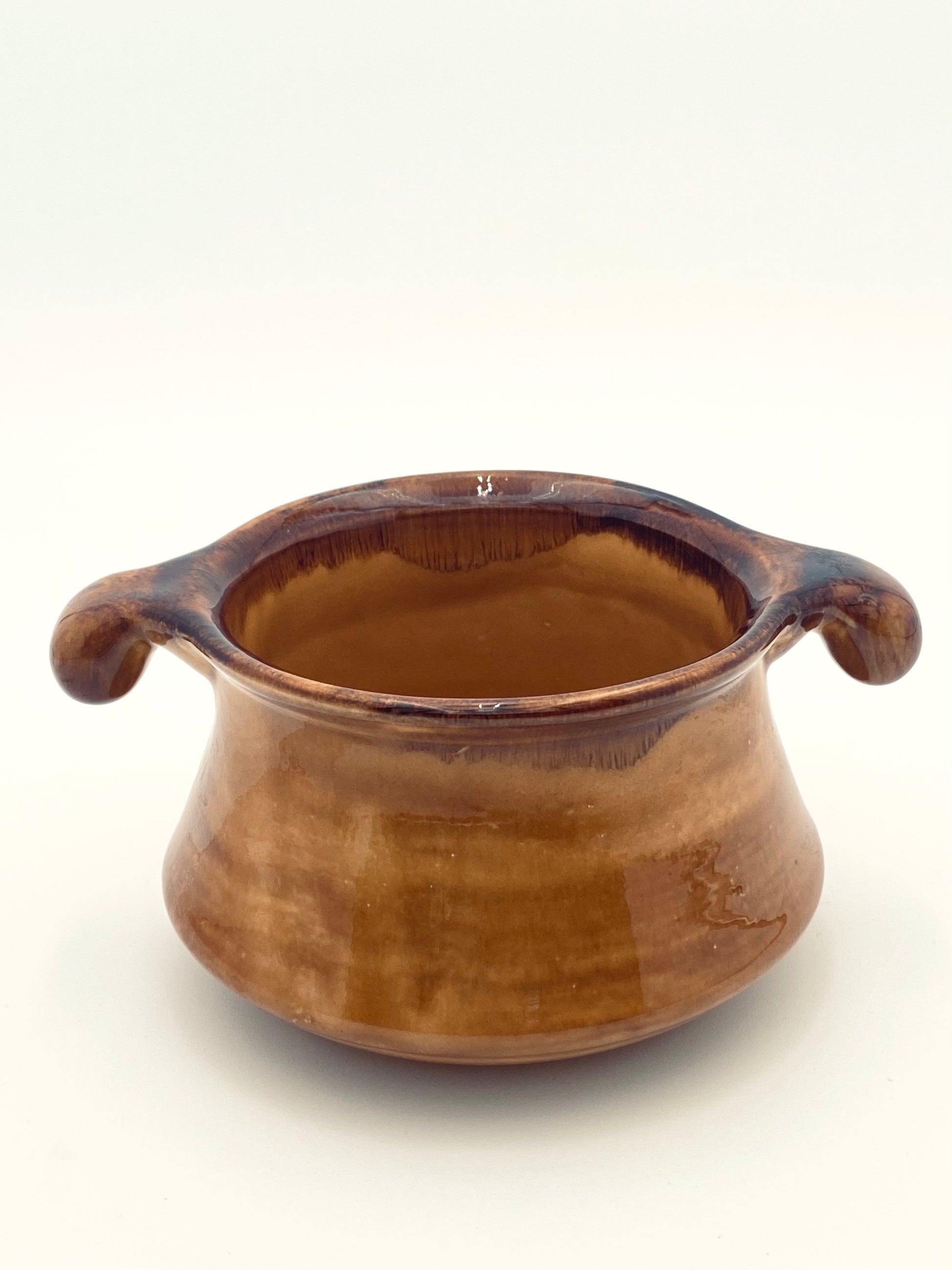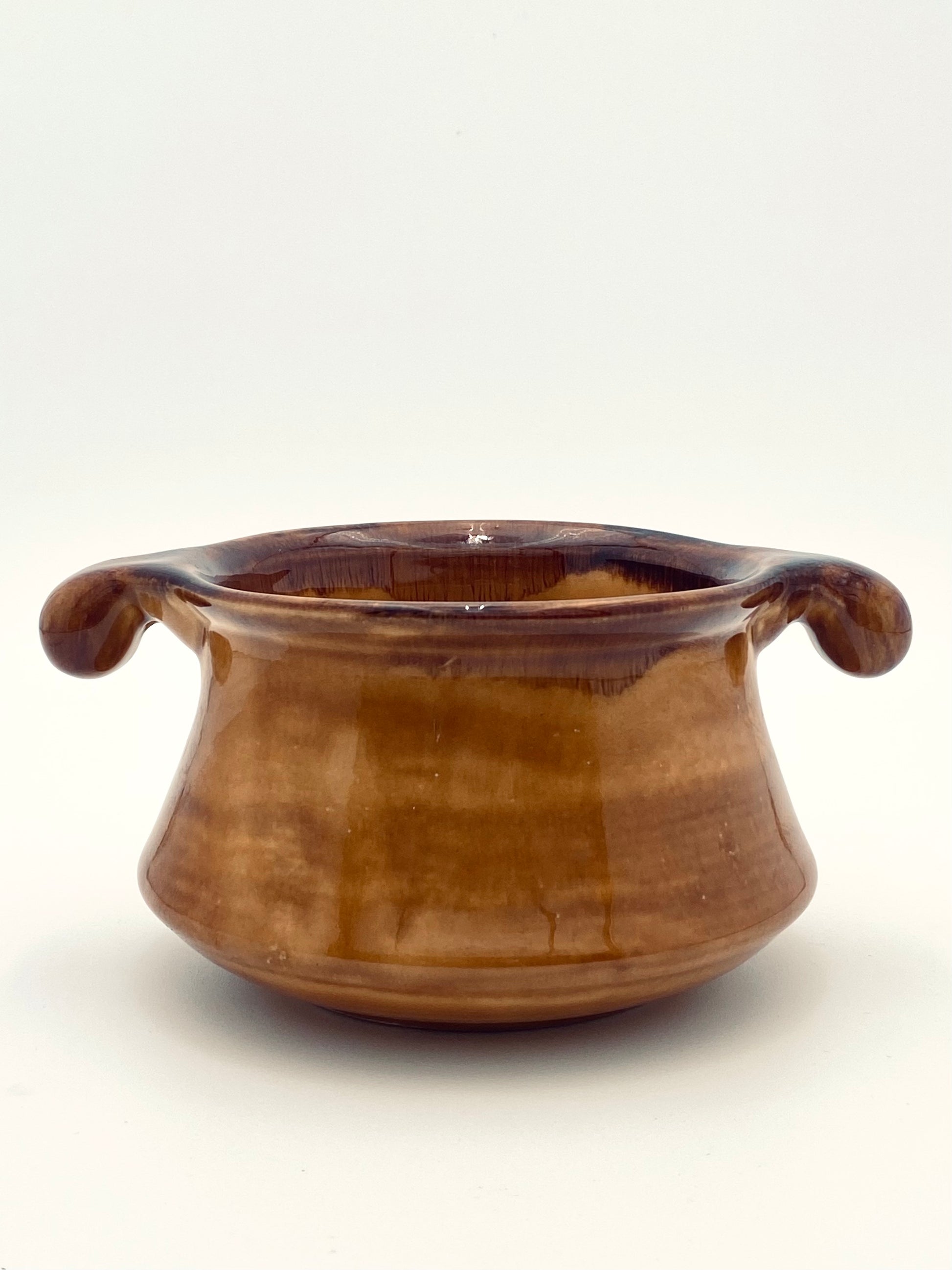 Deze handgemaakte, okergeelbruin geglazuurde St. Clément kom, mét oortjes, komt vermoedelijk uit de jaren '50-’60 en is echt een keukenklassieker. De kom is perfect voor je soupe à l’oignon, een stofpotje of een salade, maar eerlijk is eerlijk: hij is zó mooi dat je hem waarschijnlijk gewoon op het aanrecht laat staan. De kom heeft op het bolste punt een doorsnede van 18 cm en is 9cm hoog.