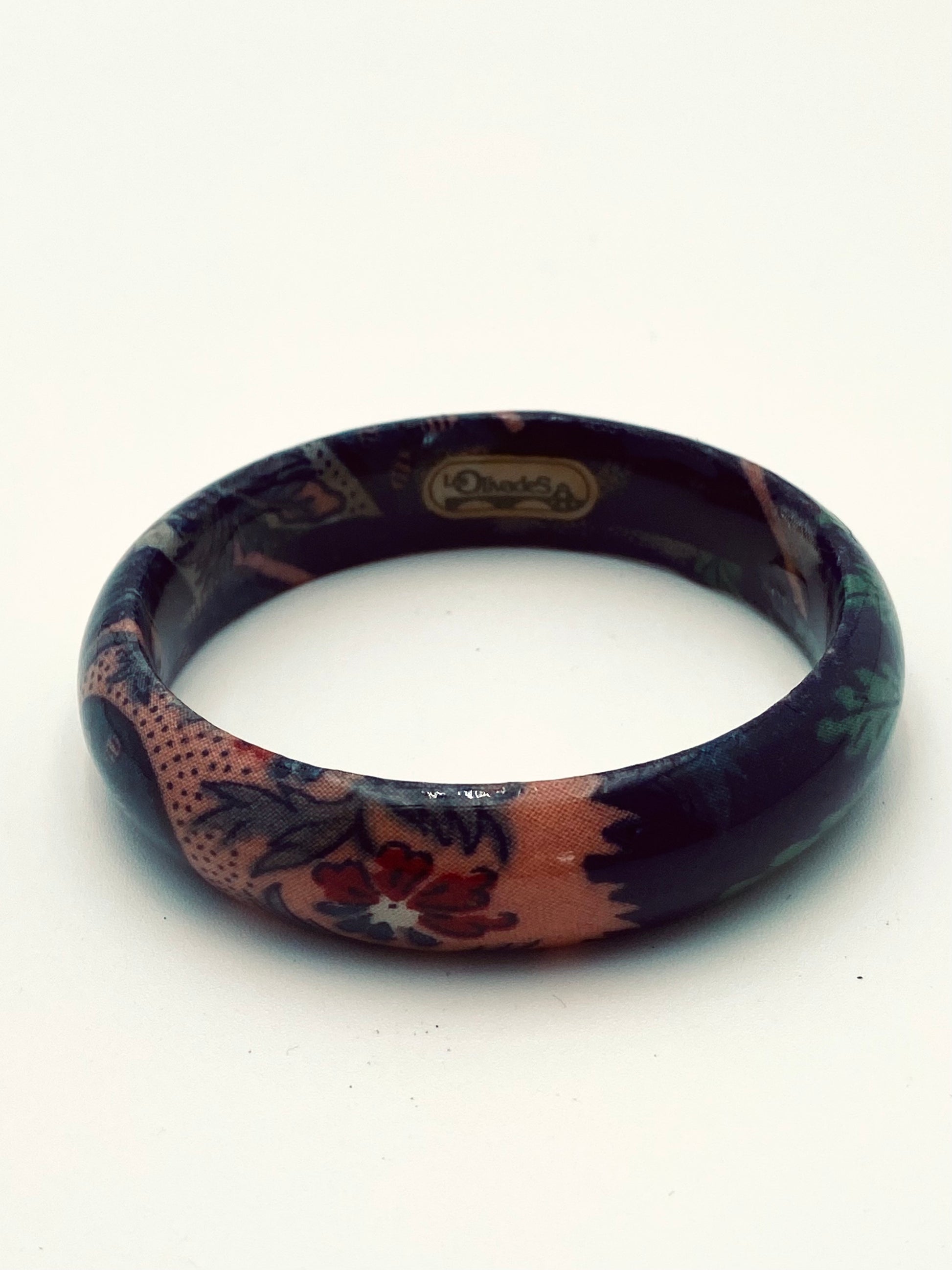 Deze armband komt vermoedelijk uit de jaren '70 en is bekleed met een gecoate Les Olivades stof en heeft een doorsnede (binnenin gemeten) van 7cm.
