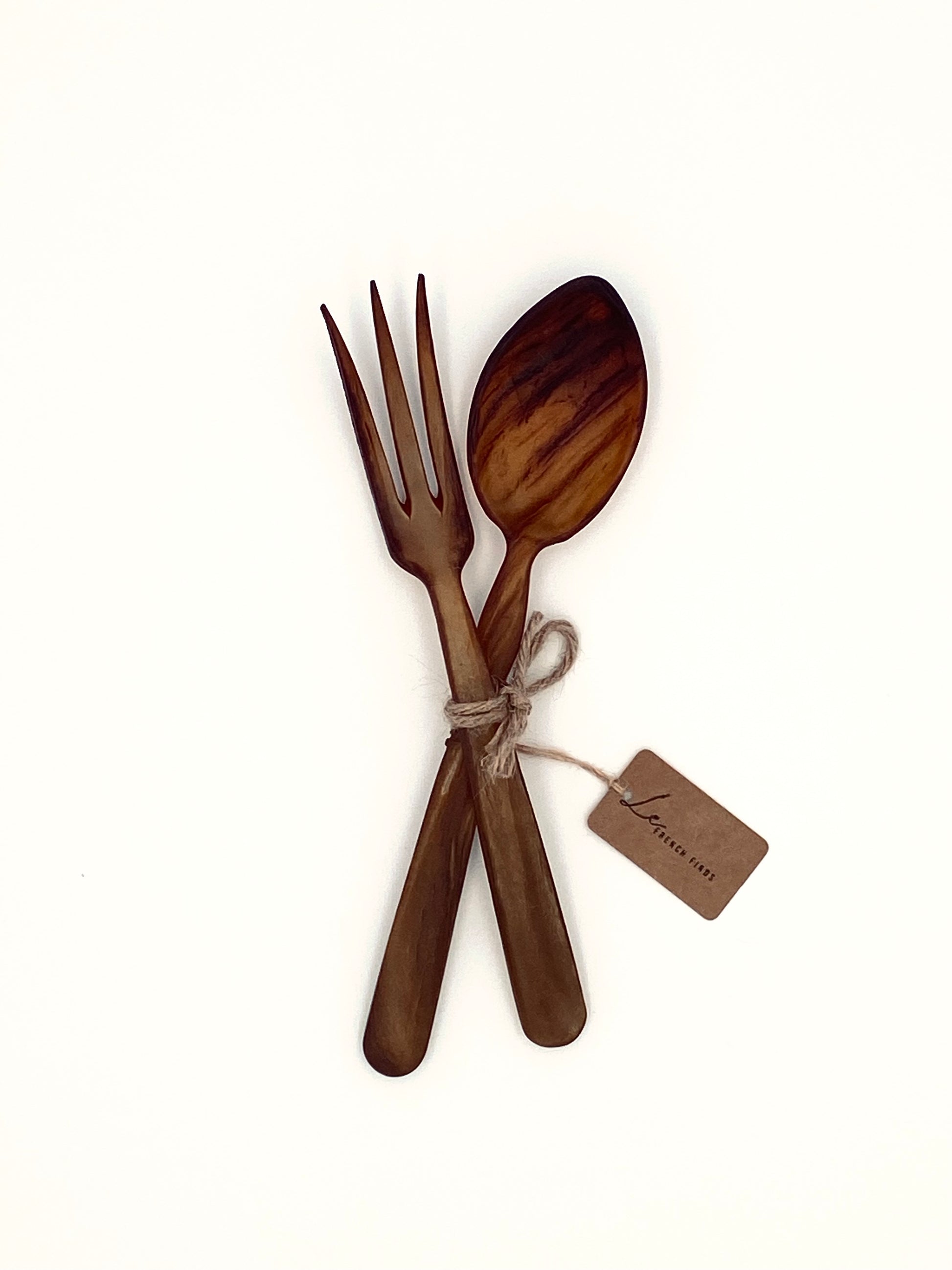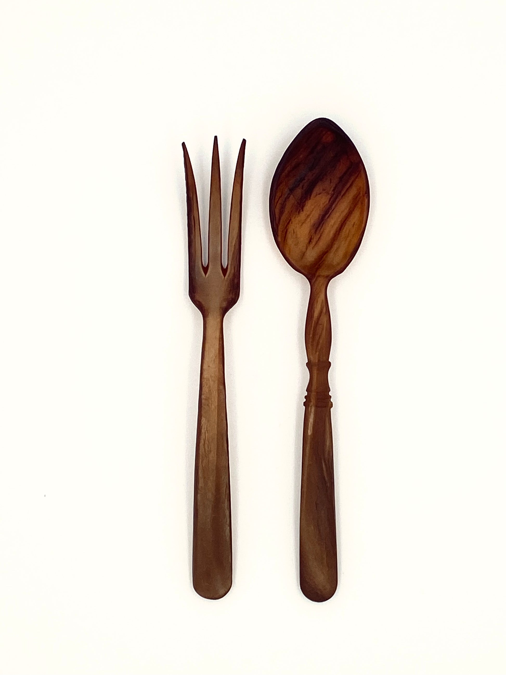 Dit handgemaakte vintage sla bestek van natuurlijk hoorn is een duo met karakter. Licht van gewicht, mooi van kleur, tikkie robuust en vermoedelijke uit de jaren '50 of '60.
