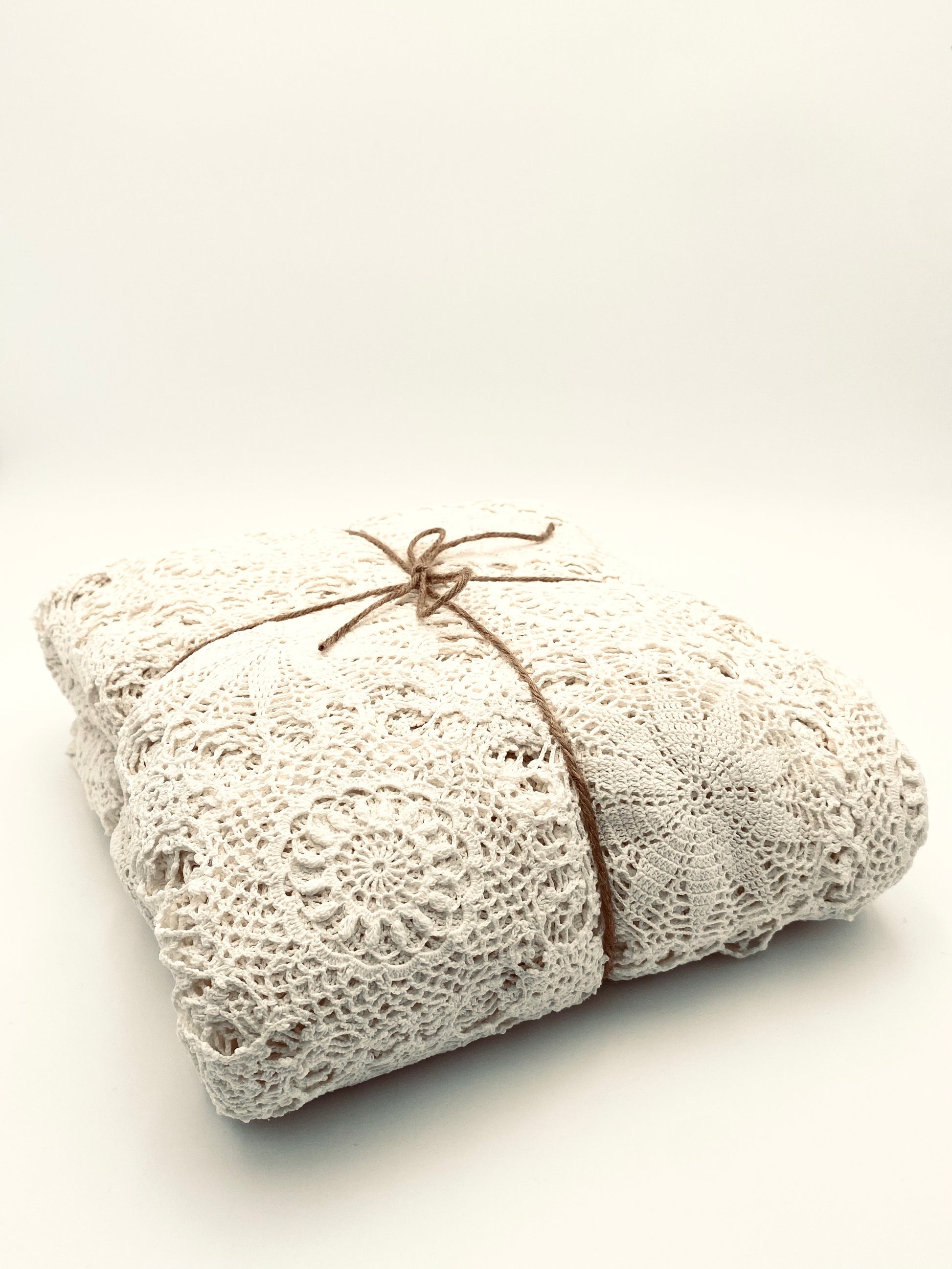 Dat deze, met de hand gehaakte, katoenen plaid, door de tijd nog zo goed bewaard is gebleven, is echt uniek. Met dit soort zeldzame vondsten vragen we ons vooral af wie het heeft gemaakt. En ook waar en voor wie en hoeveel uur er aan is gewerkt. Dat alles maakt zo'n vondst nog bijzonderder. Deze plaid au crocheté is mooi als sprei voor op je bed, als tafellaken om een grote tafel mee te dekken, als gordijn voor het raam te hangen of als grand foulard op de bank te drapperen.