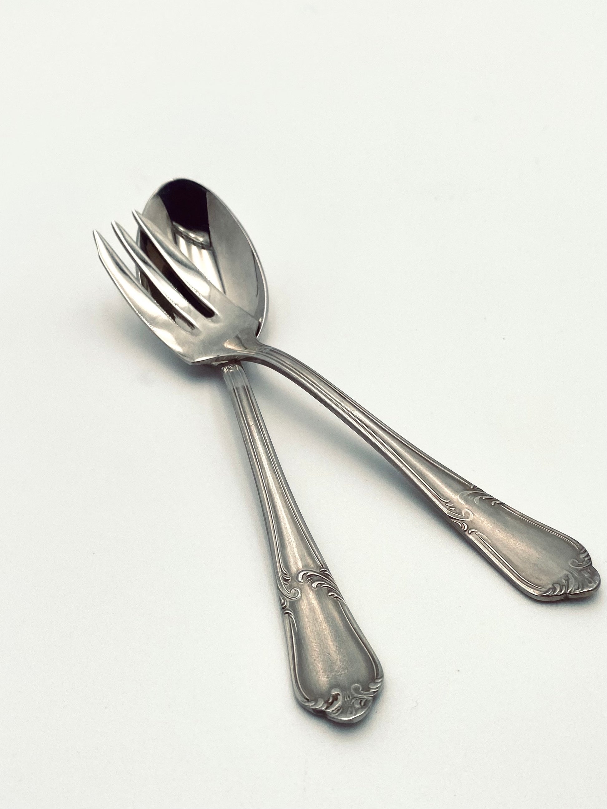 Met dit oude Guy Degrenne duo zet je wel de puntjes op de 'i' als je een taartje of toetje gaat eten. Het dessert vorkje met bijpassend lepeltje wordt als duo verkocht