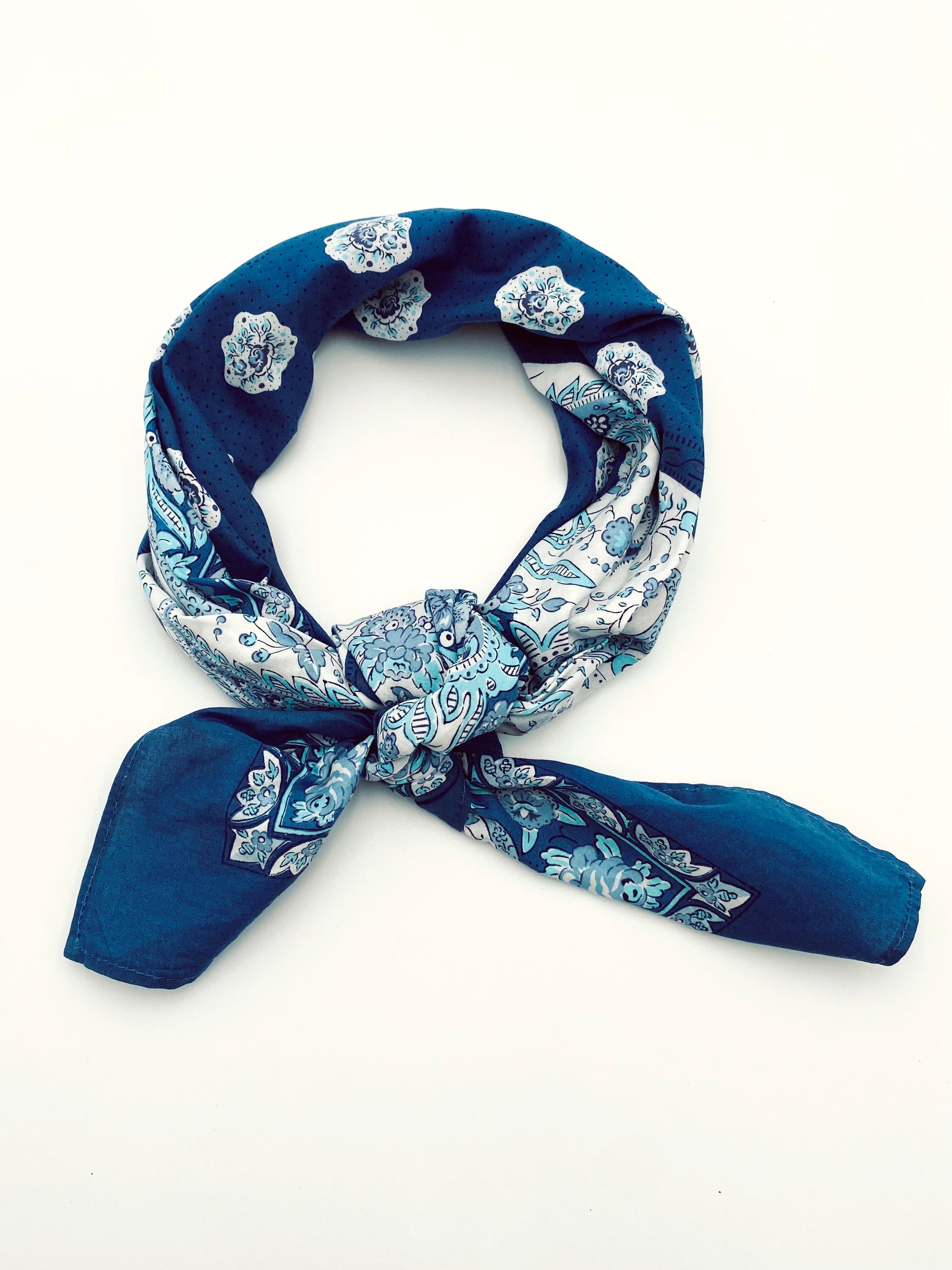 Le grand foulard vintage Les Olivades à fleurs bleues