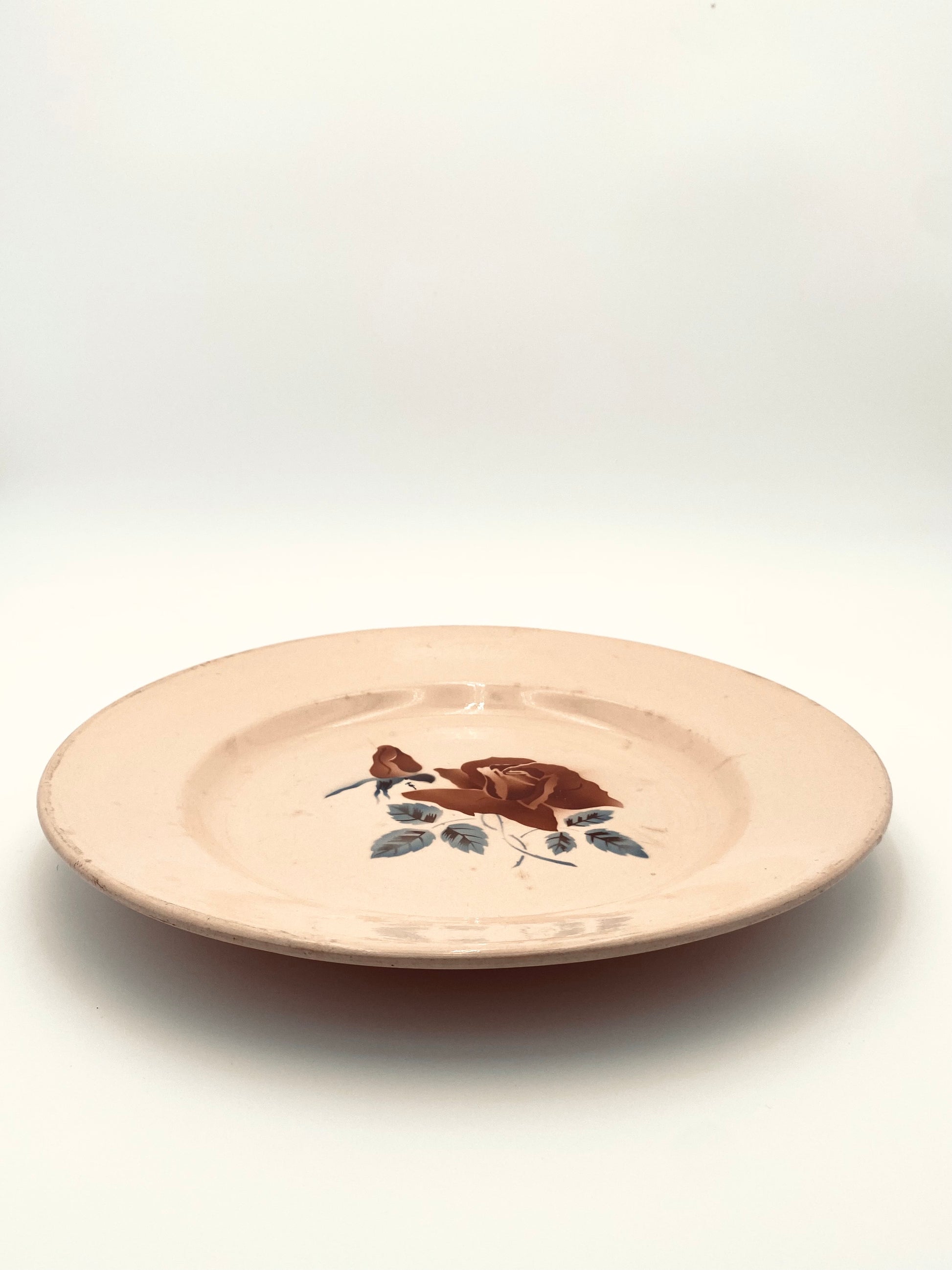 Groot, perzik kleurig Digoin et Sarreguemines bord met rozen. Handig als serveerschaal of als wandbord voor aan de (keuken) muur.