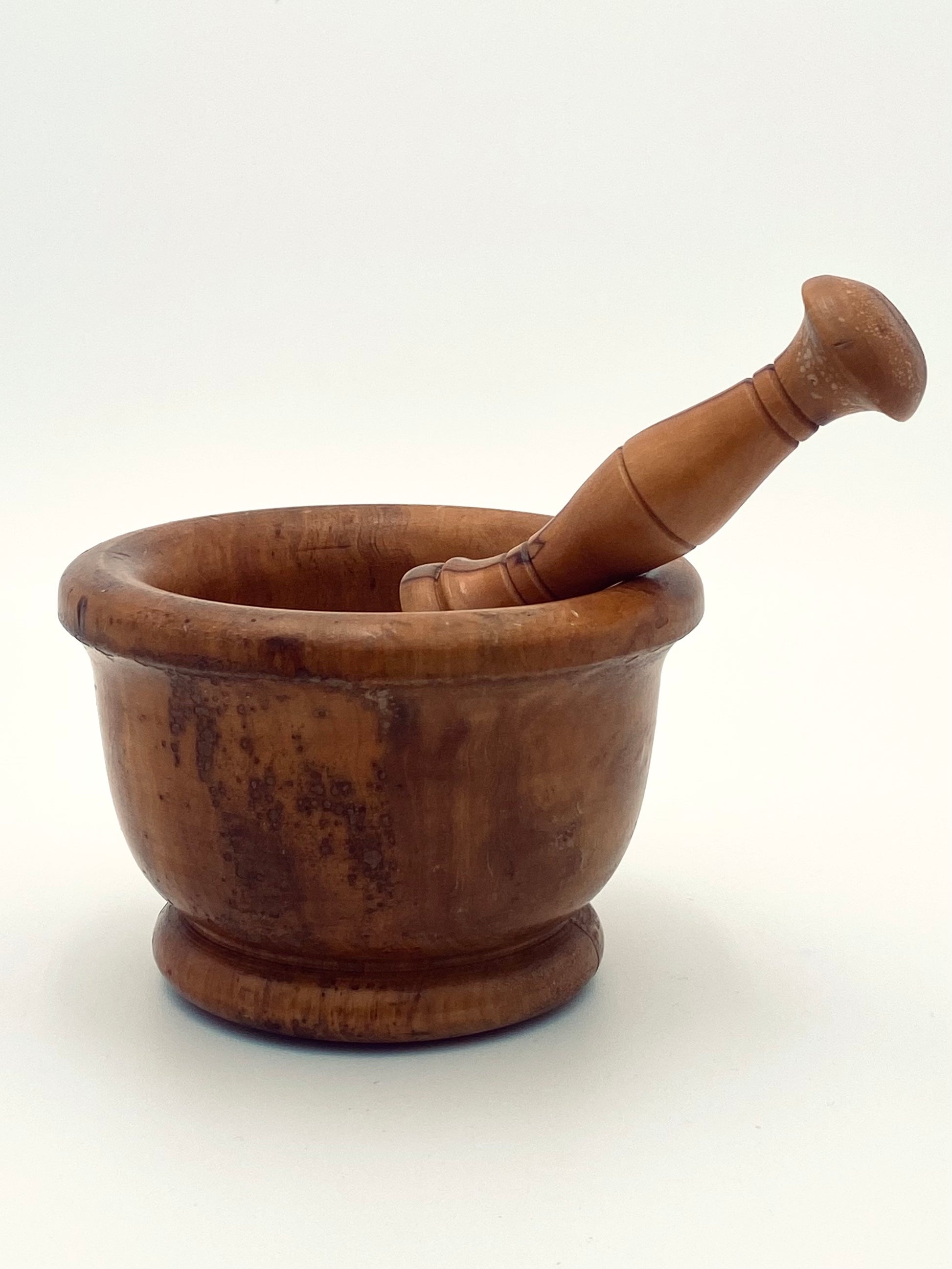 De must-have voor elke kok: een vijzel. Dit oude, massief houten, handgemaakte exemplaar is niet alleen praktisch, maar nog knap ook. De pot is 8,5cm hoog en heeft een doorsnede van 12,5cm. De stamper is 16cm lang.
