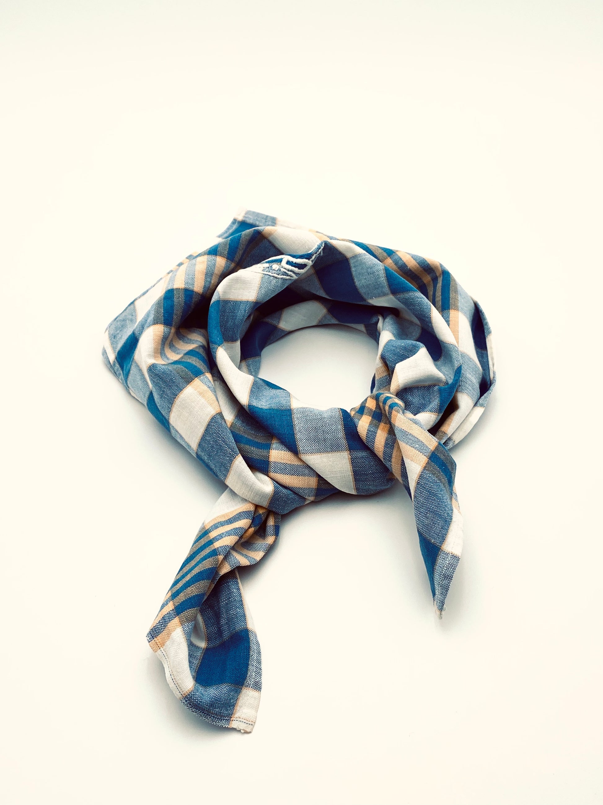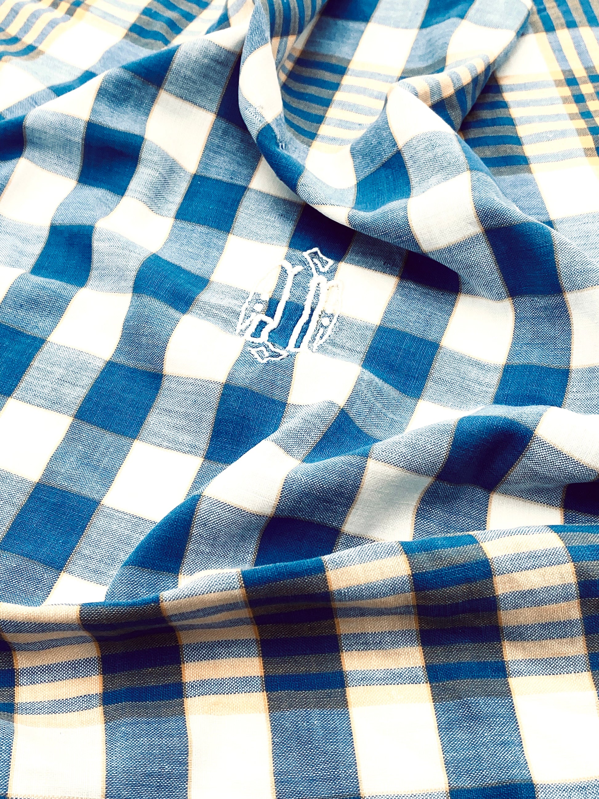 Le mouchoir, oftewel de zakdoek. Je kan er natuurlijk heel stijlvol je neus in snuiten, maar wij dragen ze liever als sjaaltje om onze nek. Dit exemplaar van zacht, soepel katoen in een blauwe, witte en gele ruit heeft een met de hand geborduurd initiaal.