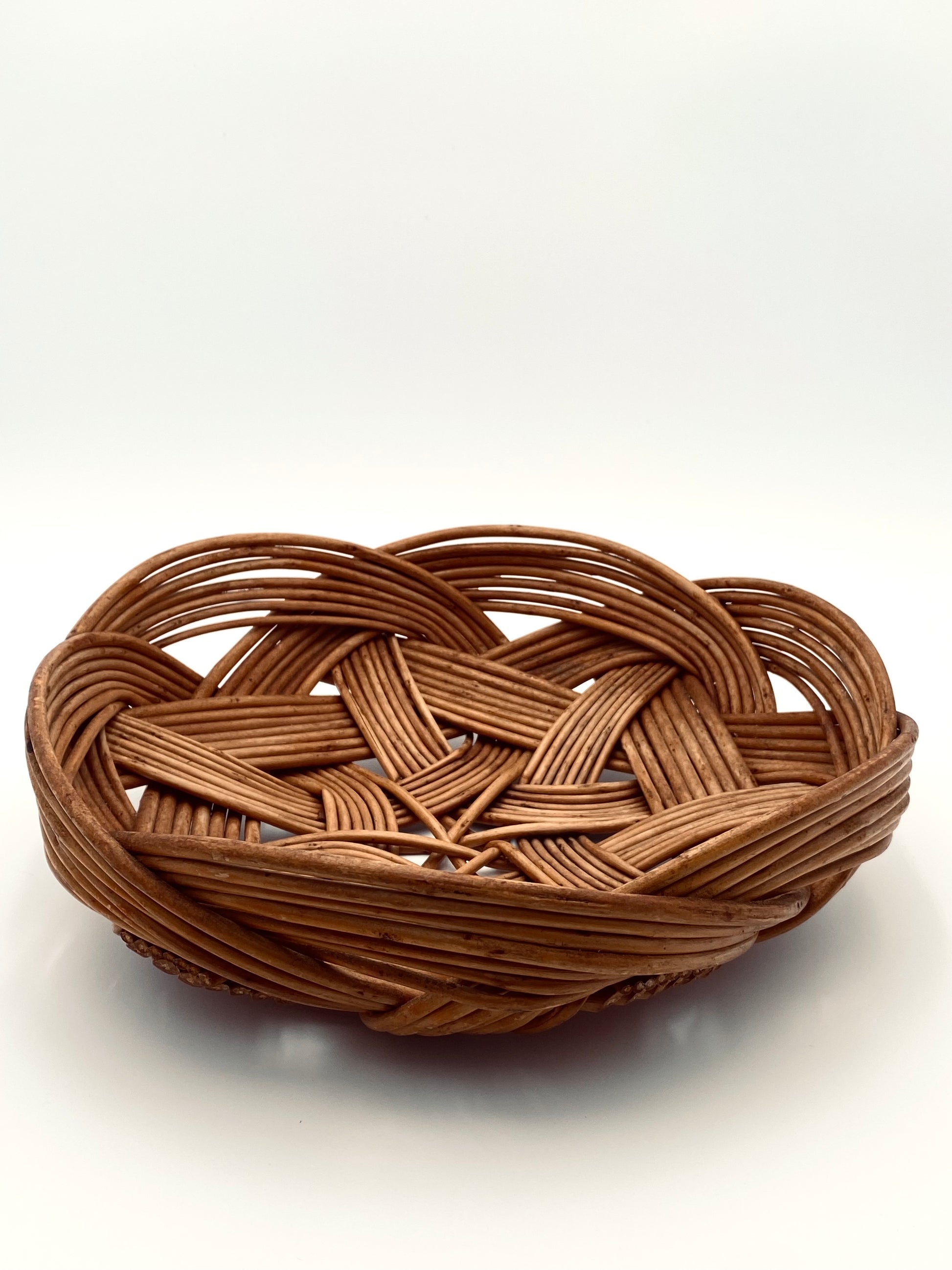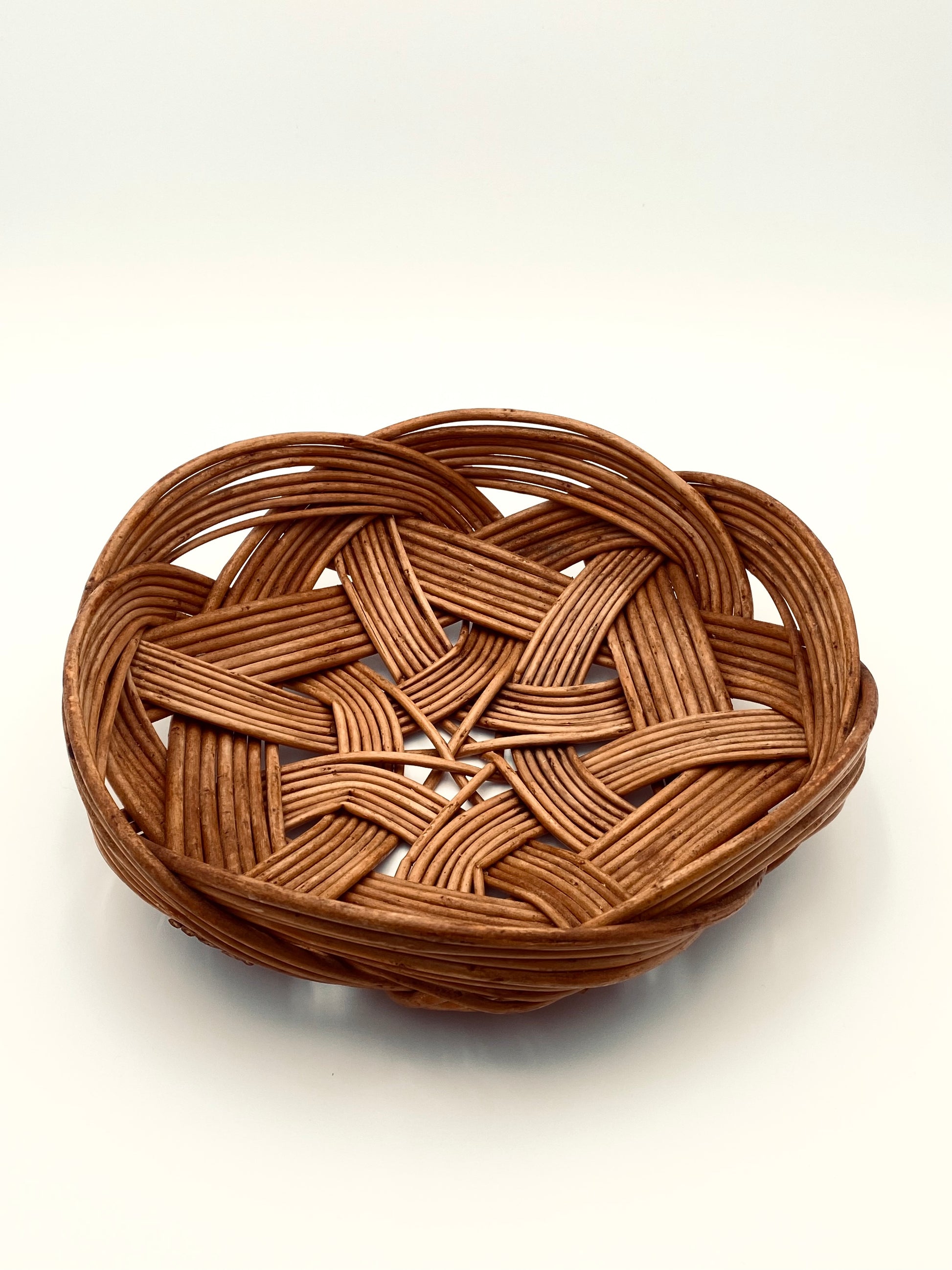 Hand gevlochten, oude rieten mand. O.a. handig als fruitschaal, losse items in te bewaren of mooi als kunstobject aan de muur.