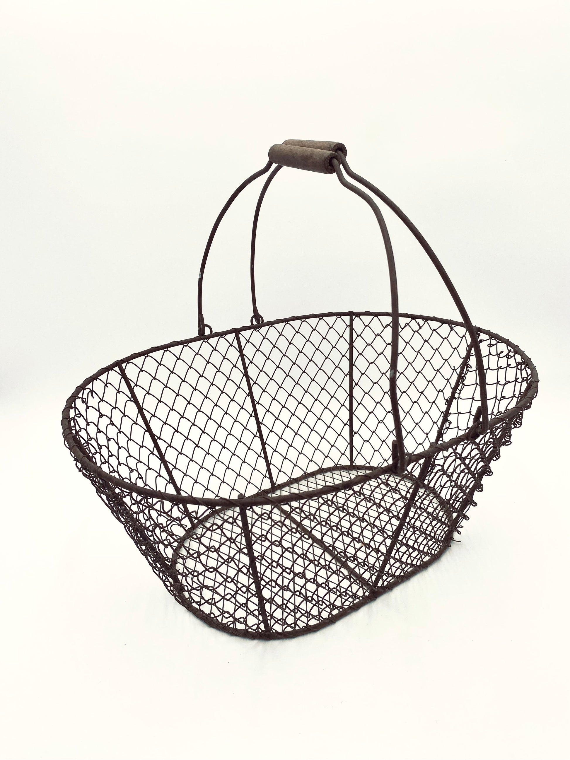Deze oude, metalen mand met houten handvaten heeft gebruikerssporen die juist ook weer een verhaal vertellen: van worteltjes oogsten in de moestuin tot paddestoelen zoeken in het bos. Perfect als oogstmand, om eitjes of groente in te bewaren of om zelf paddestoelen mee te gaan zoeken.
