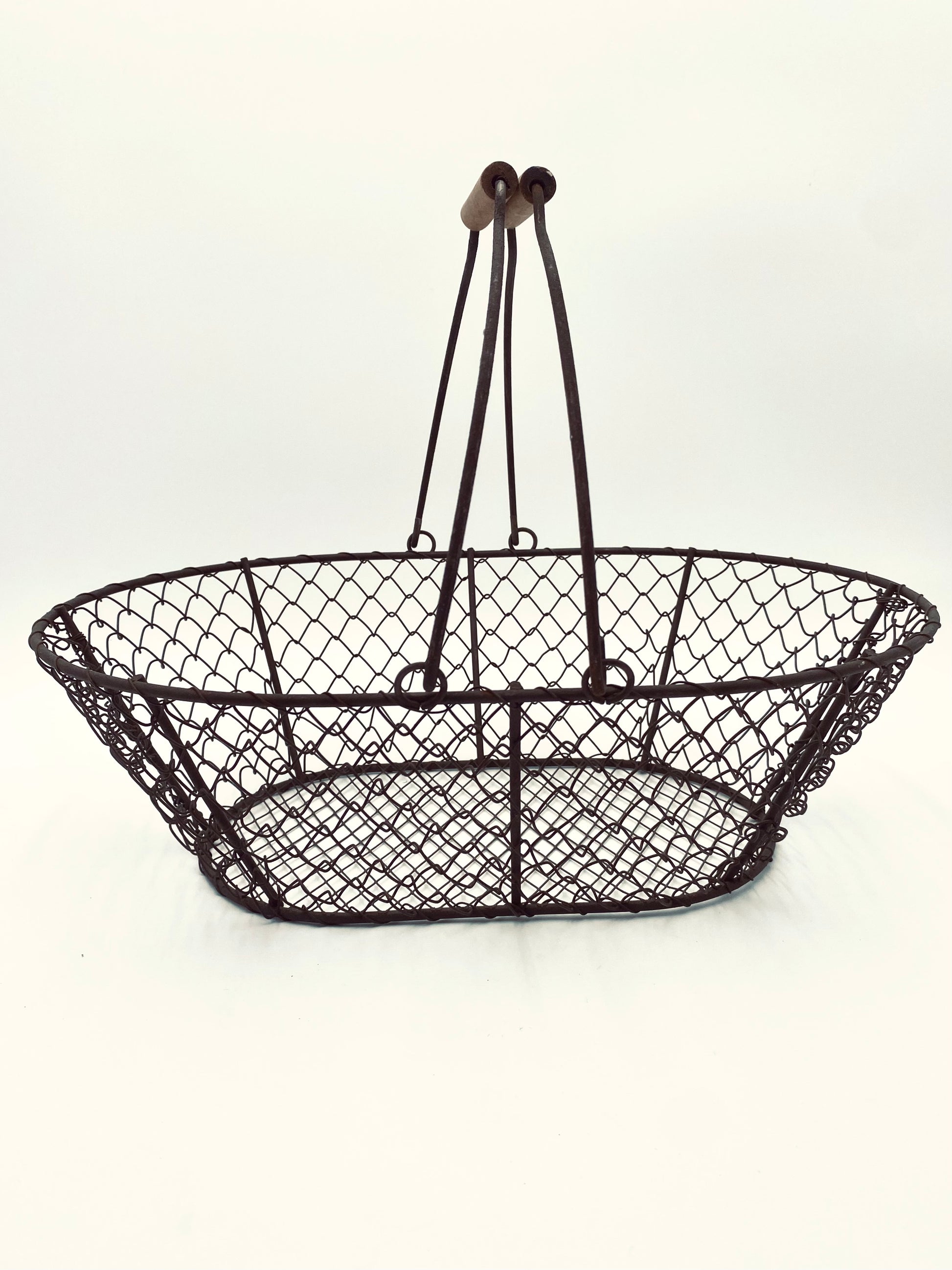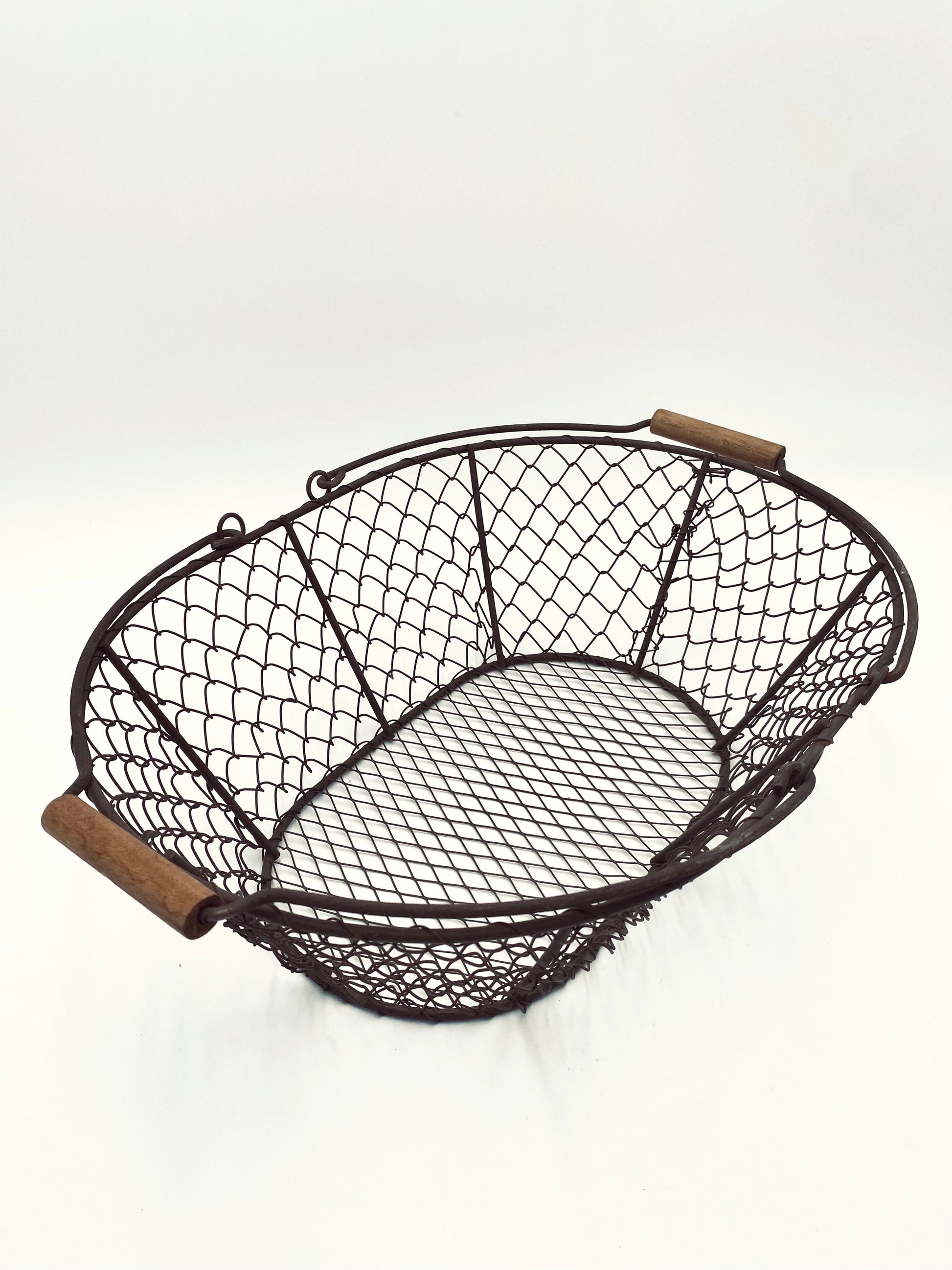 Deze kleine, oude, metalen mand met houten handvaten heeft gebruikerssporen die juist ook weer een verhaal vertellen: van worteltjes oogsten in de moestuin tot paddestoelen zoeken in het bos. Perfect als kleine oogstmand, om eitjes in te bewaren of om zelf paddestoelen mee te gaan zoeken.