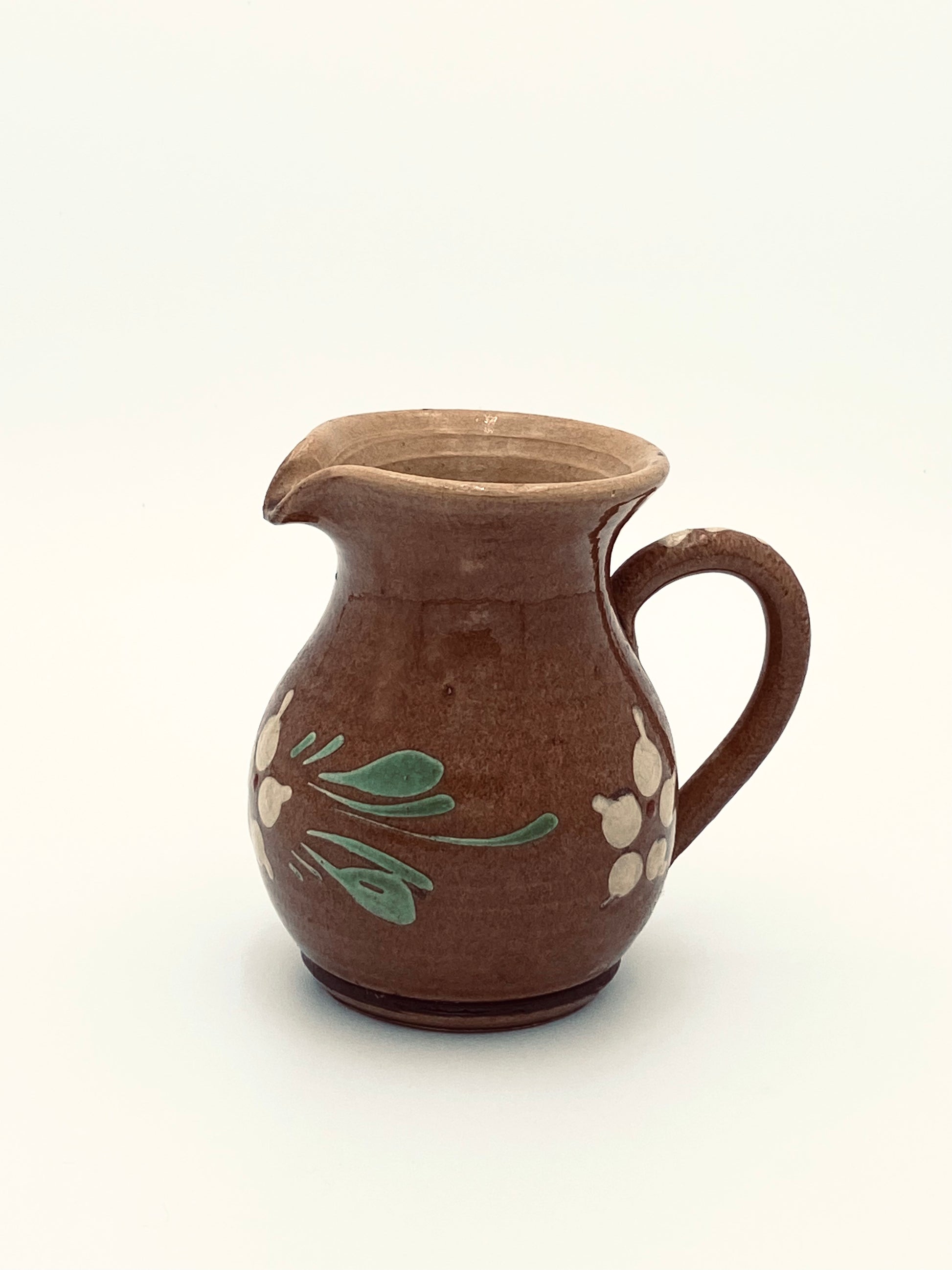 Een kleine, handgemaakte Alsacien kan van aardewerk met handbeschilderde bloemen. Mooi op tafel als water- of melkkannetje of als vaasje voor je vers geplukte bloemen.