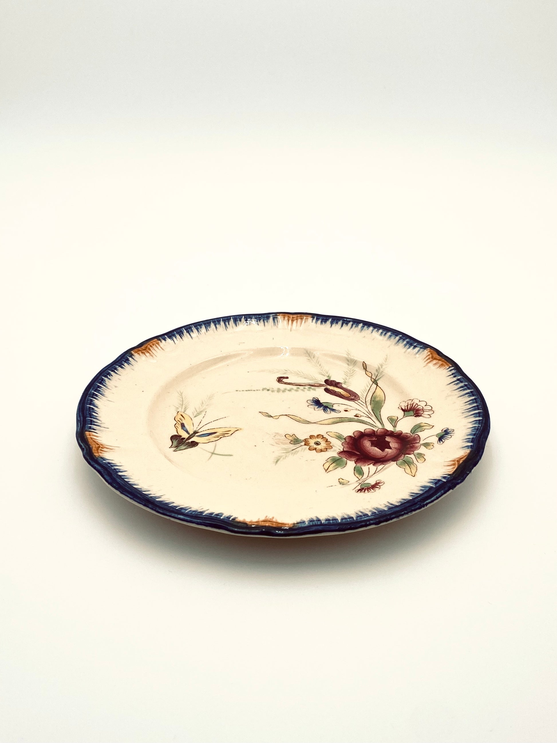 Lief, klein, oud bordje van Faiencerie de Longchamp (model Avril Fleur Papillon). Niet alleen het perfecte bordje voor je croissant, maar ook mooi als wandbord voor aan de (keuken)muur. De bordjes worden los verkocht.