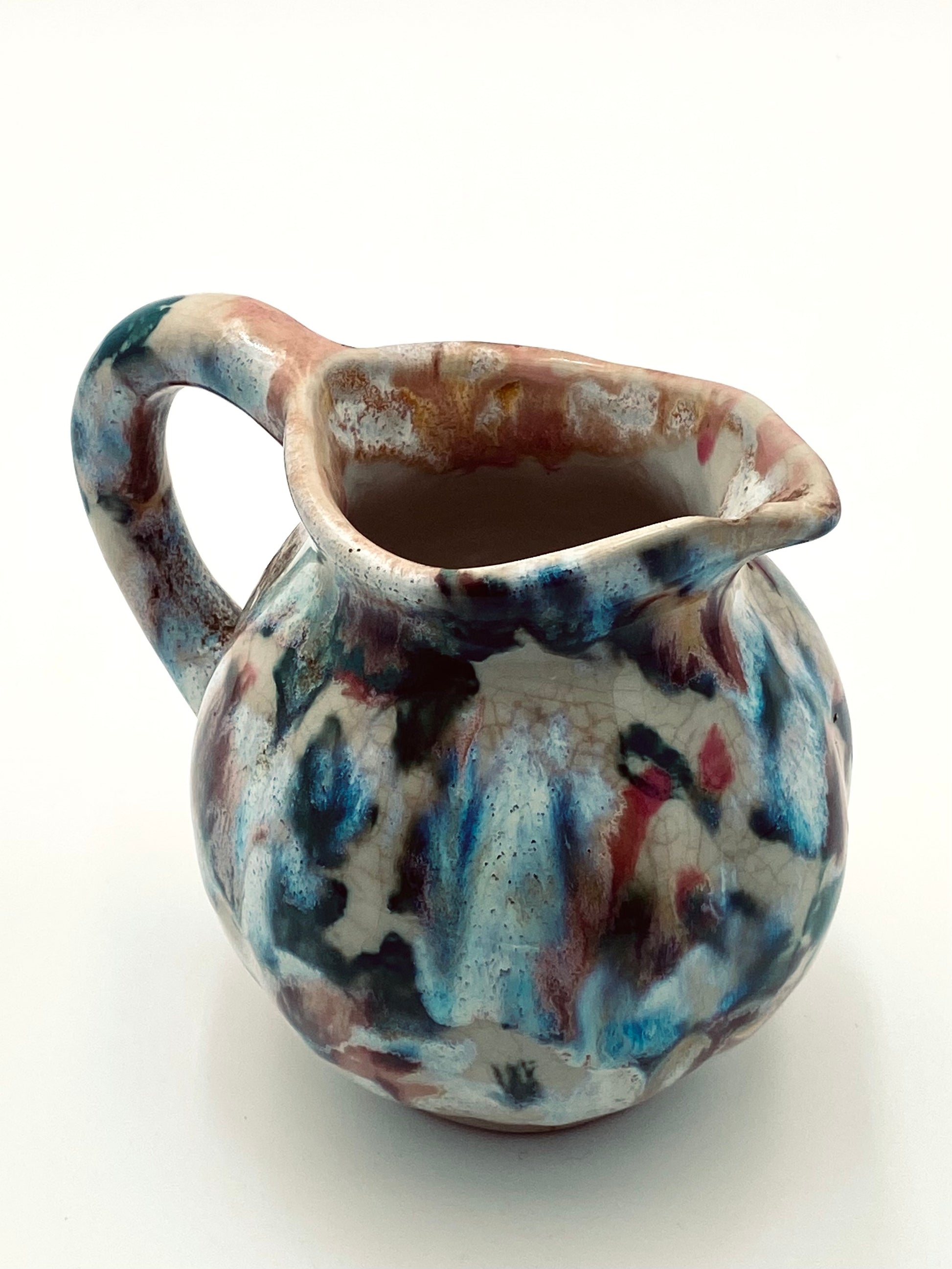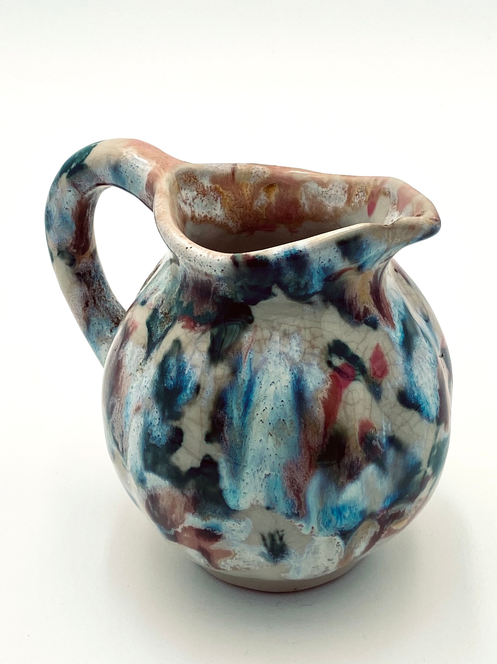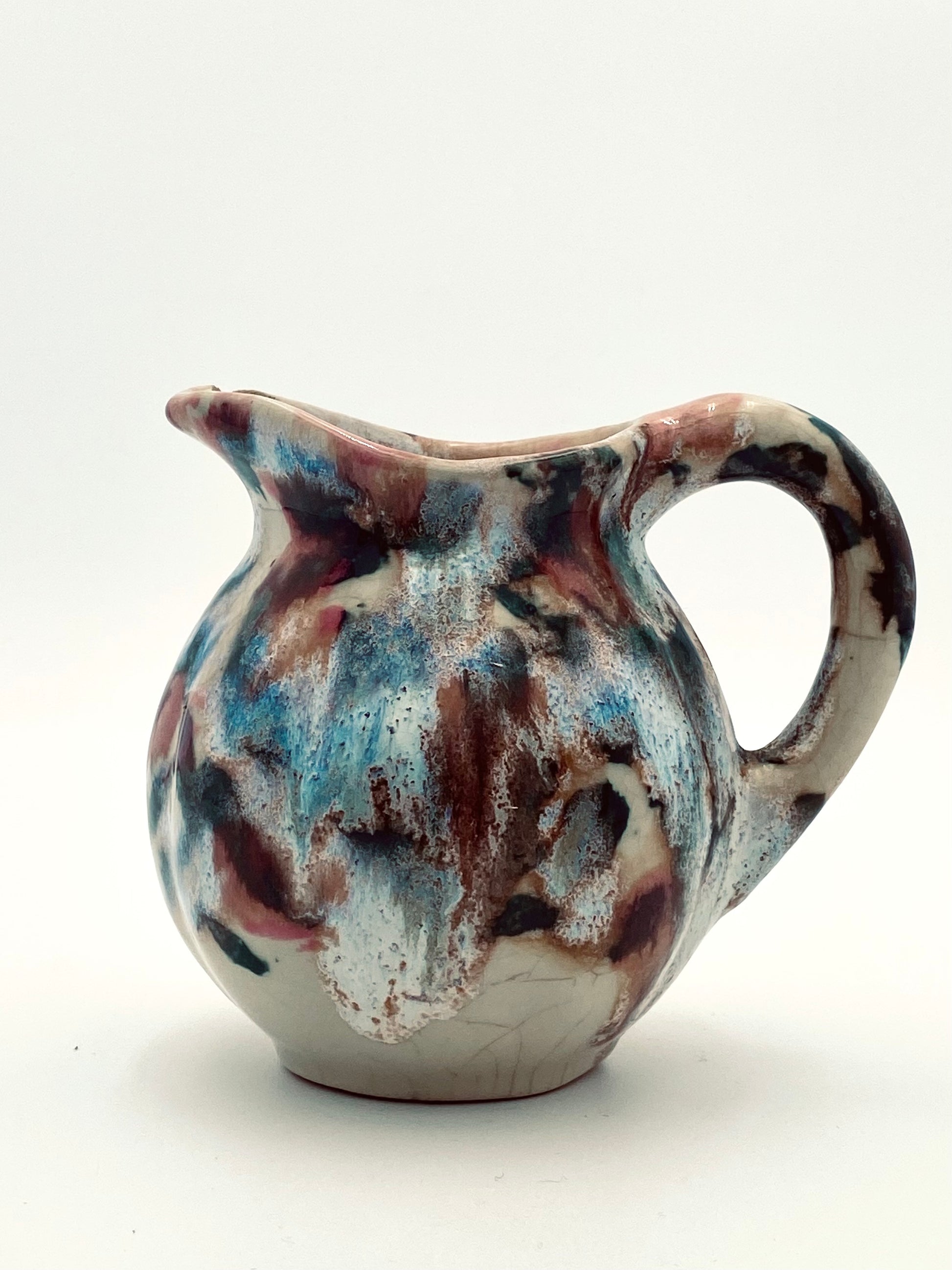 Deze oude, kleurrijke, dik geglazuurde, aardewerken kan heeft zichtbaar al een heel leven achter de rug, maar ondanks de kleine beschadigingen is 'ie er alleen maar mooier op geworden. Sterker de barstjes in het glazuur en een missend stukje geven de kan alleen maar meer karakter. Mooi als aanwinst in je keuken, je penselen in te bewaren of als vaas met een bosje vers geplukte bloemen.