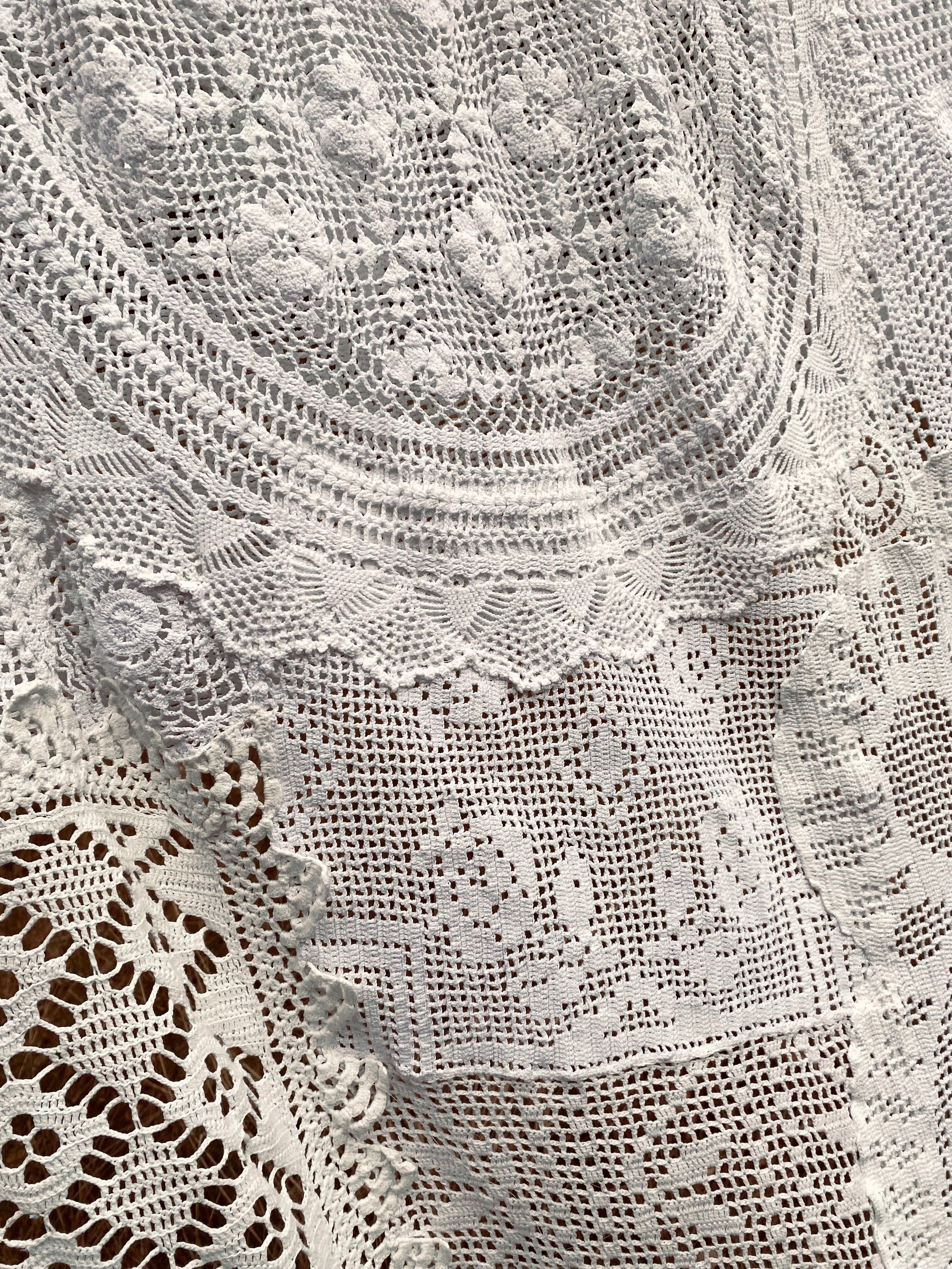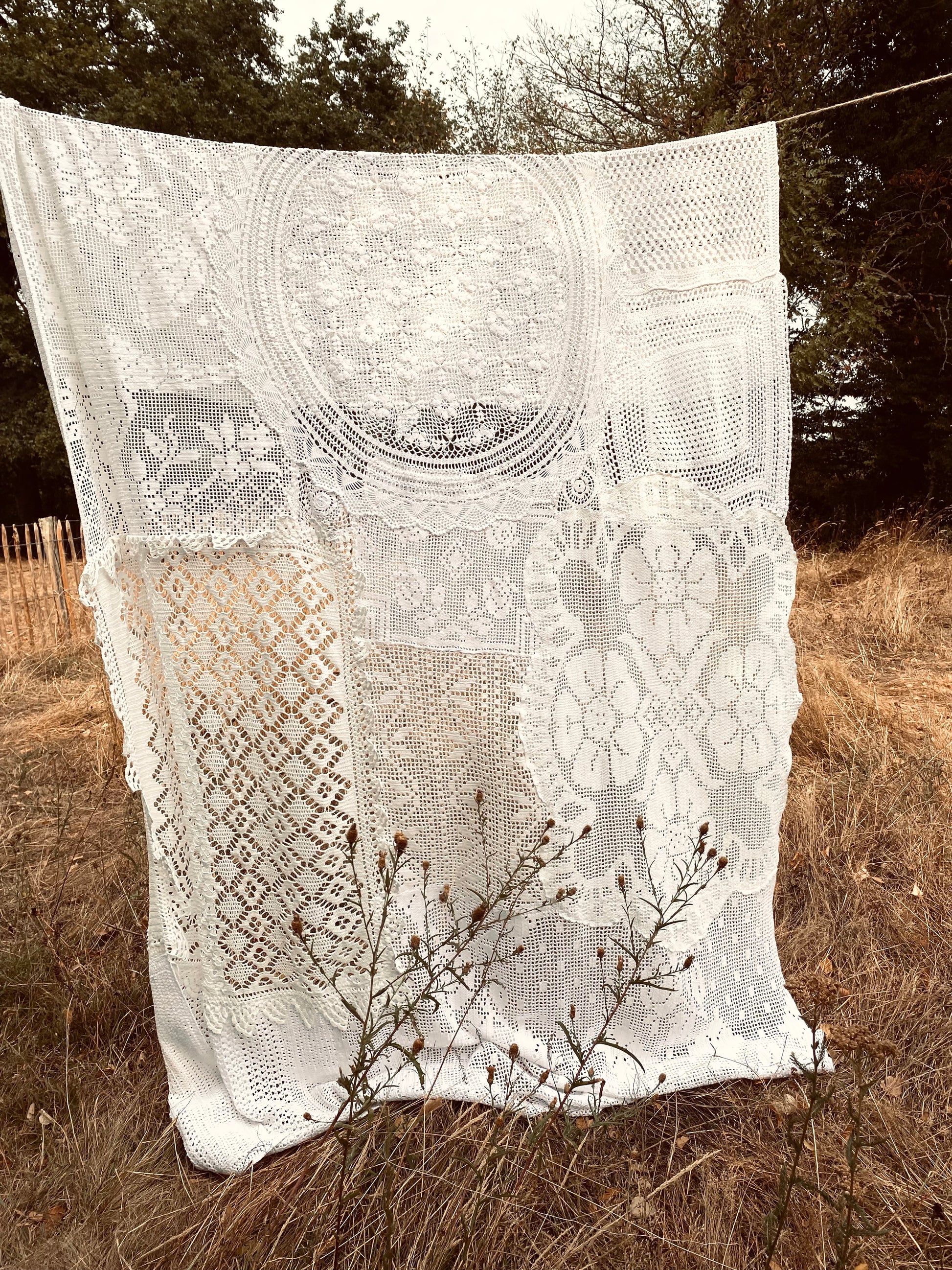 Op bed als een sprei, op de bank als een plaid, op tafel als een kleed of voor het raam als gordijn. Deze patchwork plaid is eigenlijk multi-inzetbaar. Het is een unieke verzameling van oude, met de hand gehaakte katoenen kleedjes die stuk voor stuk weer met hand aan elkaar zijn gezet.
