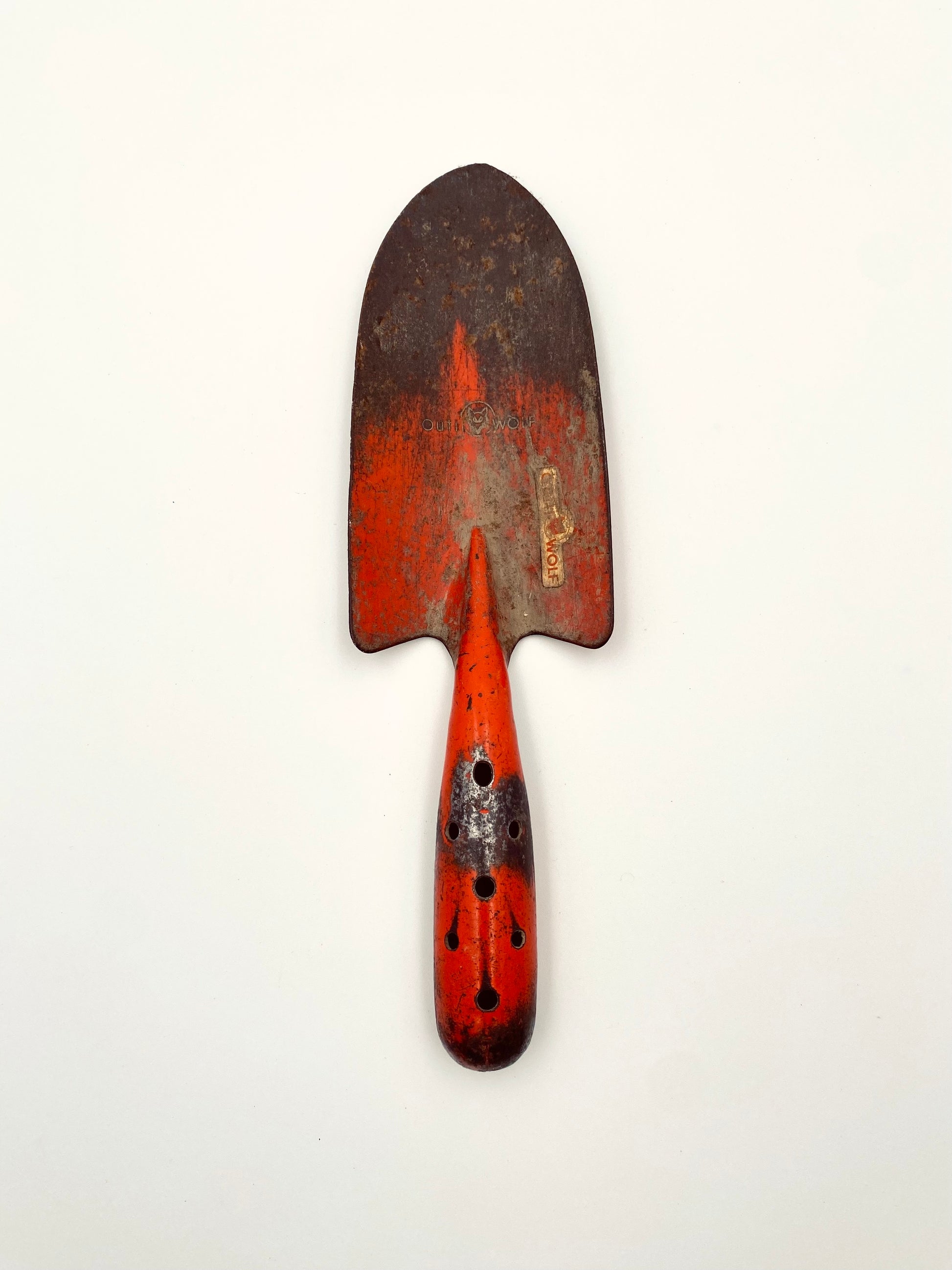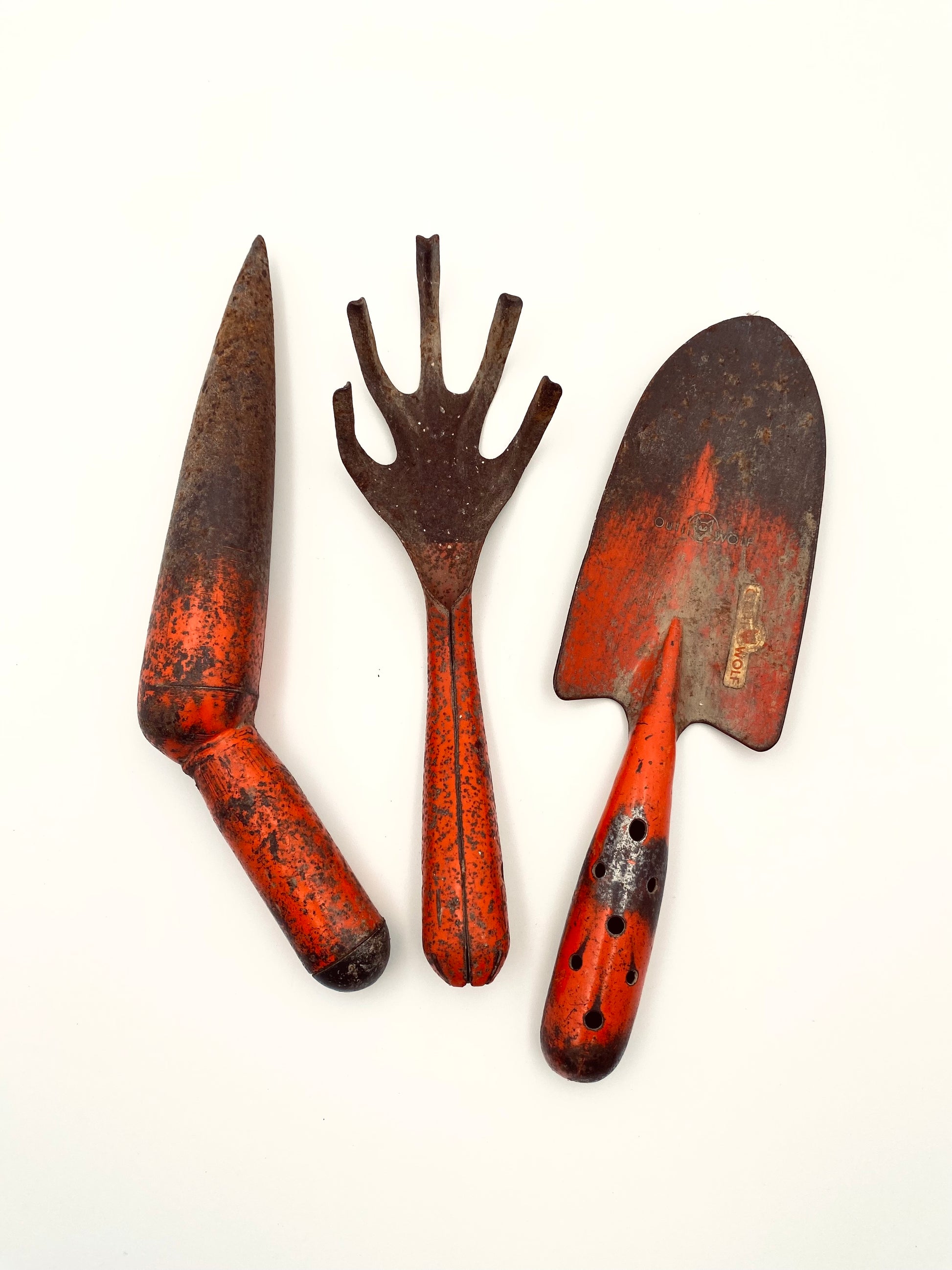 Oude gebruiksvoorwerpen die door de jaren en het vele gebruik alleen maar mooier zijn geworden. Het is ondertussen wel duidelijk dat we daar dol op zijn. Dus toen we eerst het oude, metalen schepje tegenkwamen en al snel daarop het bijpassende harkje en vervolgens de pootstok, toen maakte we ook echt een sprongetje van blijdschap. Ze worden als drietal verkocht