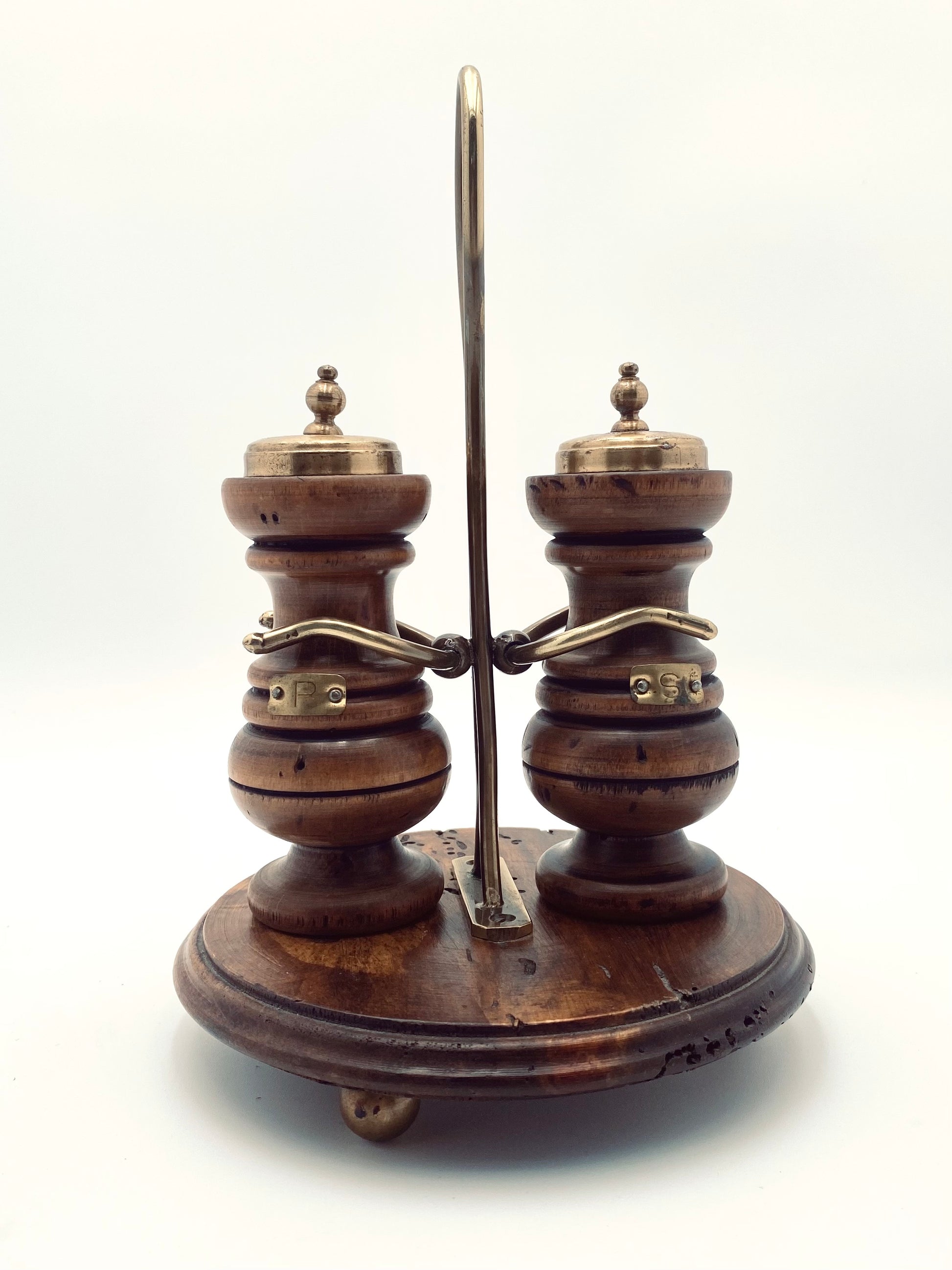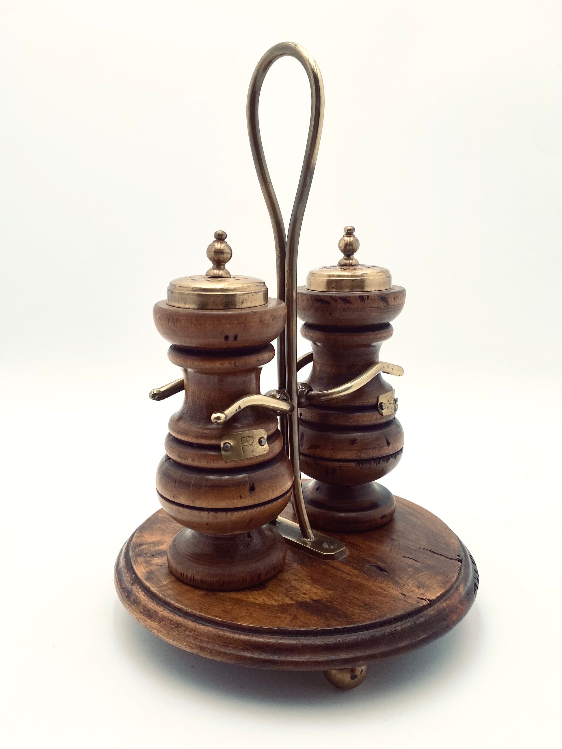 Oud Peper- en zoutstel van hout met koper op een handige serveertray, waarmee je het zo, hop, op tafel zet. De potjes zelf zijn 14 cm hoog en de tray is 25cm