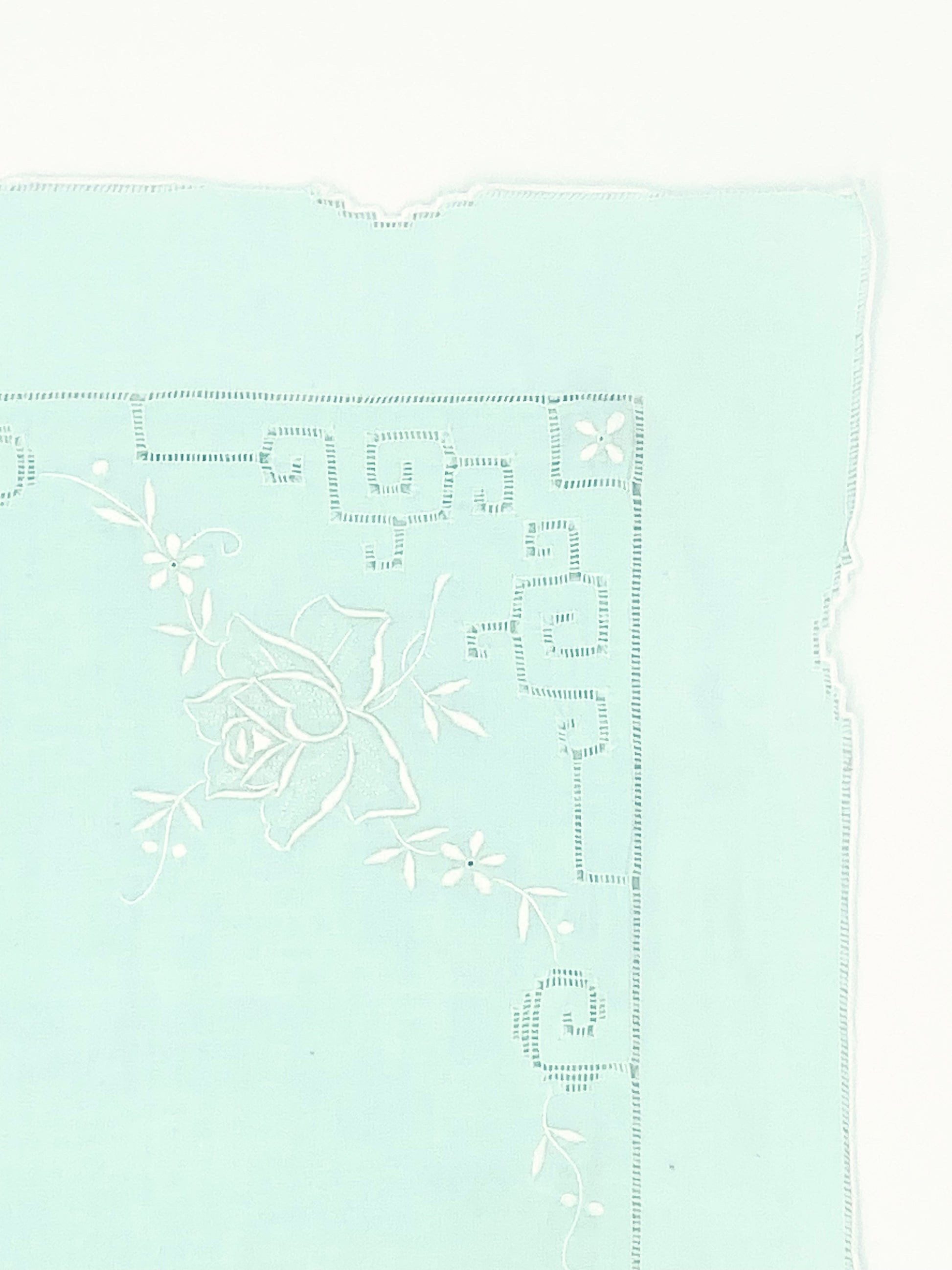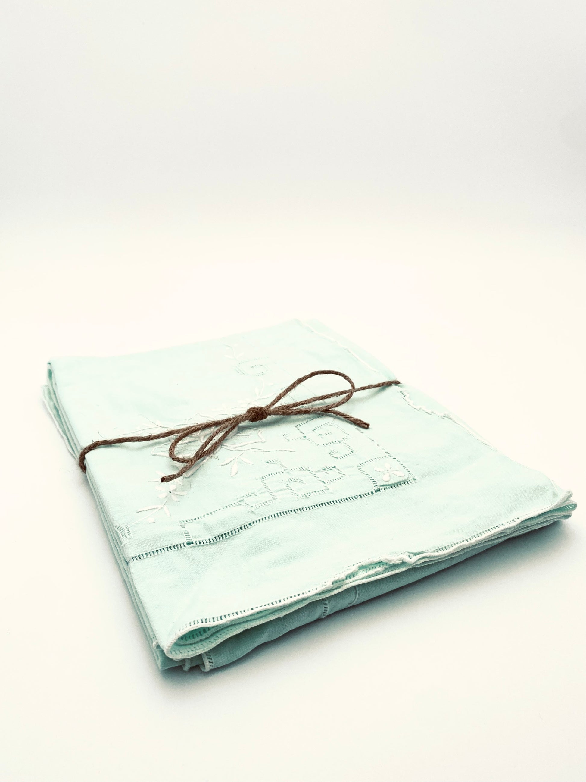 Een set van twee oude, mintgroene katoenen kussenslopen. Subtiel geborduurde rozen en 'jour échelle', oftewel een opengewerkte ajour rand.