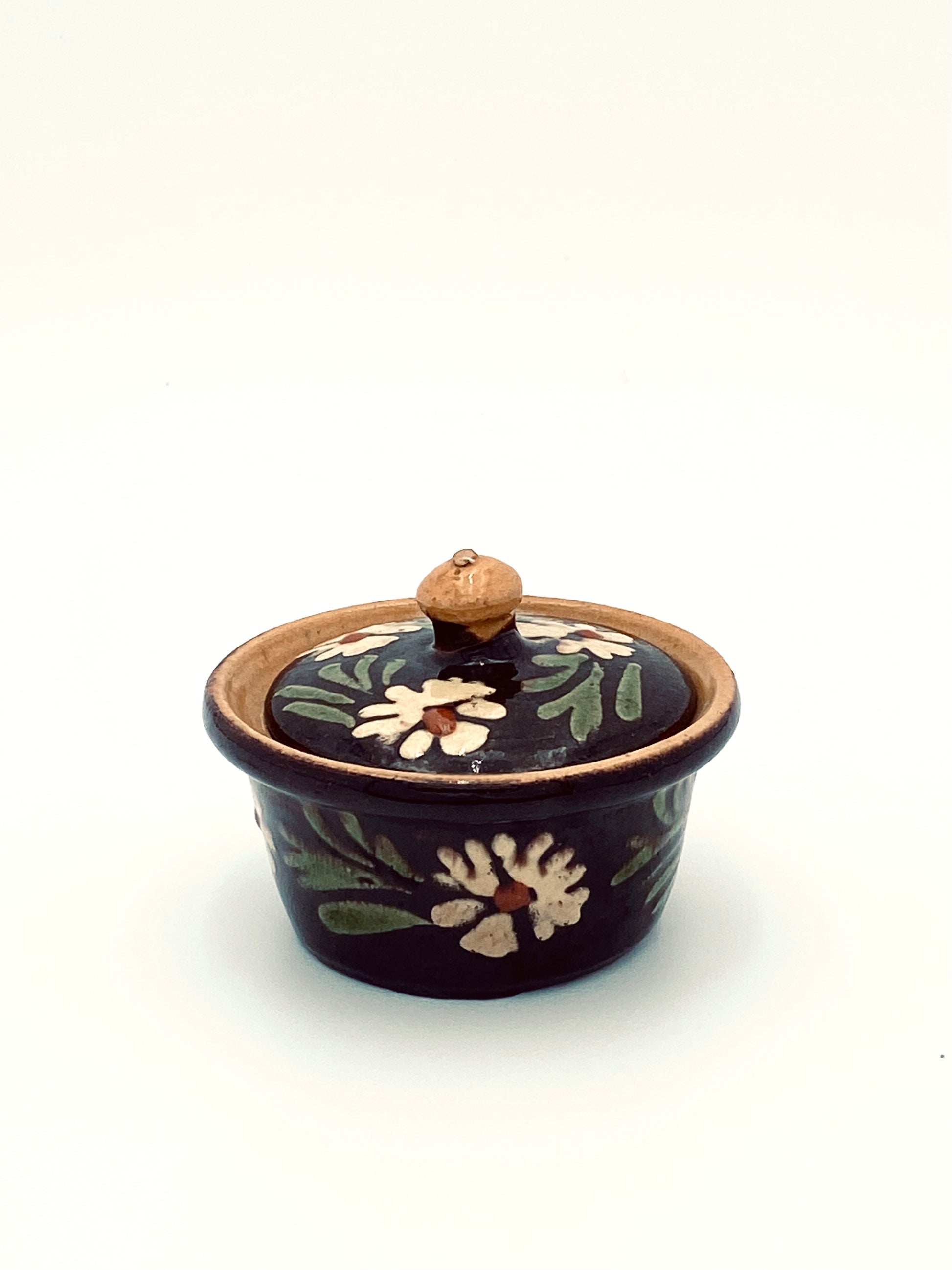 Klein maar heel fijn: een oud handgemaakt aardewerk Alsacienne bakje mét deksel en handgeschilderde bloemen. Om o.a. ieniemienie porties, (kruiden)boter of kruiden in te doen.
