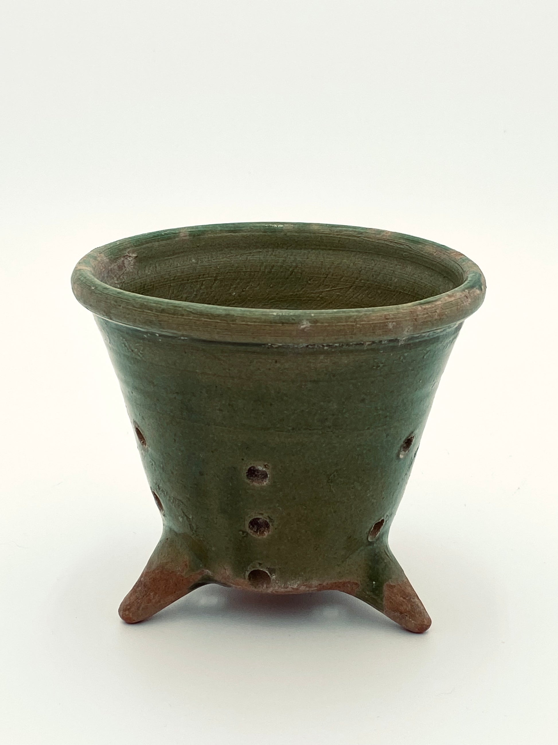 Deze oude, handgemaakte aardewerken mal werd oorspronkelijk gebruikt om geitenkaas mee te maken. Het vervaagde groen en sporen van gebruik geven deze 'égouttoir' op pootjes karakter en is anno nu mooi te gebruiken als waxinelichthouder of bijvoorbeeld op het aanrecht om je afwasborstel of -sponsje te bewaren.