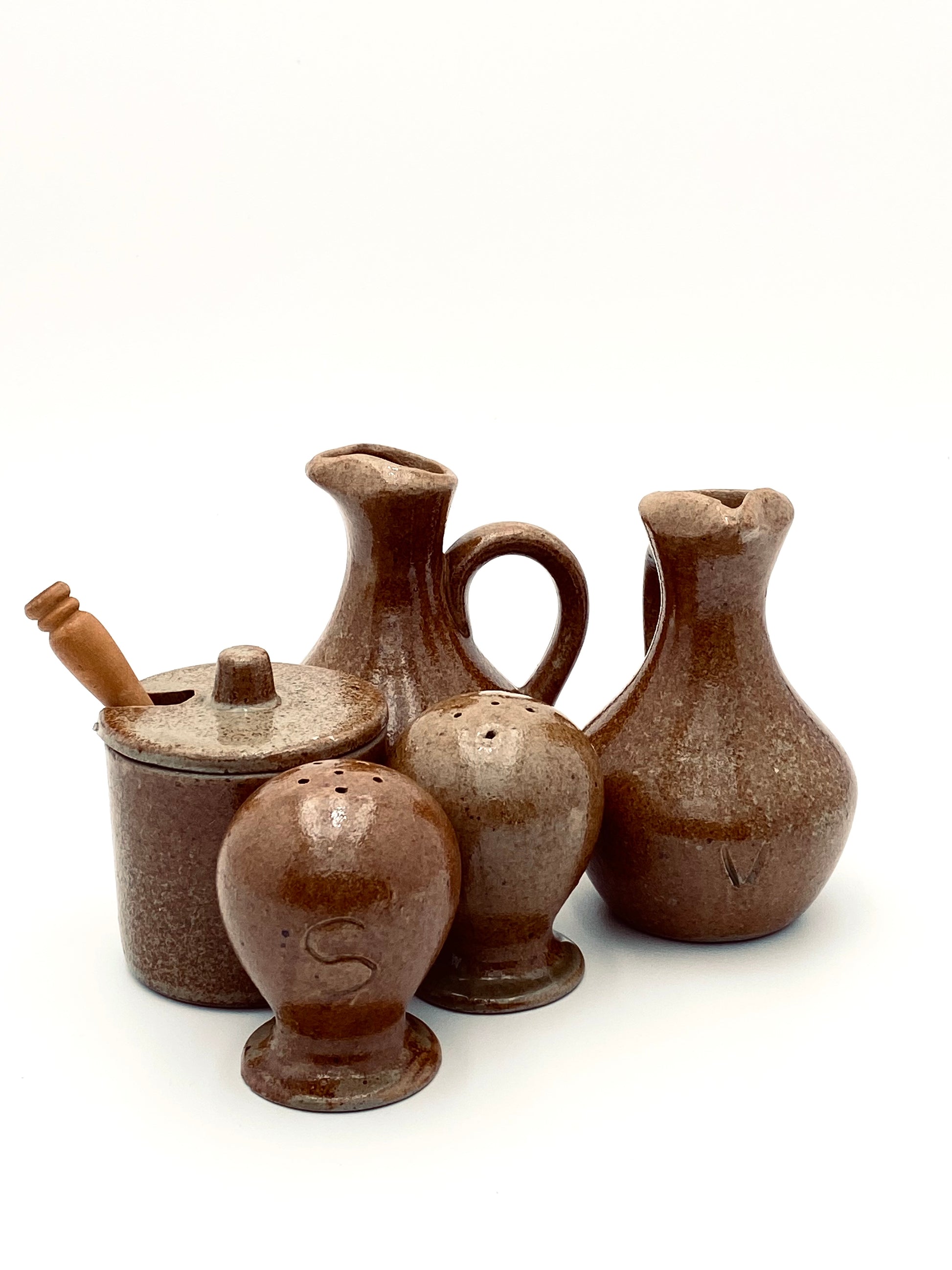 Och, dit 5-delige handgemaakte aardewerken Grès olie, azijn, peper en zout stel is écht een pronkstuk voor op je gedekte tafel. En dat de set nog helemaal compleet is, dat is echt een zeldzaamheid.