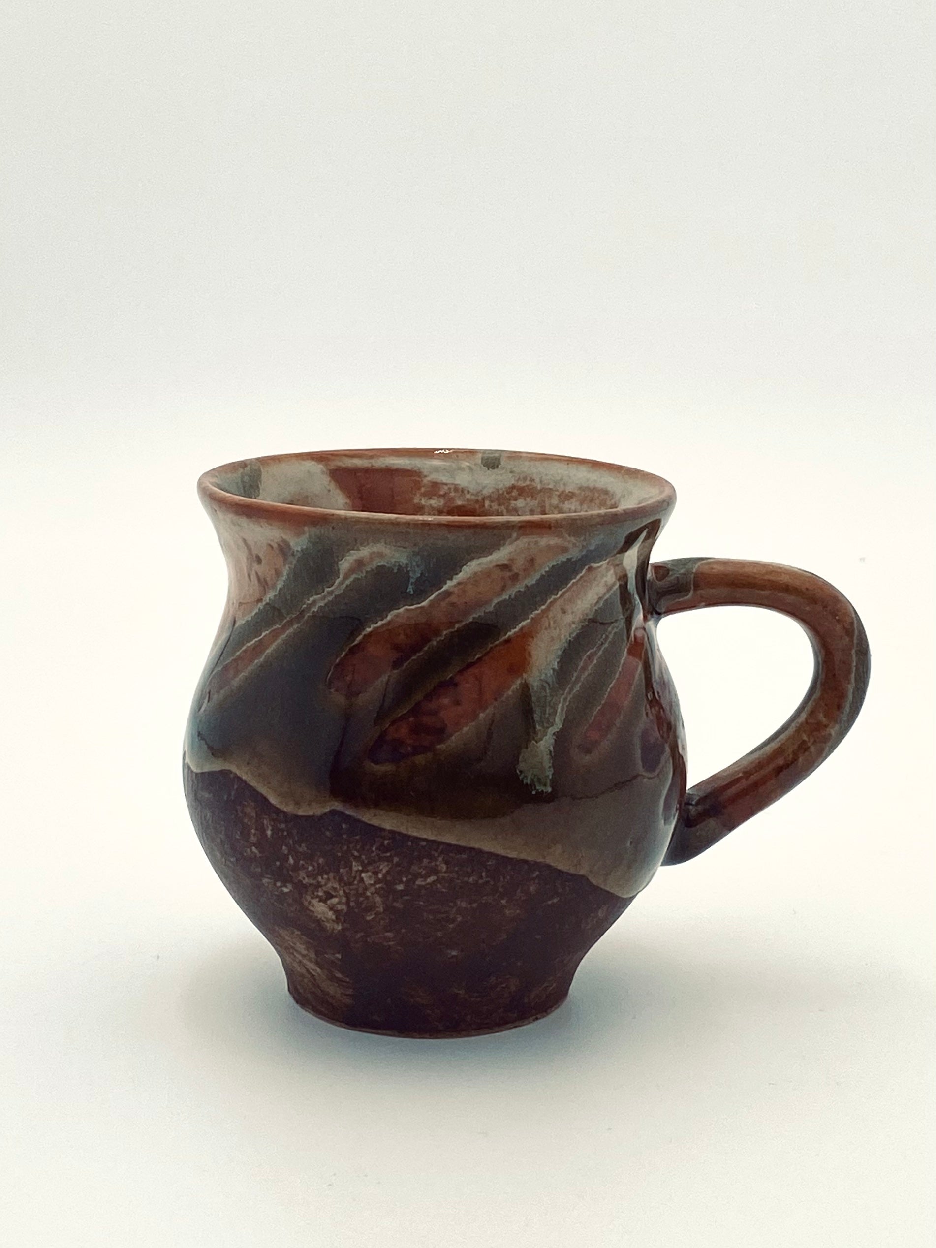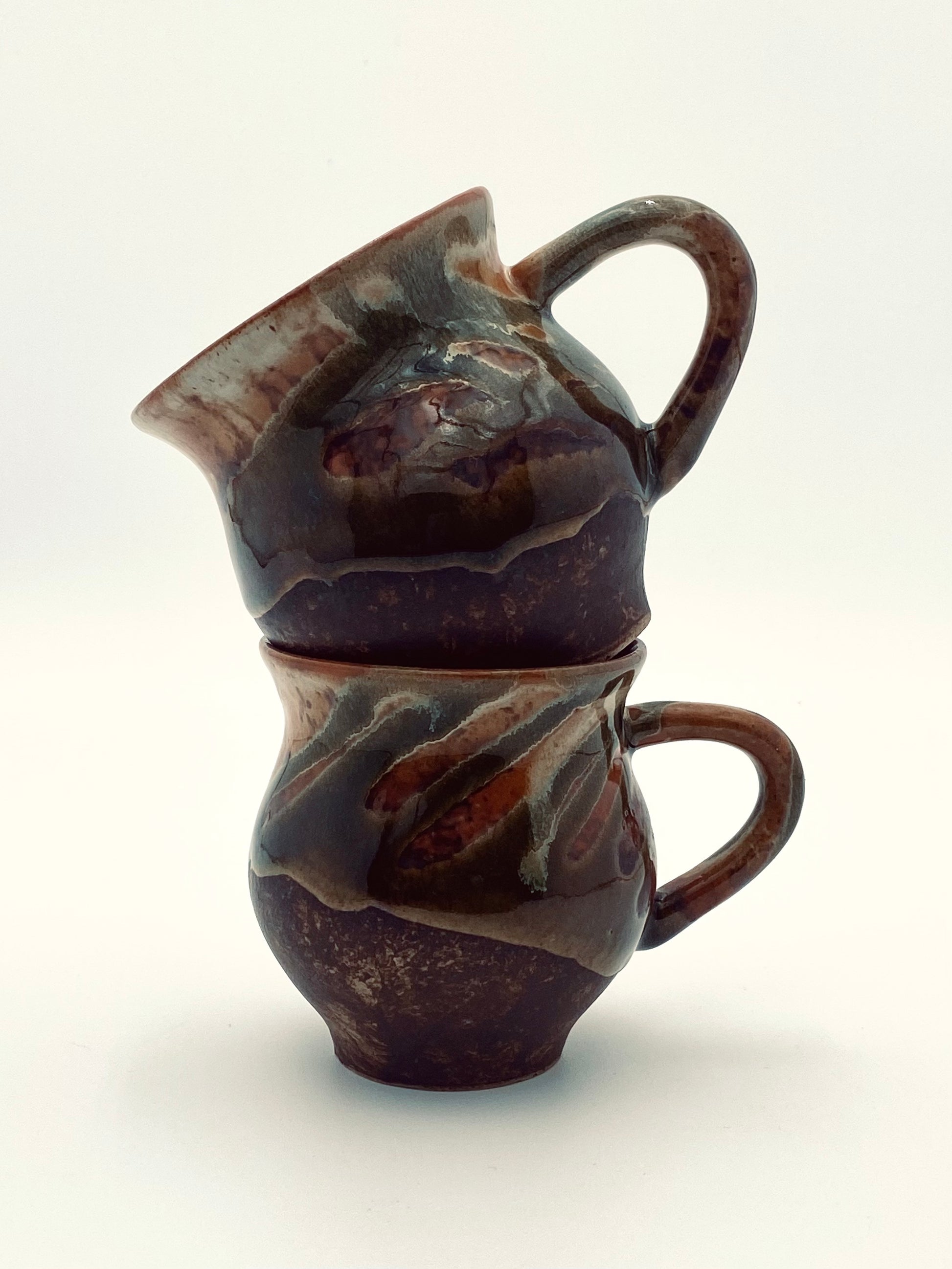 Van sommige dingen gaat ons hart gewoon tijdens het schatzoeken een beetje sneller kloppen. Vooral als we mooie handgemaakte, keramieken bekers tegenkomen uit een klein keramiek atelier, zoals deze met een olijfgroene en bruine glazuur laag. De bekers worden als duo verkocht en hebben een hoogte van 8 cm.