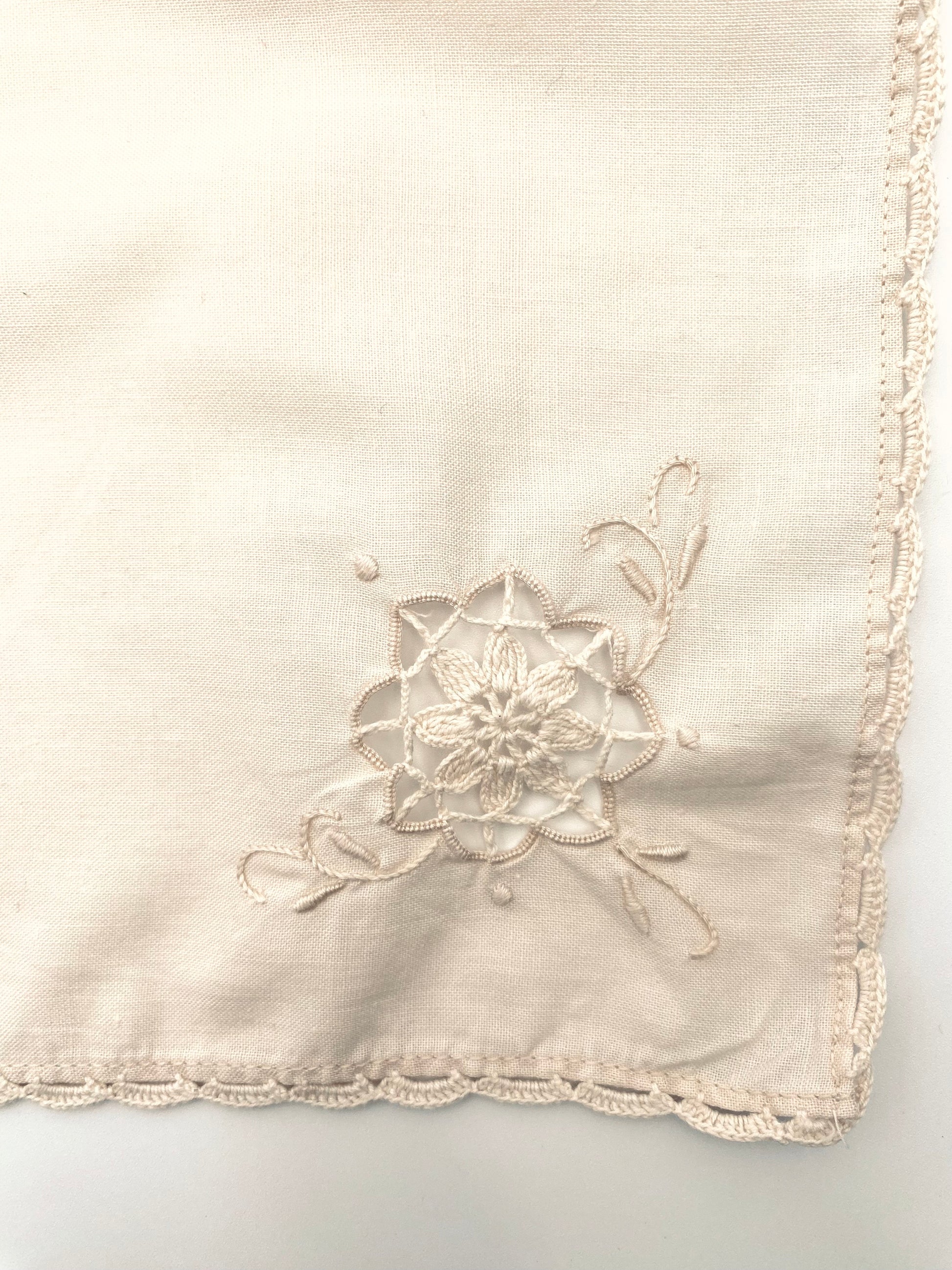 Mooie servetten zijn echt de puntjes op de 'i' als je de tafel dekt. Dus, hop weg met die keukenrol of papieren exemplaren. Laten we afspreken dat we dat voortaan altijd zo doen. Dus met echte servetten en niet alleen op zon- en feestdagen. Bijvoorbeeld met deze oude, handgemaakte servetten van zacht linnen met een gehaakt randje en een grote opengewerkte bloem.